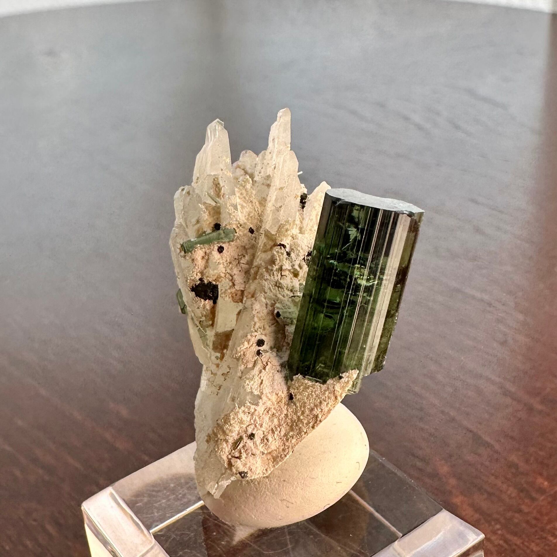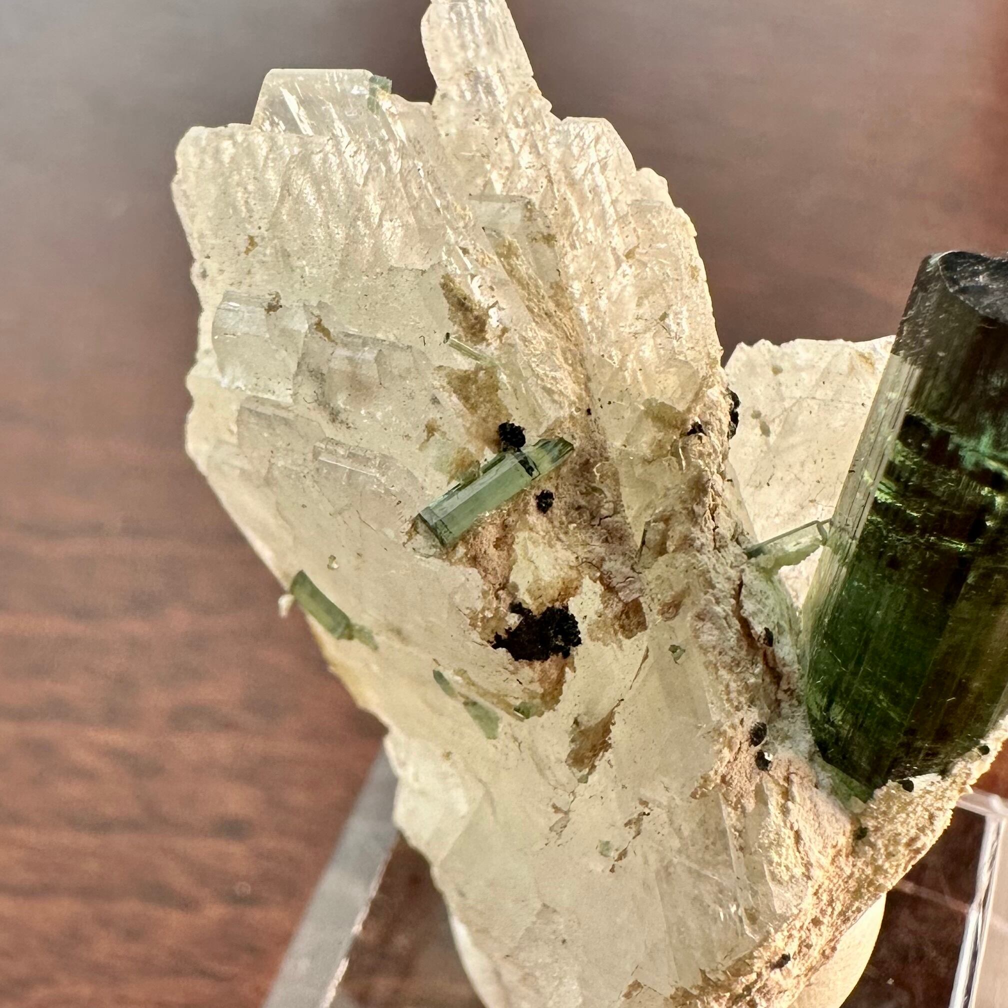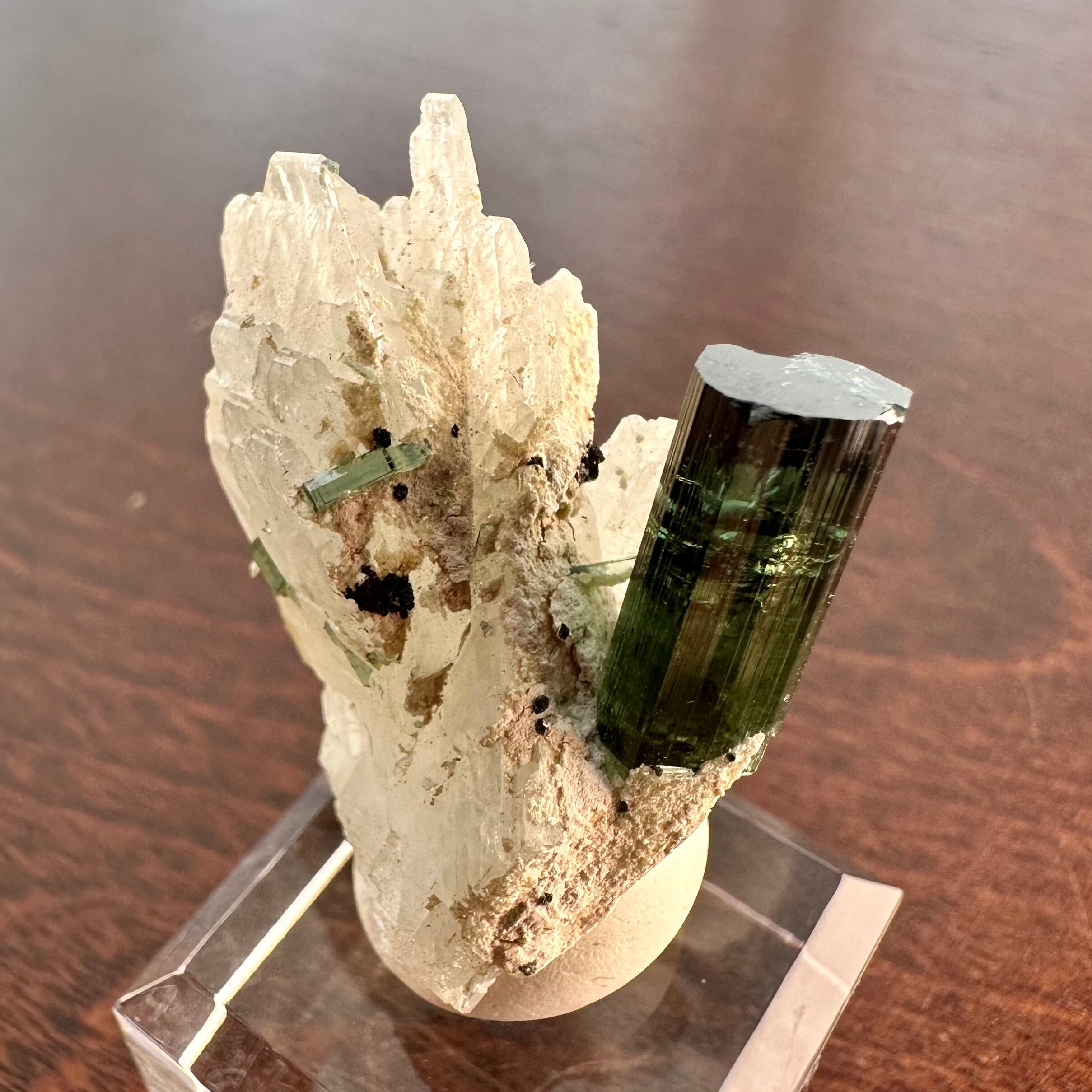 羽のようなクリーブランダイトの結晶とエルバイトとの結晶具合が非常に美しく、全体的な状態の良さと共にそのバランスが魅力的な標本です。