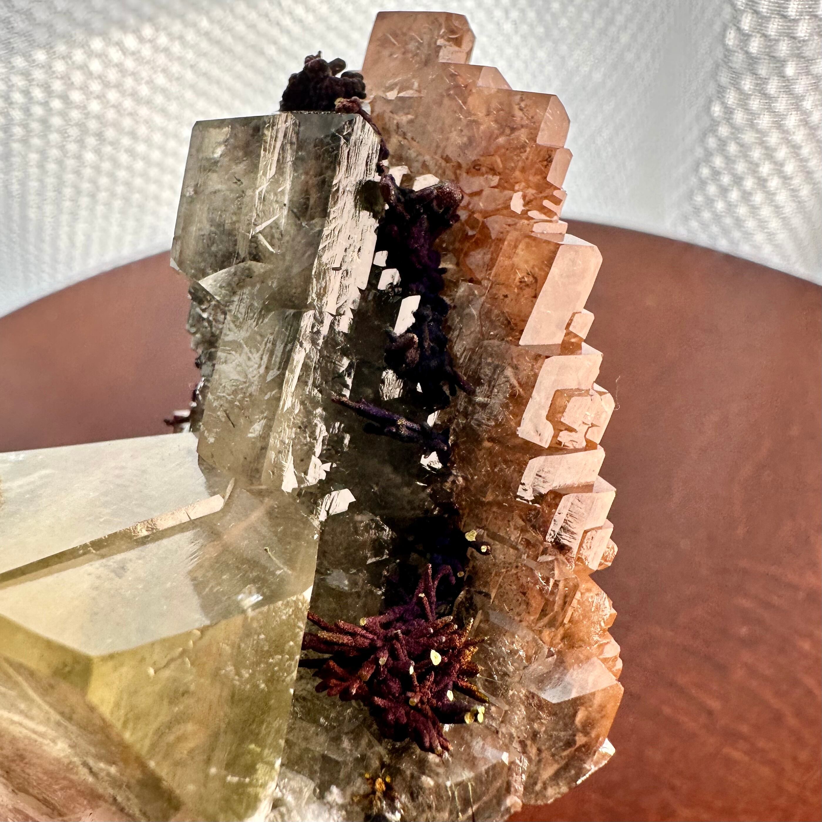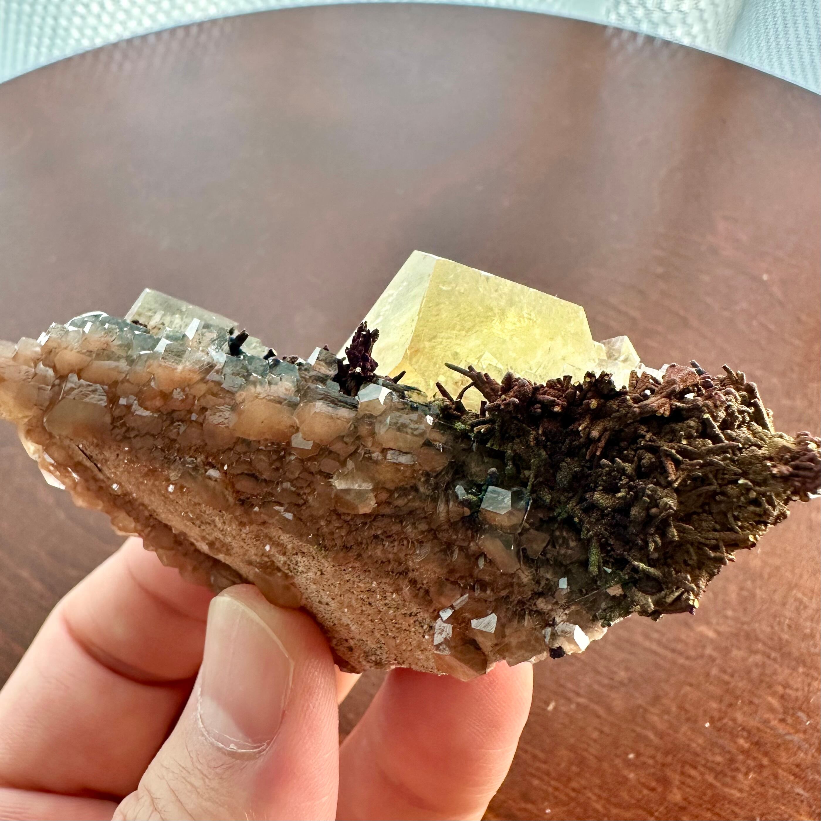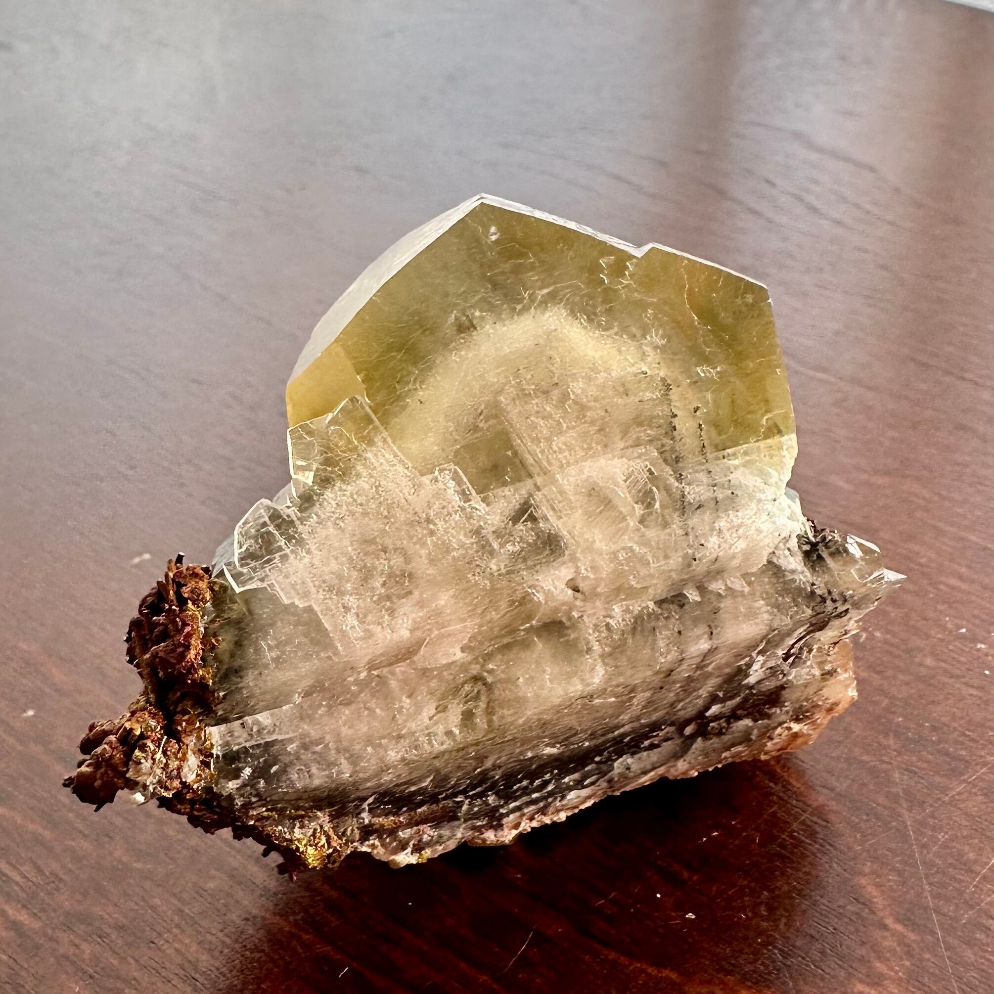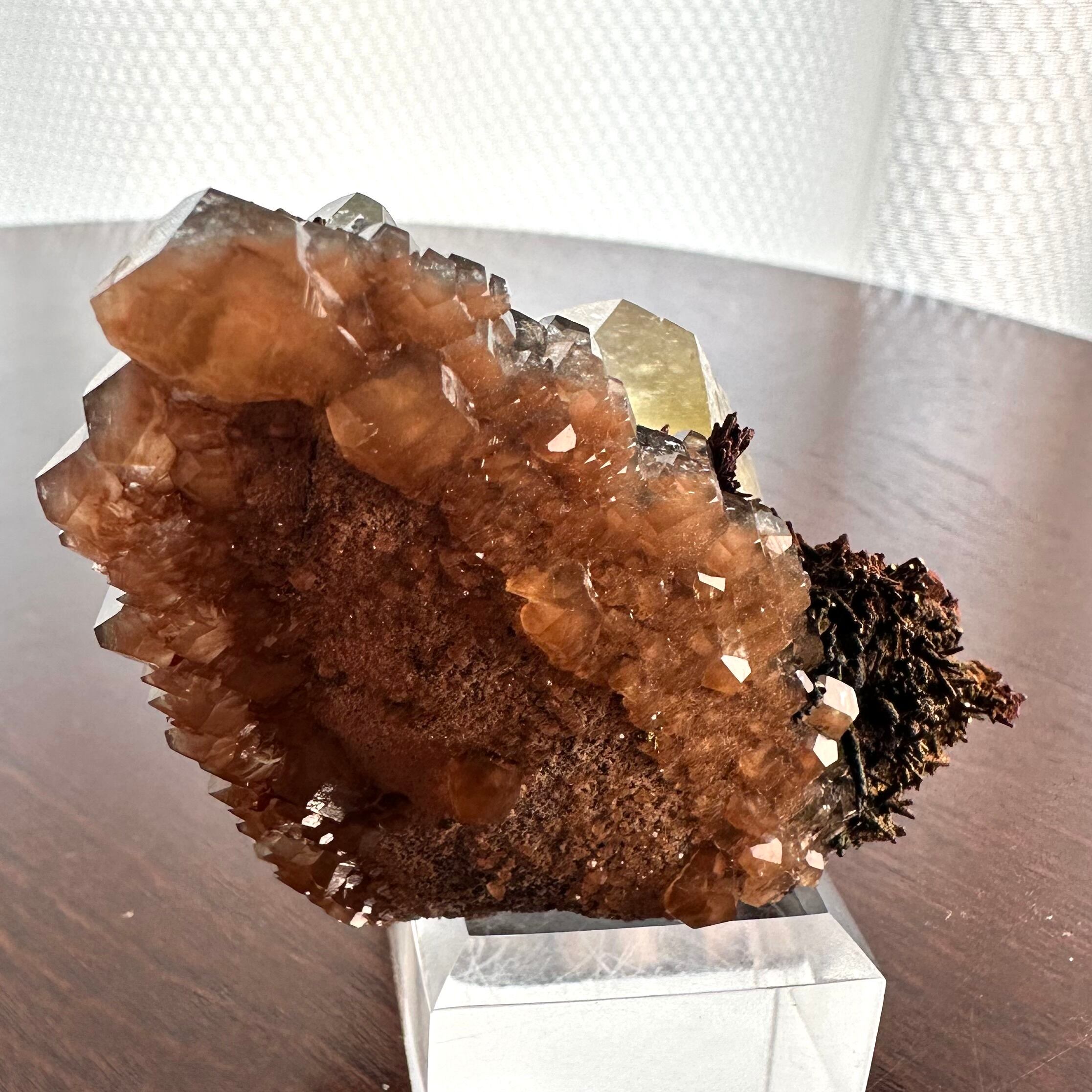 メインのように結晶していることもあってイエローのカルサイトと表記しましたが、標本を縁取りするようなブラウンやオレンジの部分もカルサイトで、カルサイトだけでも様々な景色が楽しめます。