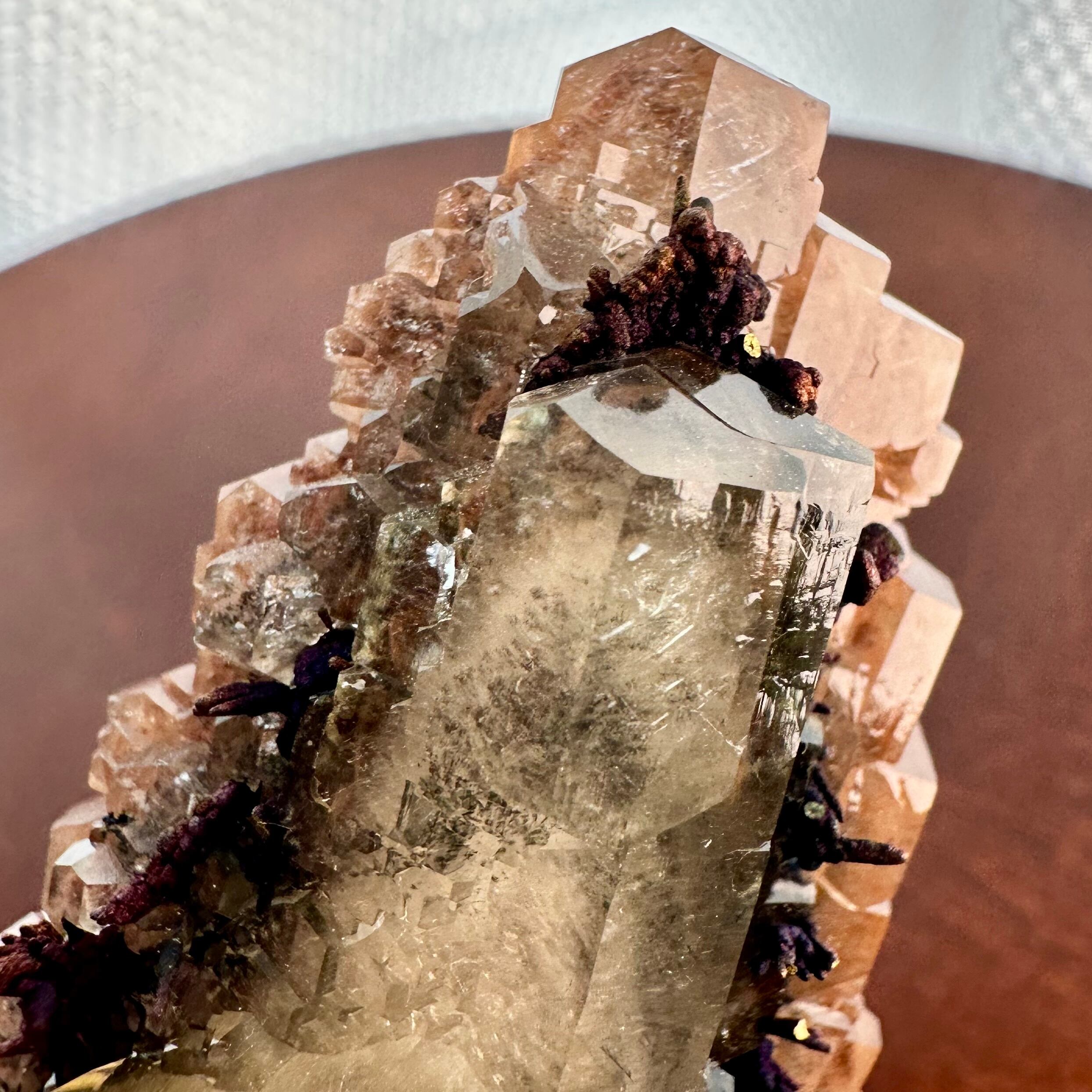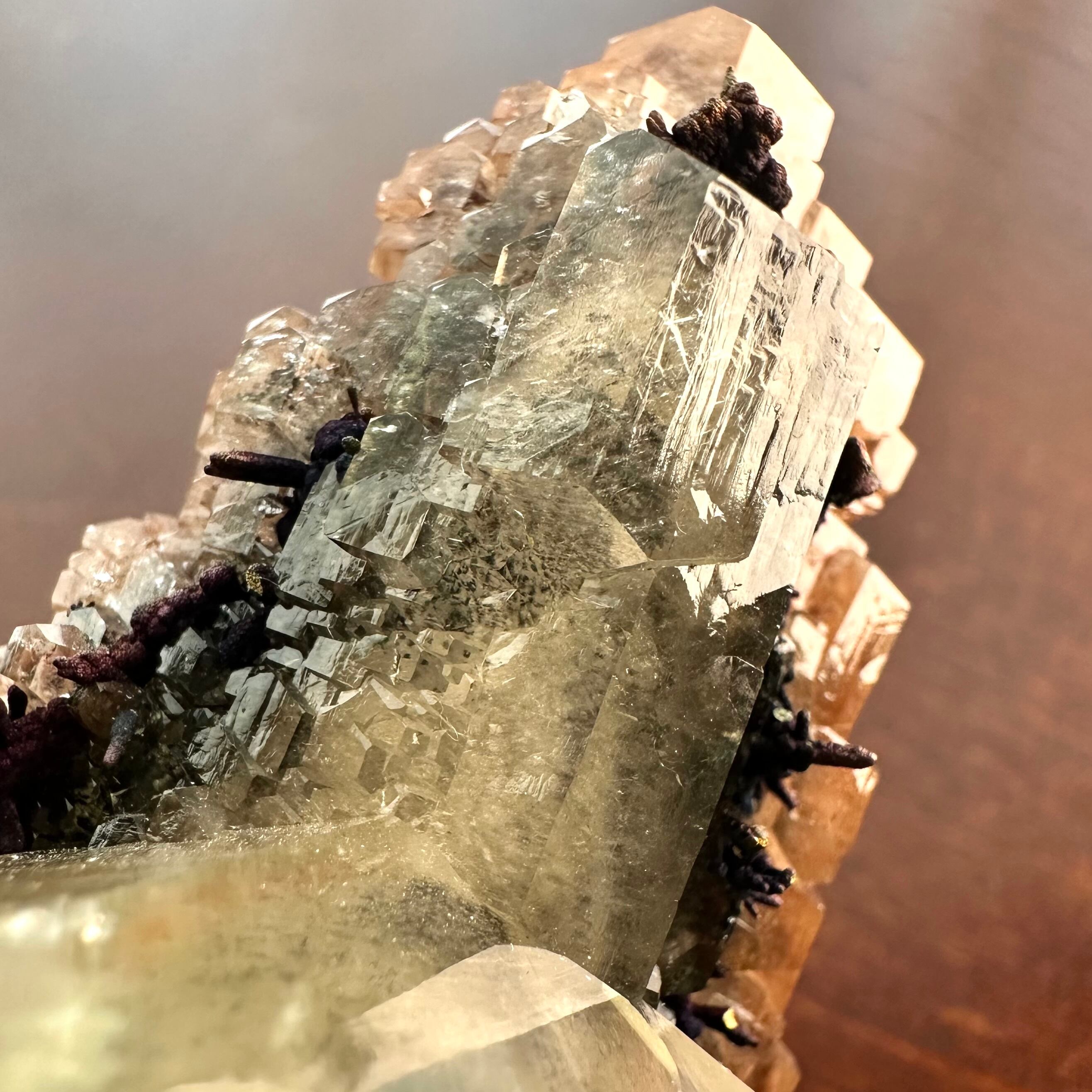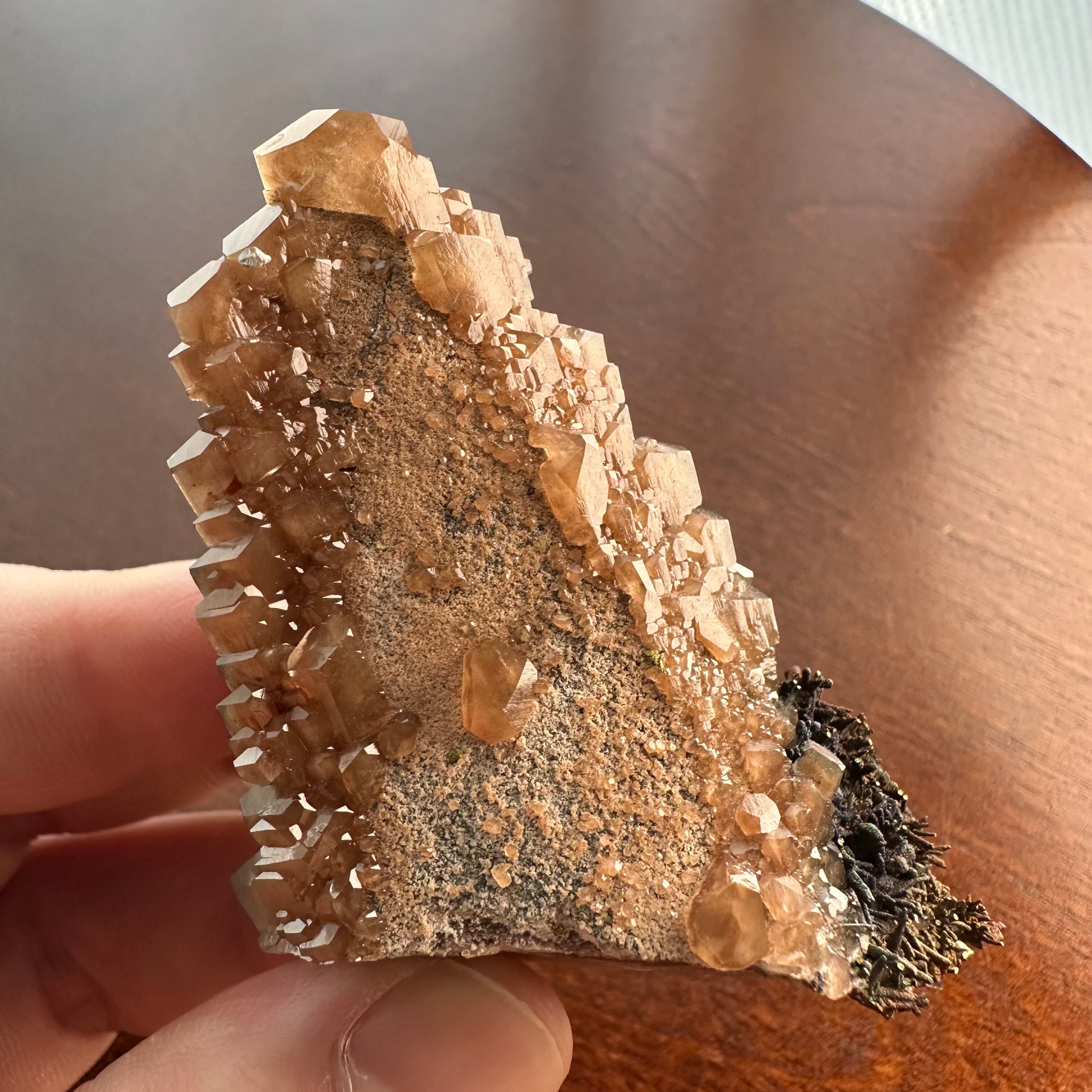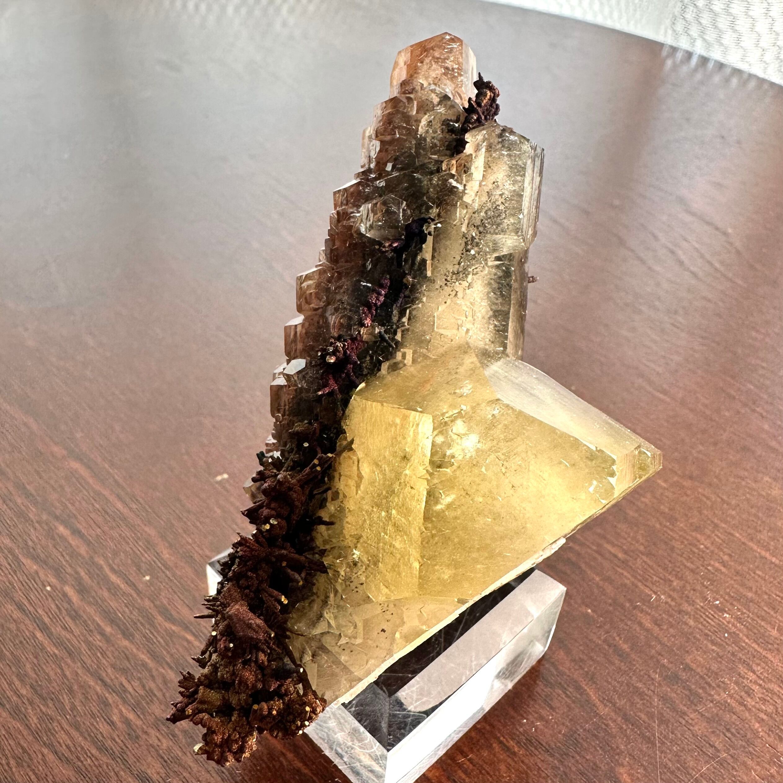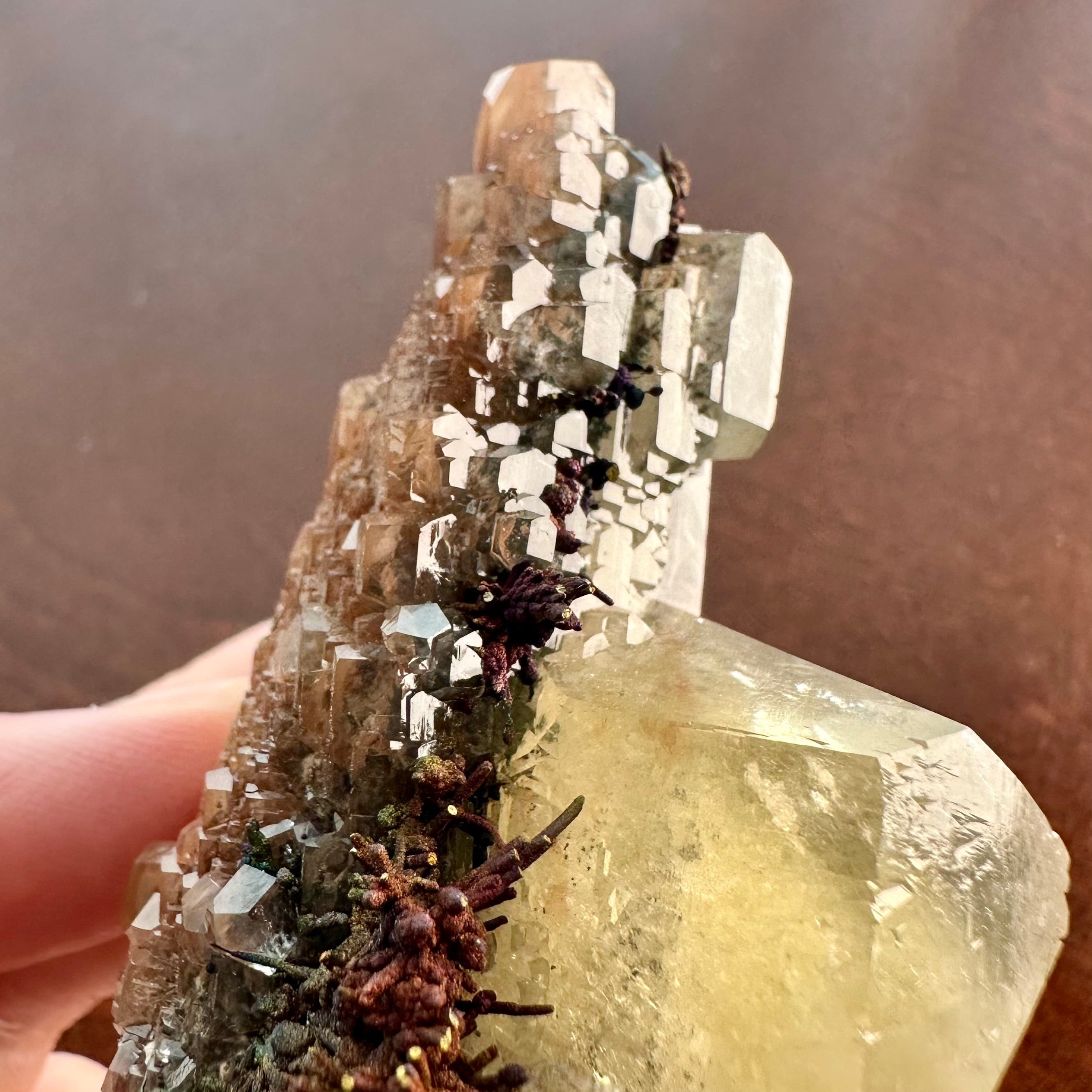 メインのように結晶していることもあってイエローのカルサイトと表記しましたが、標本を縁取りするようなブラウンやオレンジの部分もカルサイトで、カルサイトだけでも様々な景色が楽しめます。