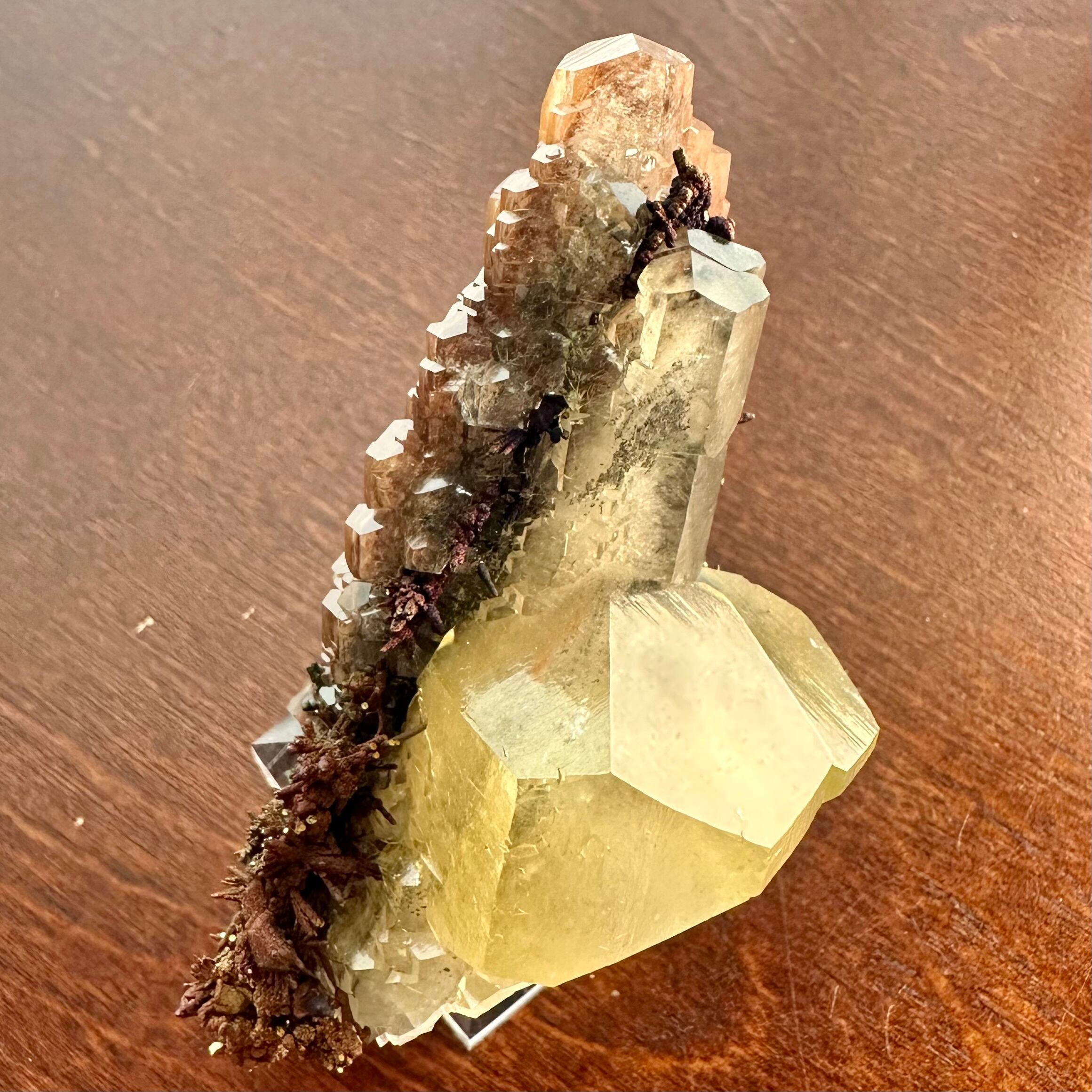 イエローのカルサイトと金属的なツヤを残したカルコサイトとのコンビネーション、中国産です。