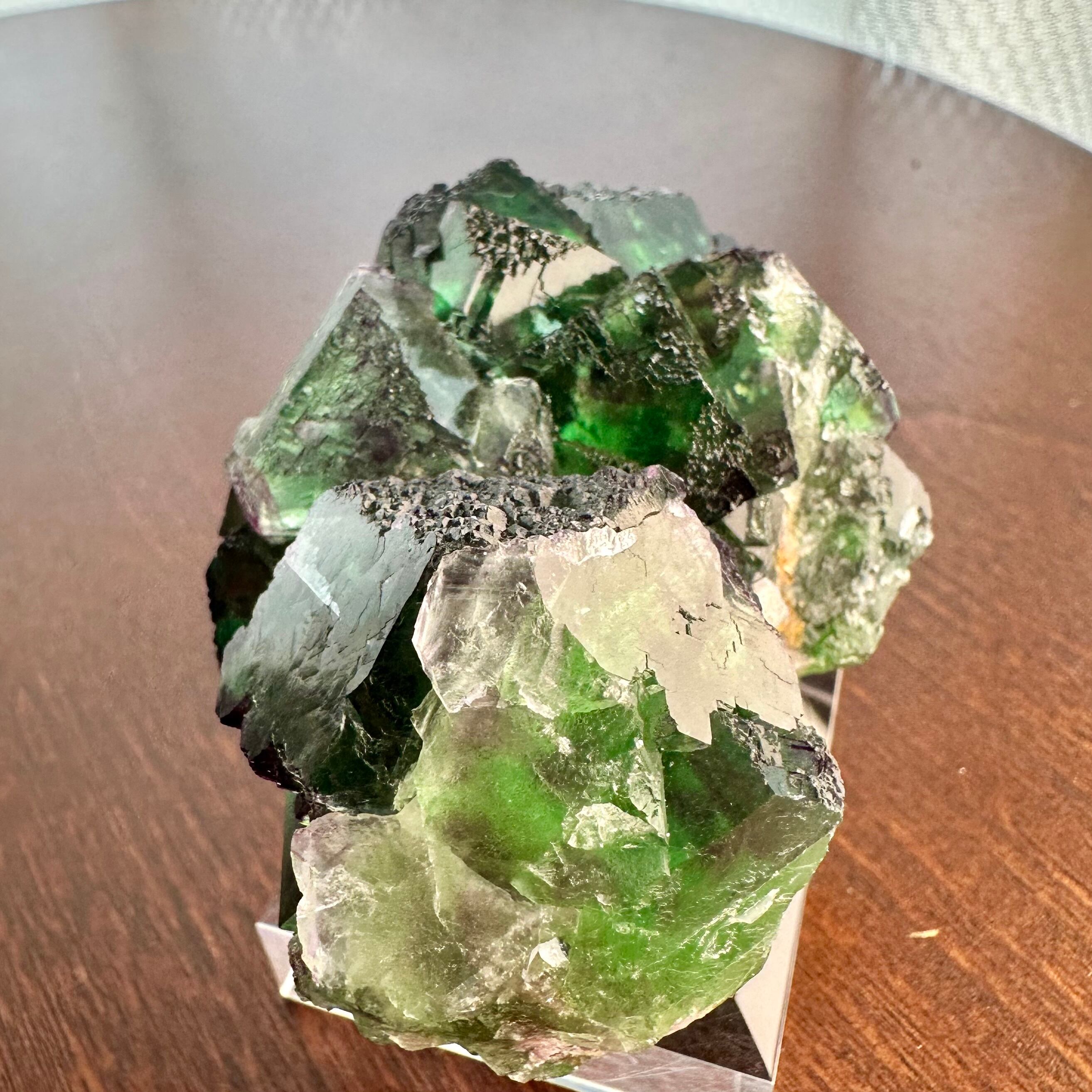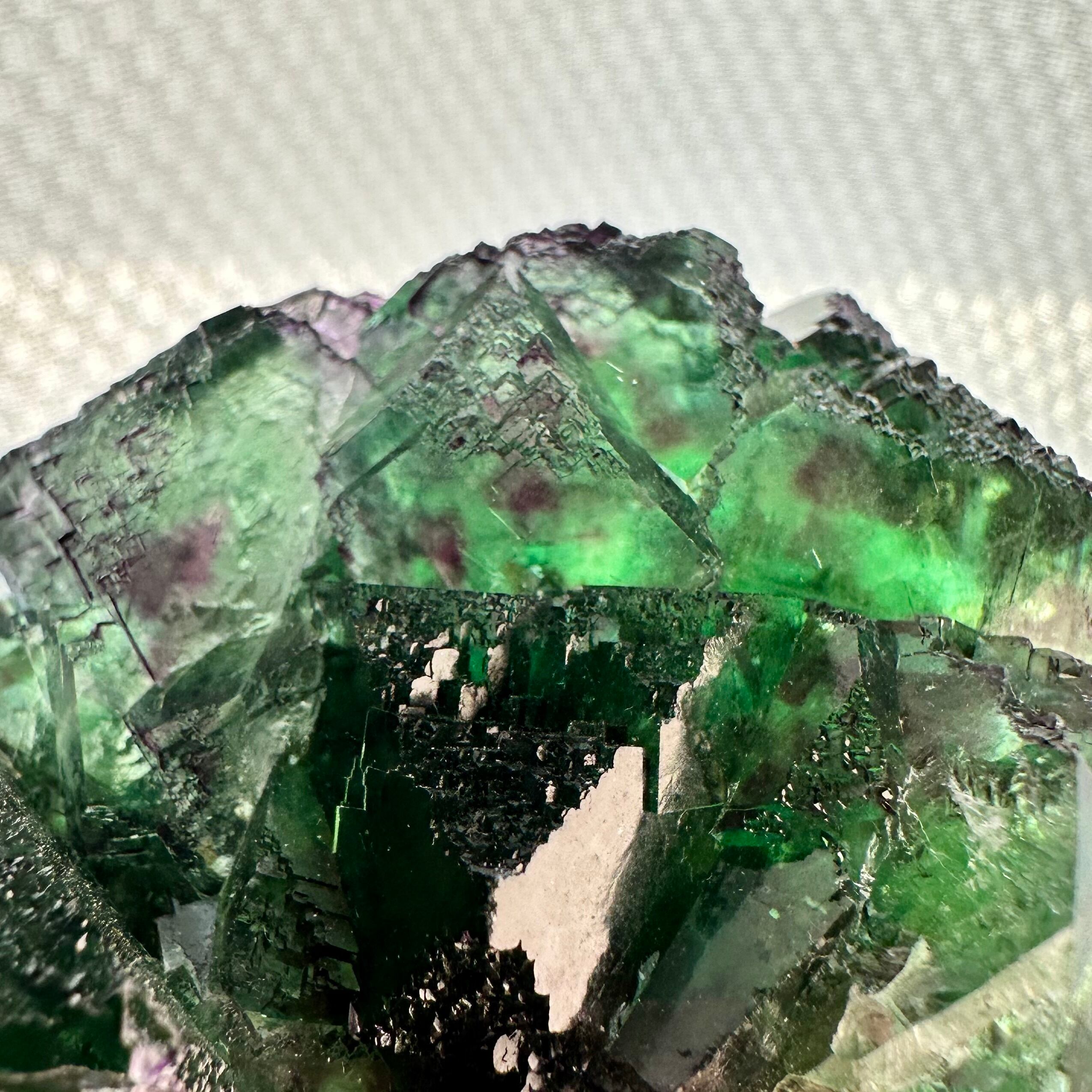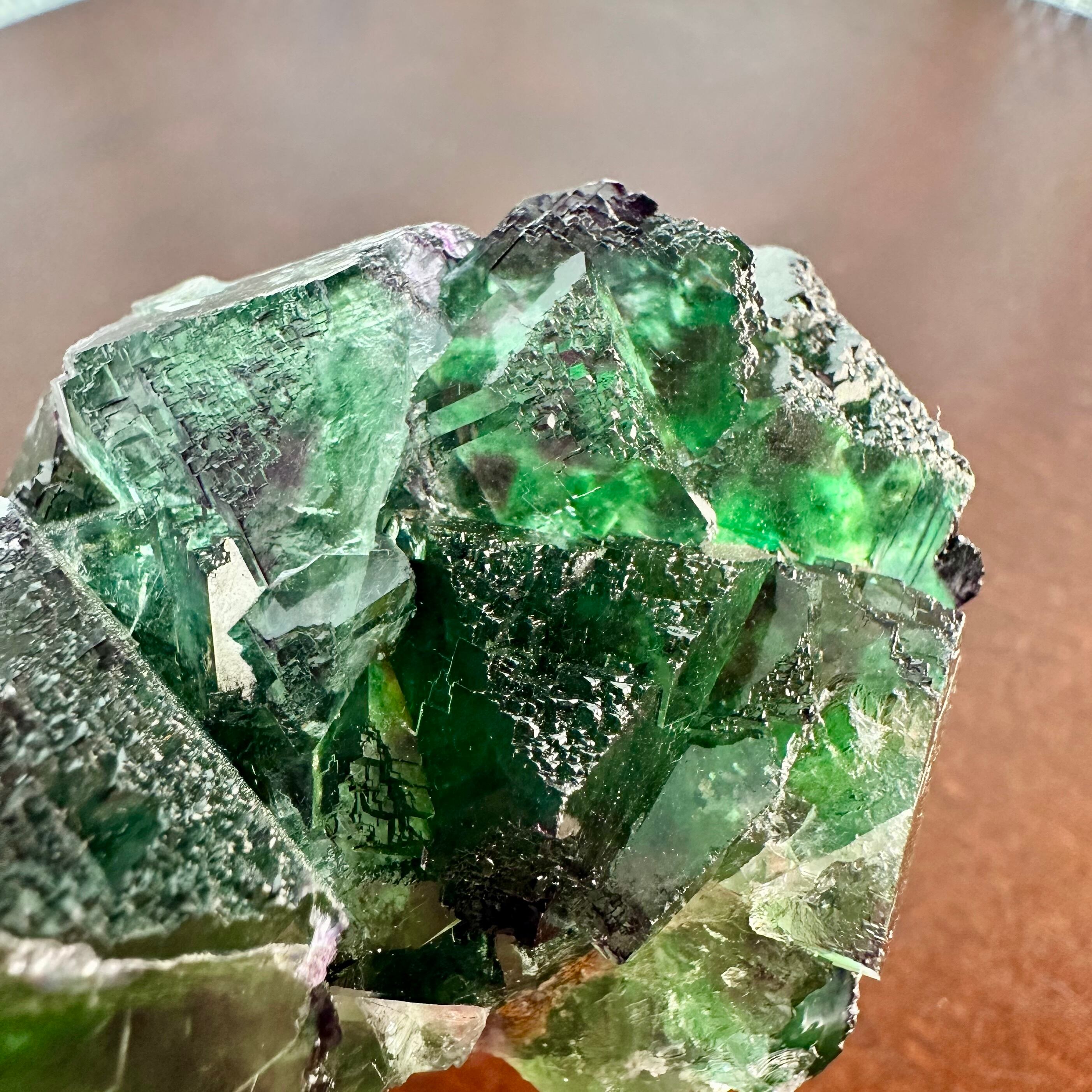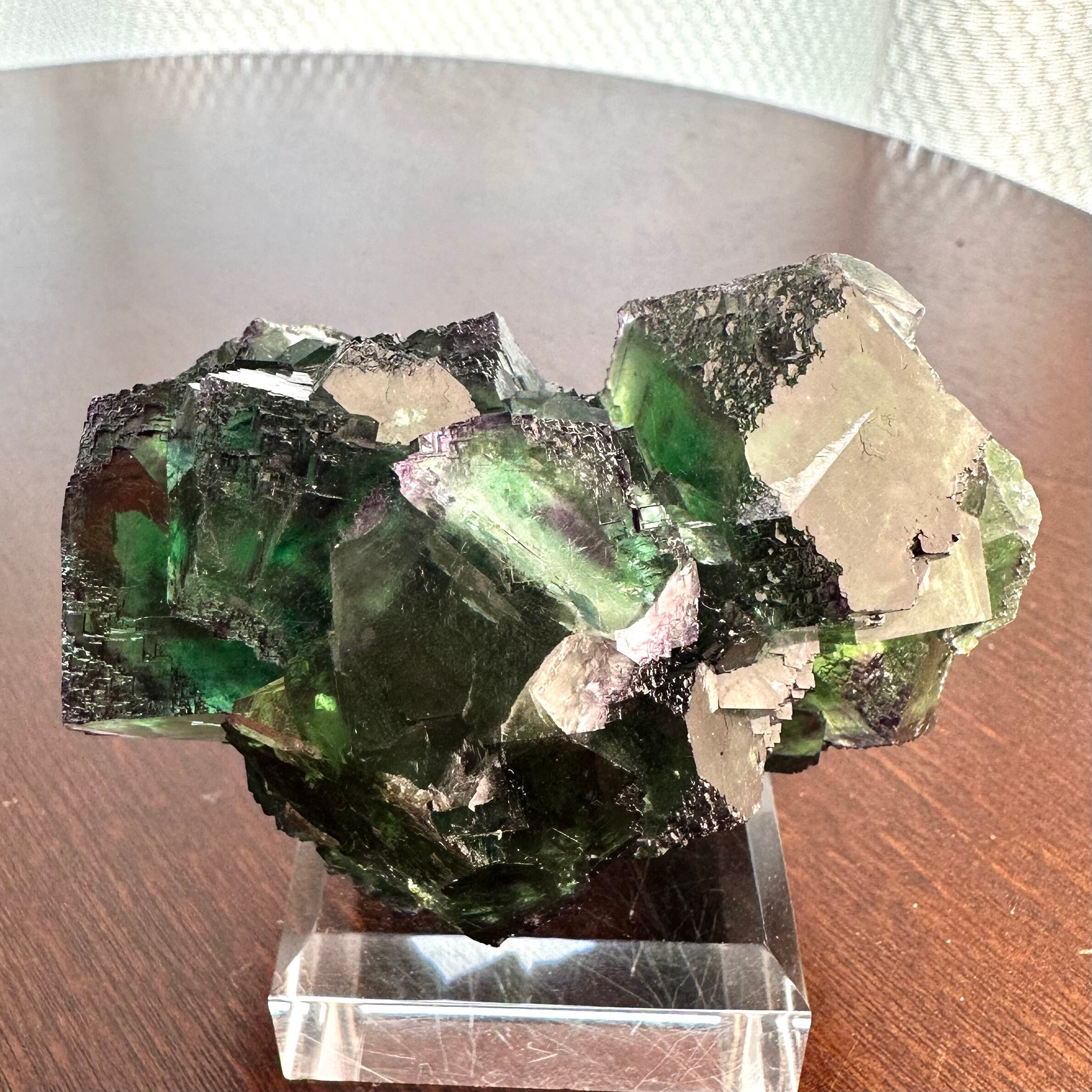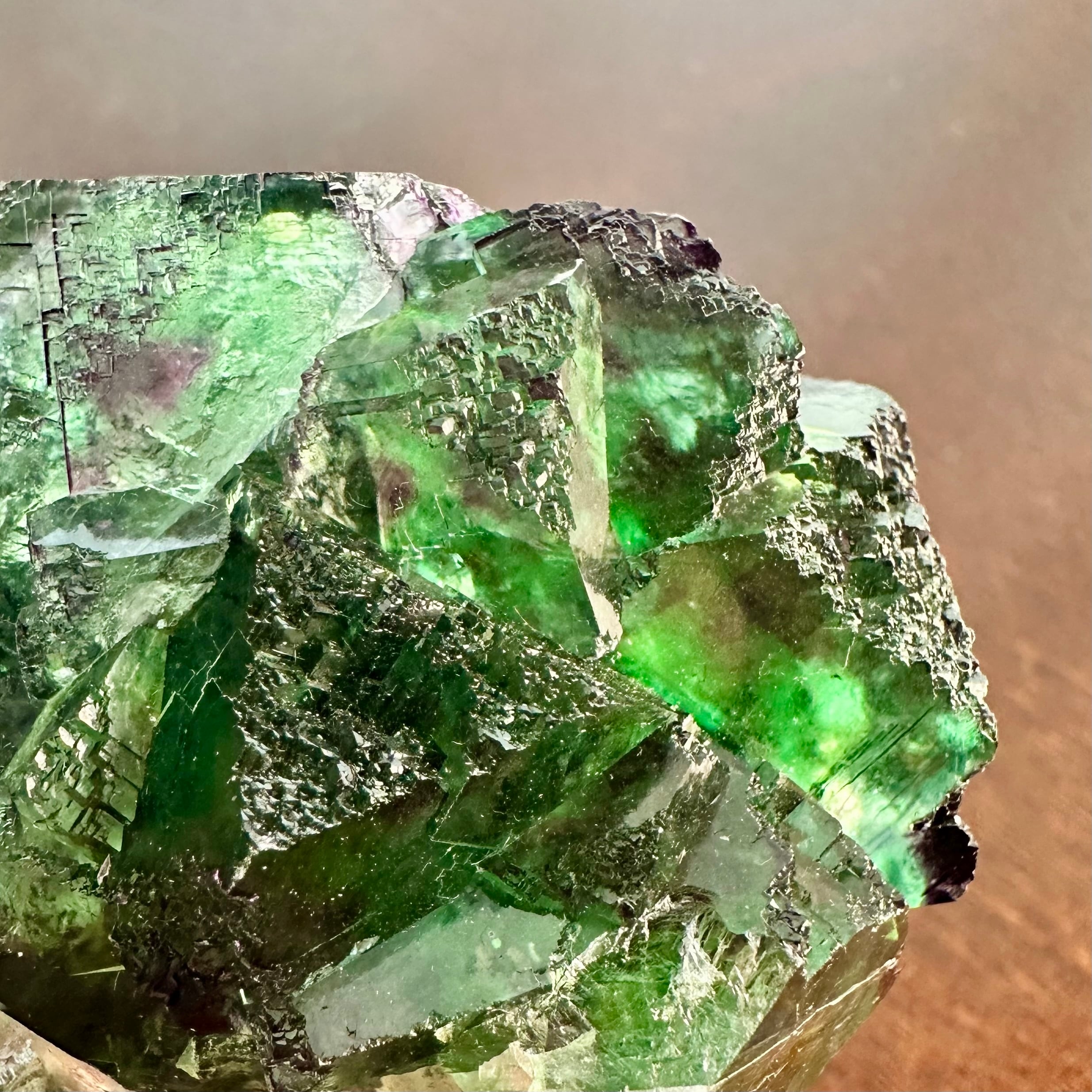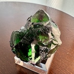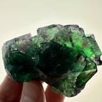 この産地のものとしては若干珍しいガラス光沢を持つ結晶面が多く見られ、透明感やテリが抜群で鮮やかなグリーンの結晶の内部ではパープルの発色やグリーンの濃淡が楽しめます。