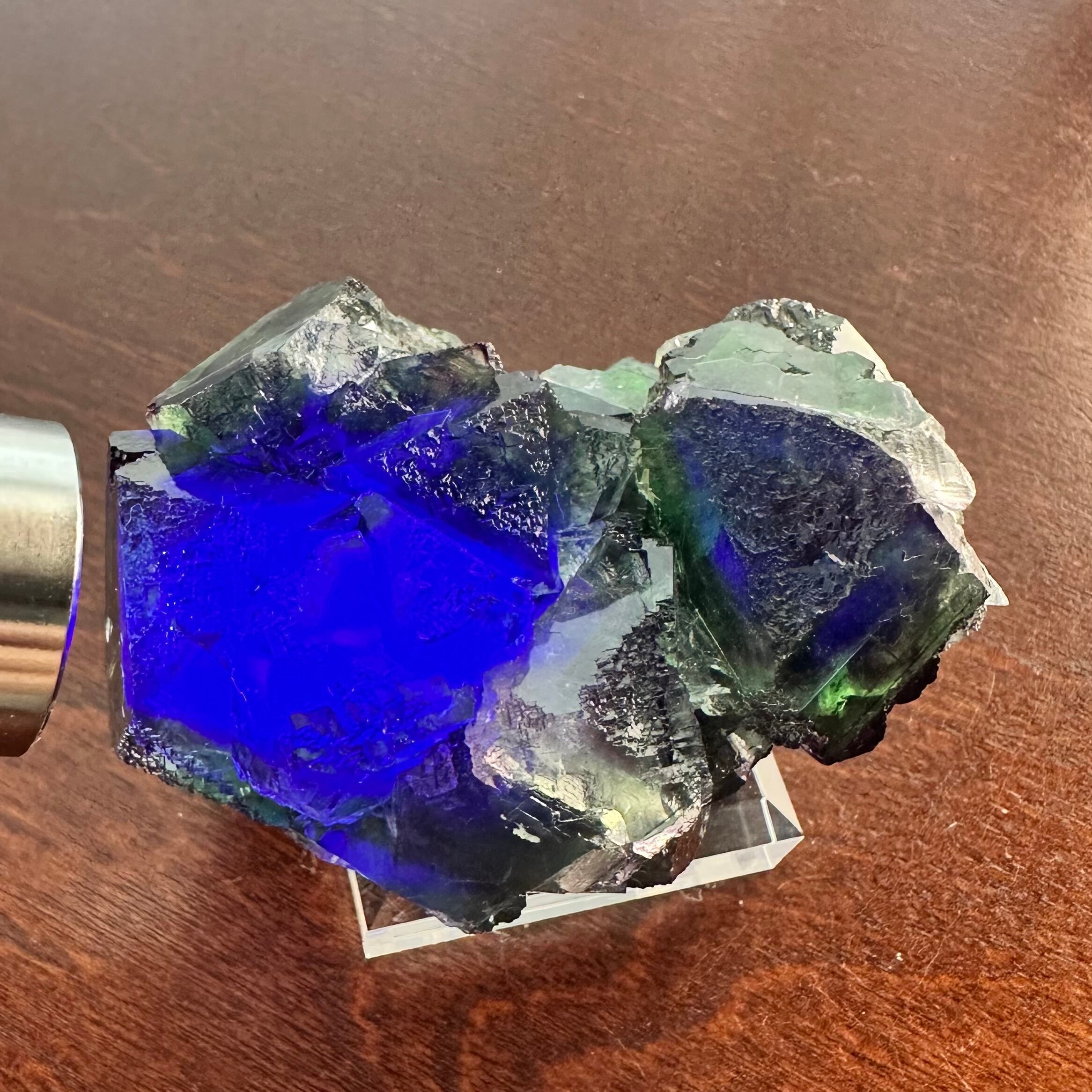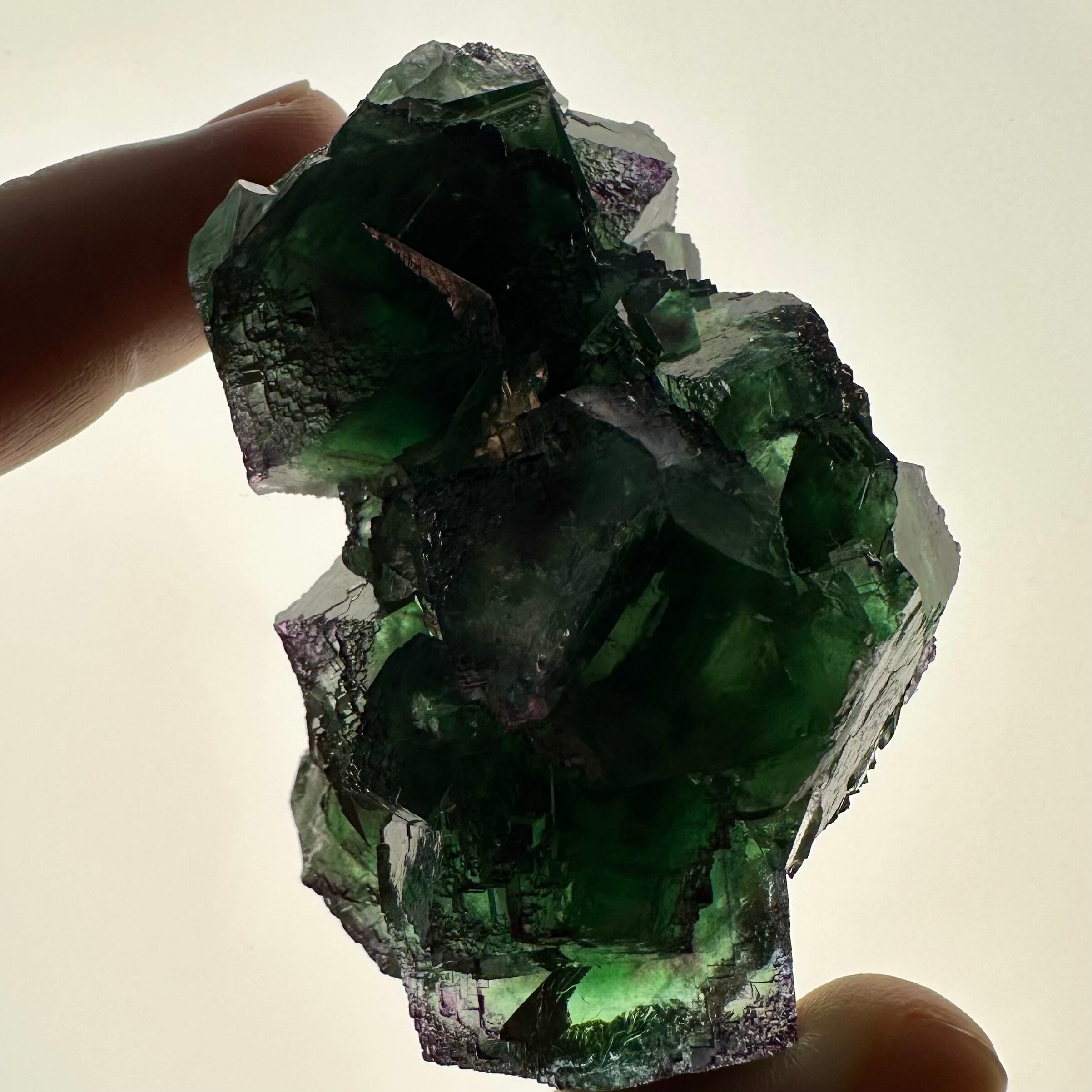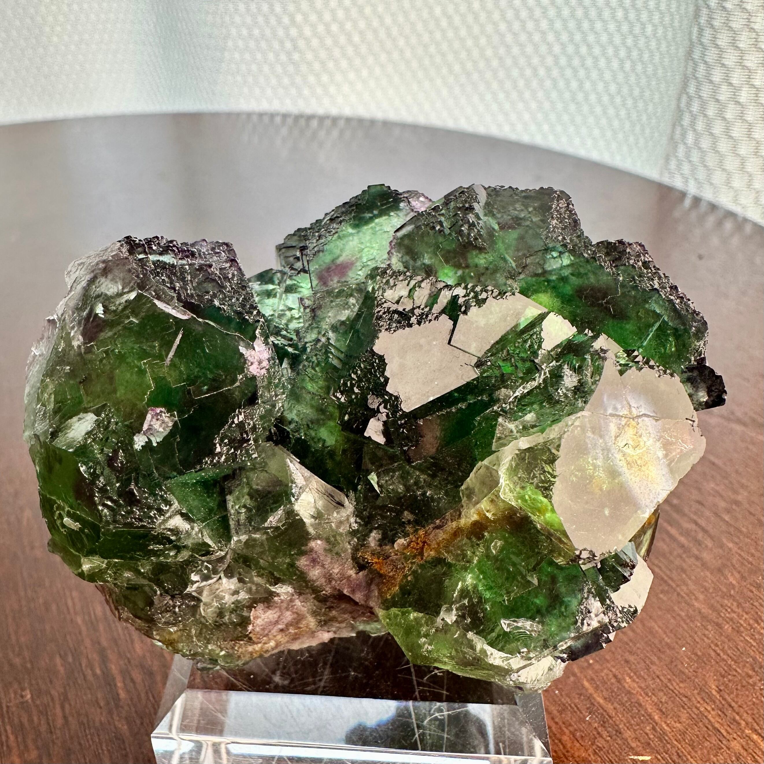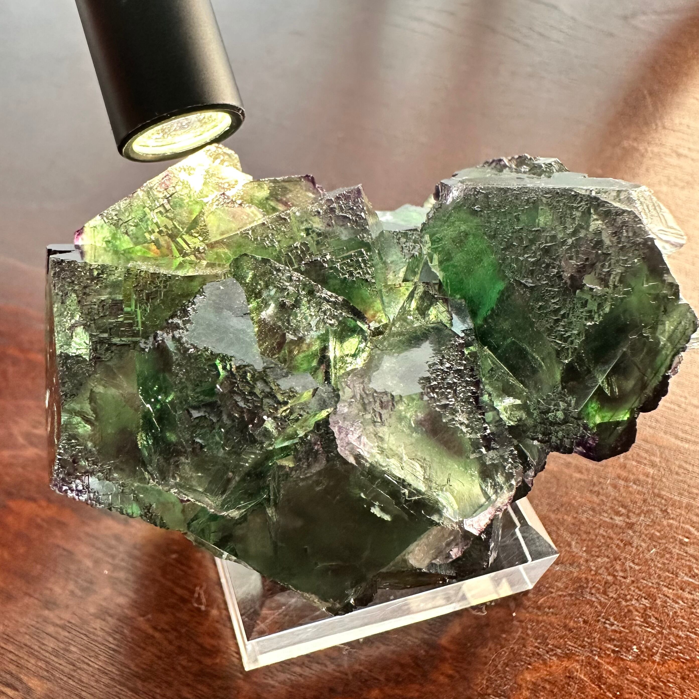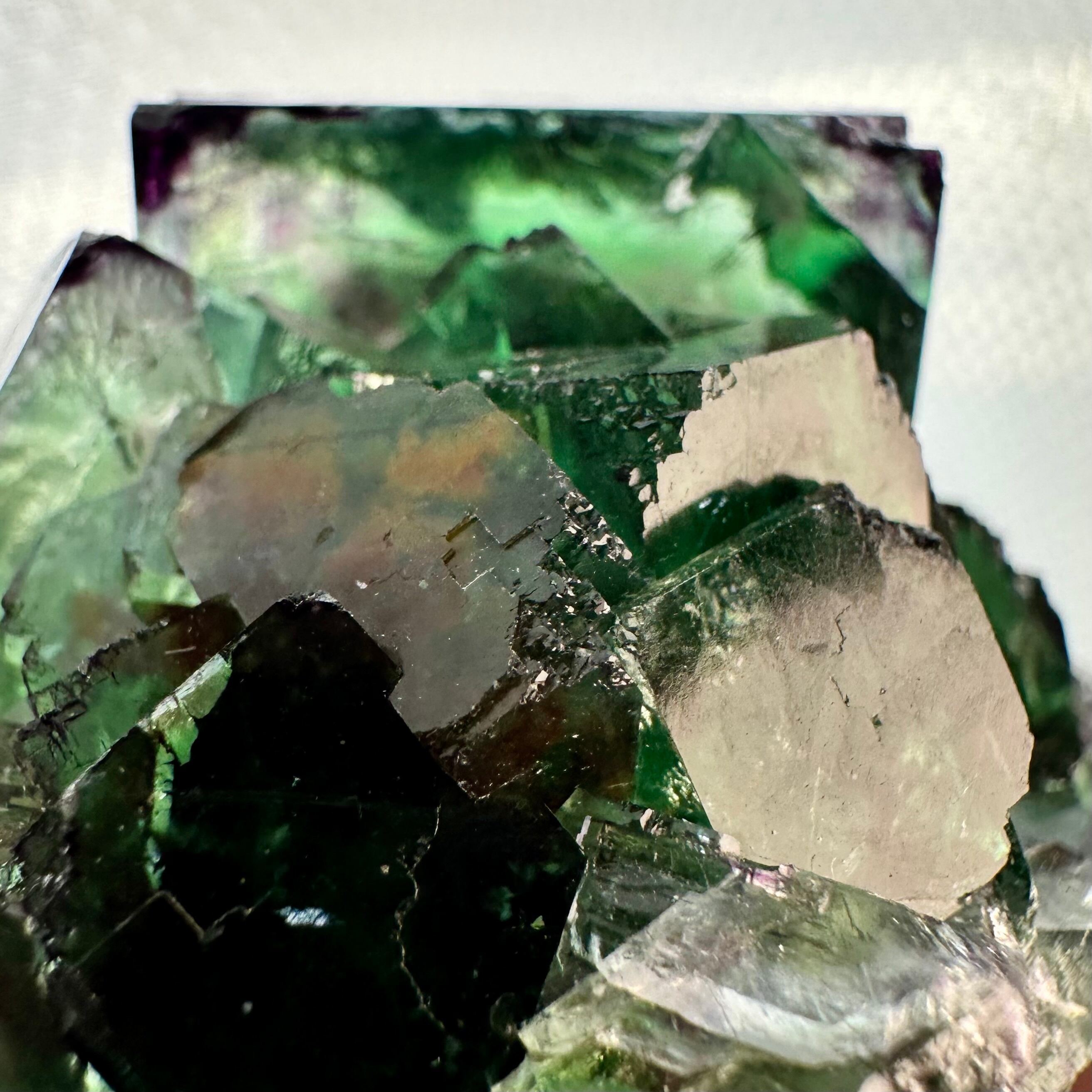 この産地のものとしては若干珍しいガラス光沢を持つ結晶面が多く見られ、透明感やテリが抜群で鮮やかなグリーンの結晶の内部ではパープルの発色やグリーンの濃淡が楽しめます。