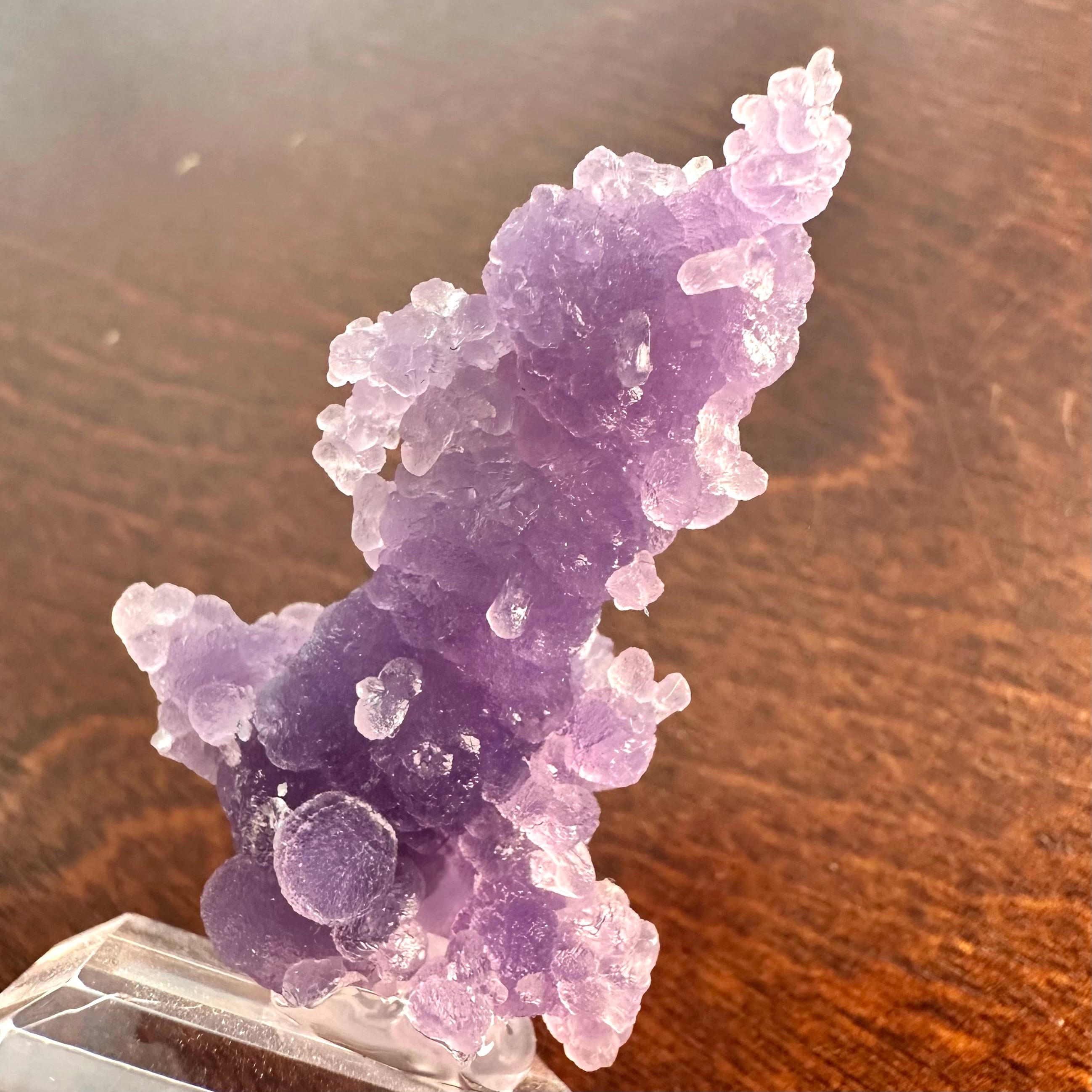 細長くサイズ感のあるクラスター標本で、パープルの発色が非常に良好かつ珍しく透明感もしっかりと感じられる標本です。