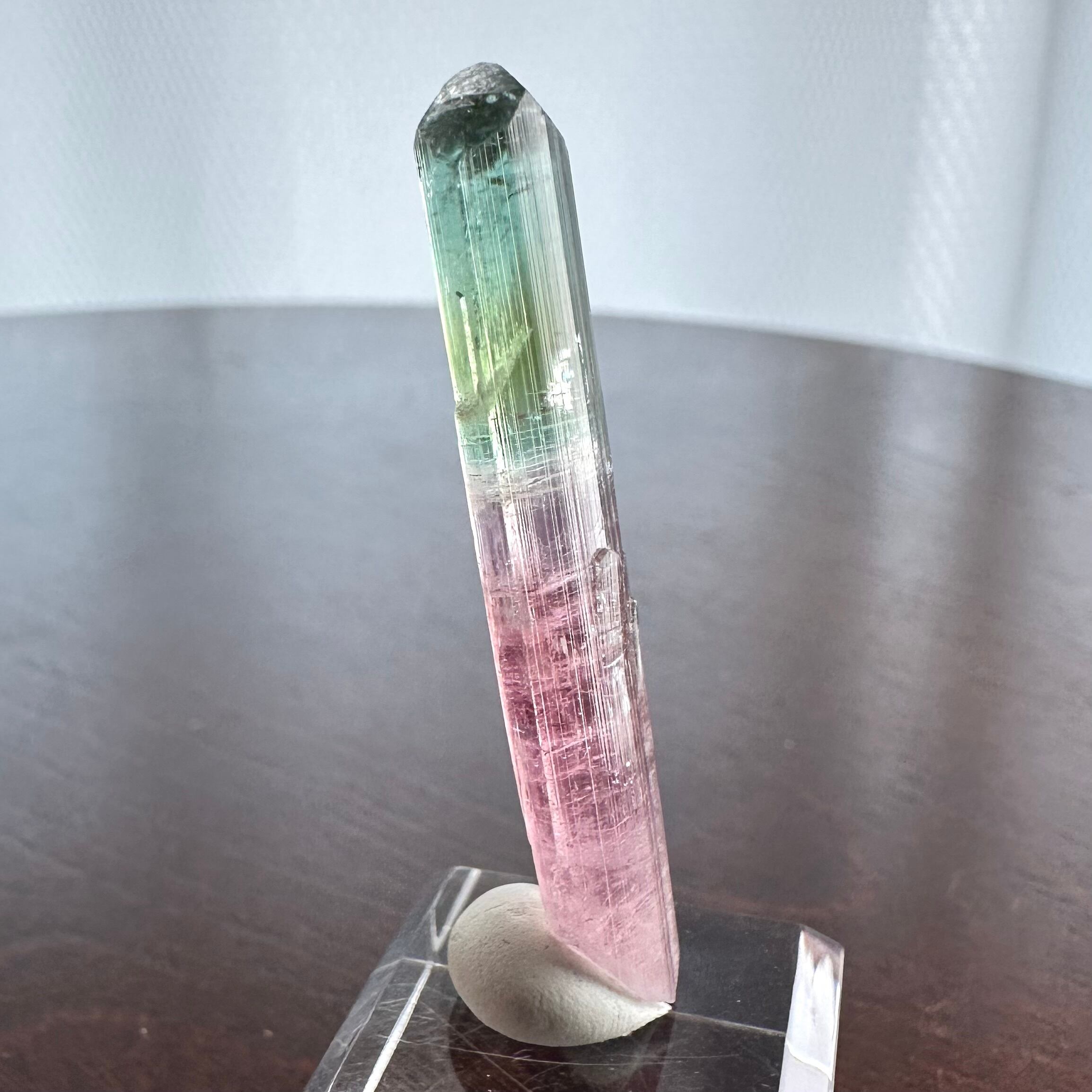 一見するとバイカラーながら、上半分は淡いブルーグリーンの中にグリーンの部分も入り、下半分はピンクのグラデーションのマルチカラートルマリンで、発色や透明感、テリに優れた結晶です。