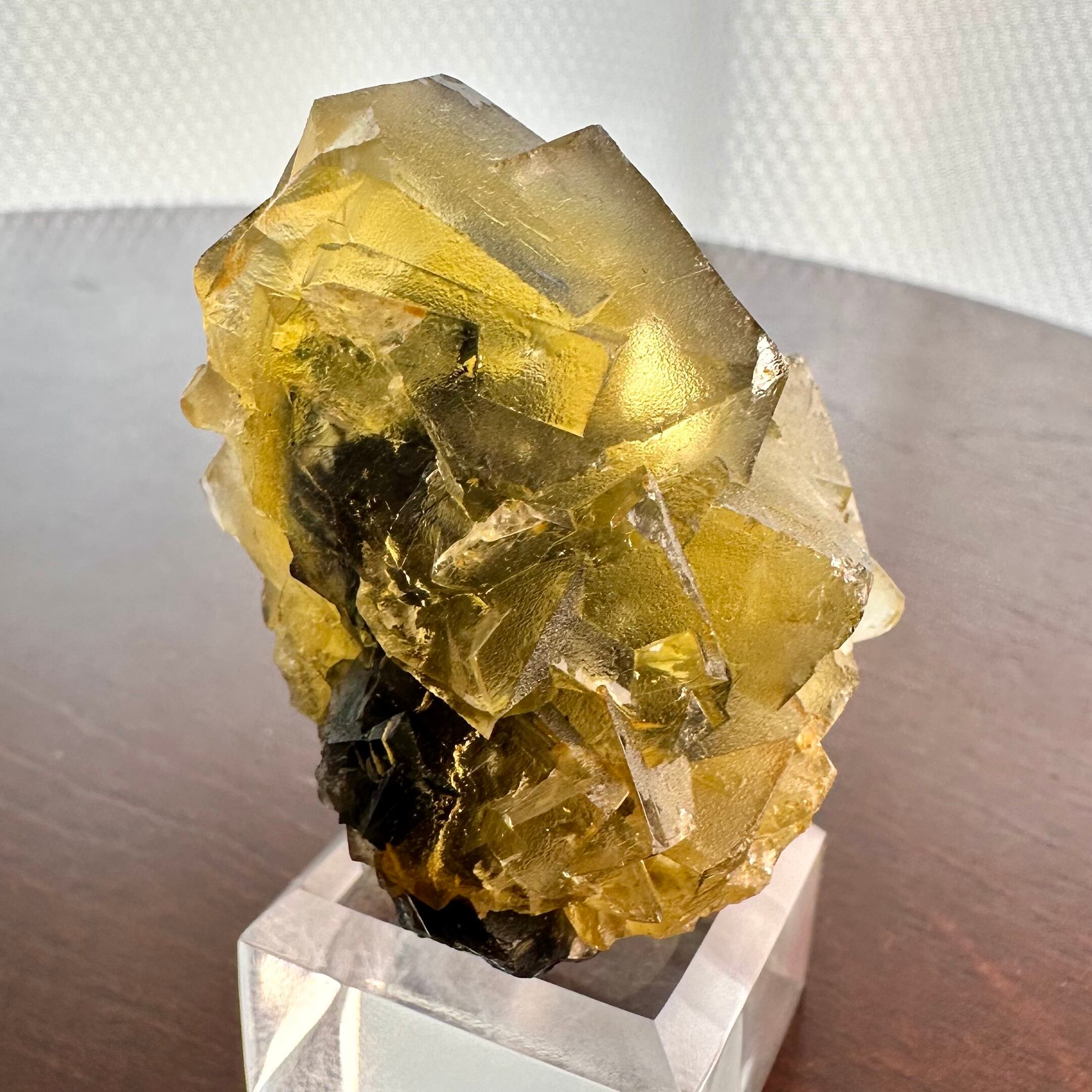 マットな結晶面ですが透明感は残っていてイエローの発色も良好、複数の結晶が貫入する様子もユニークなクラスター標本です。