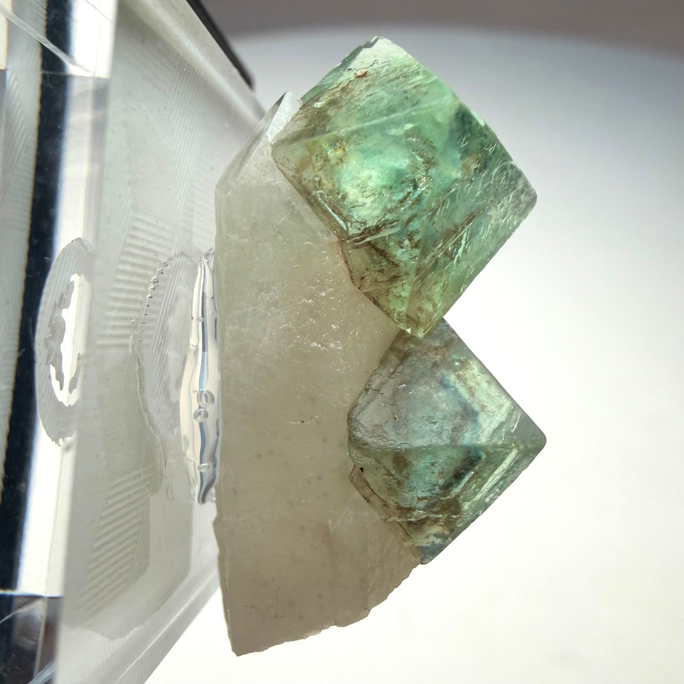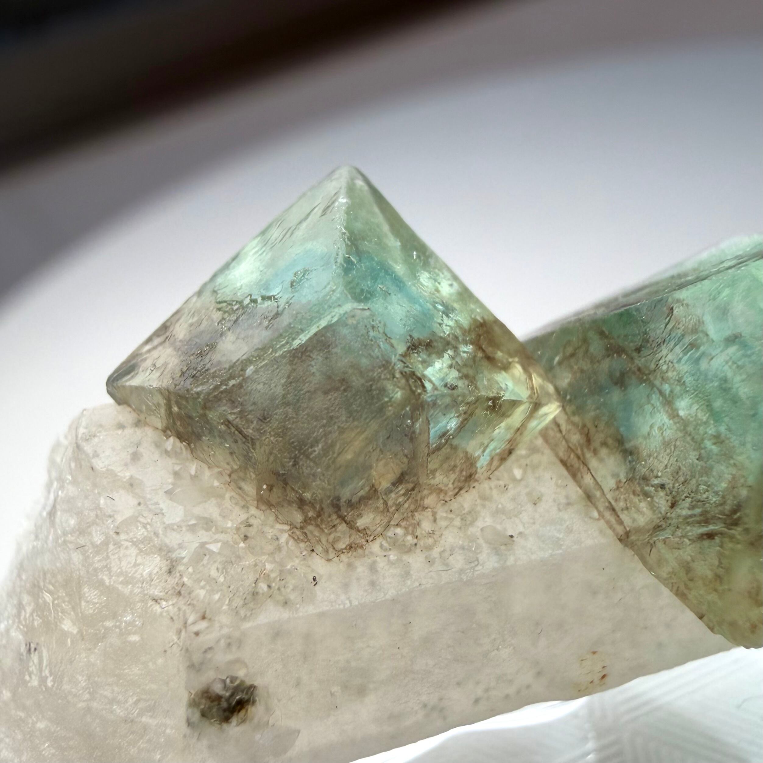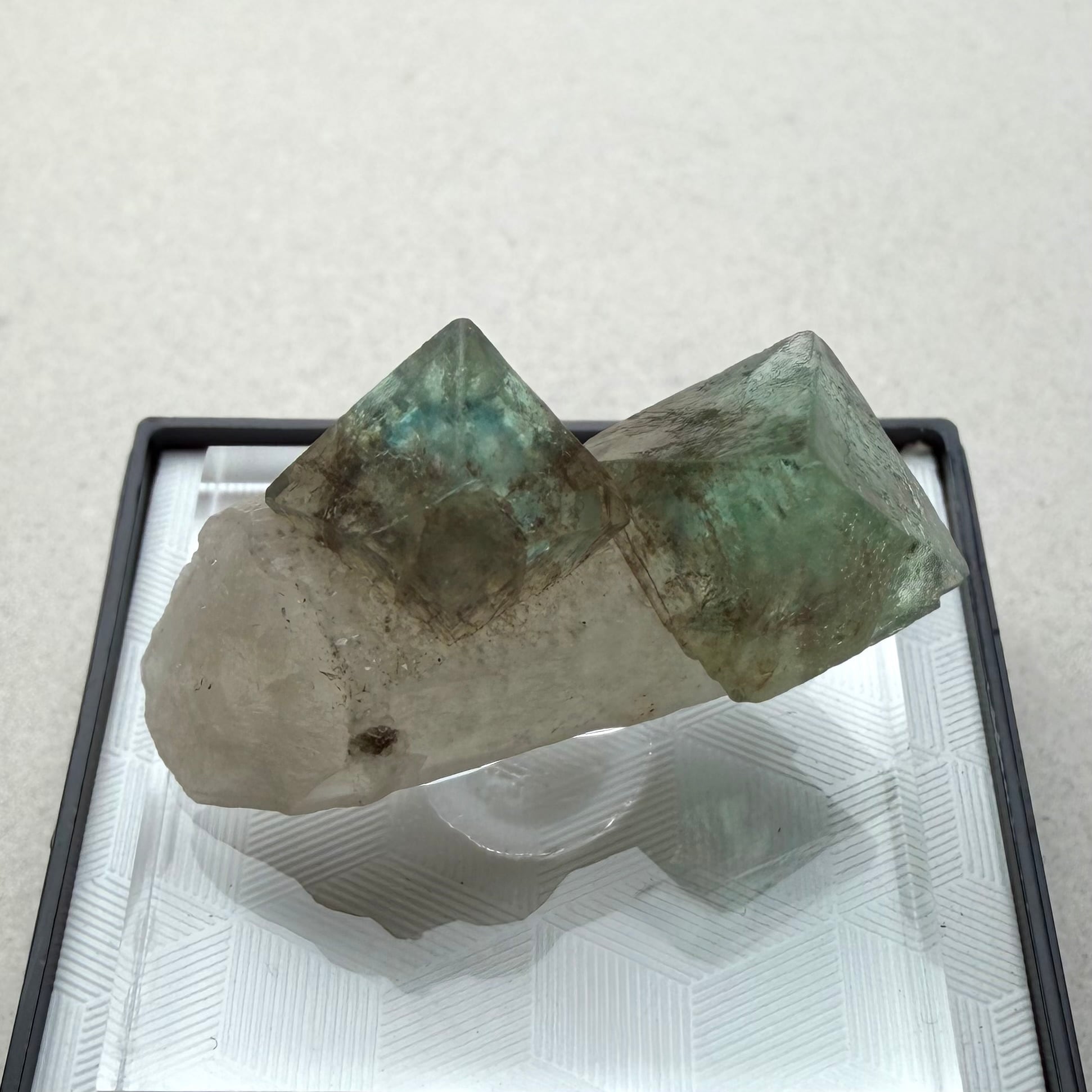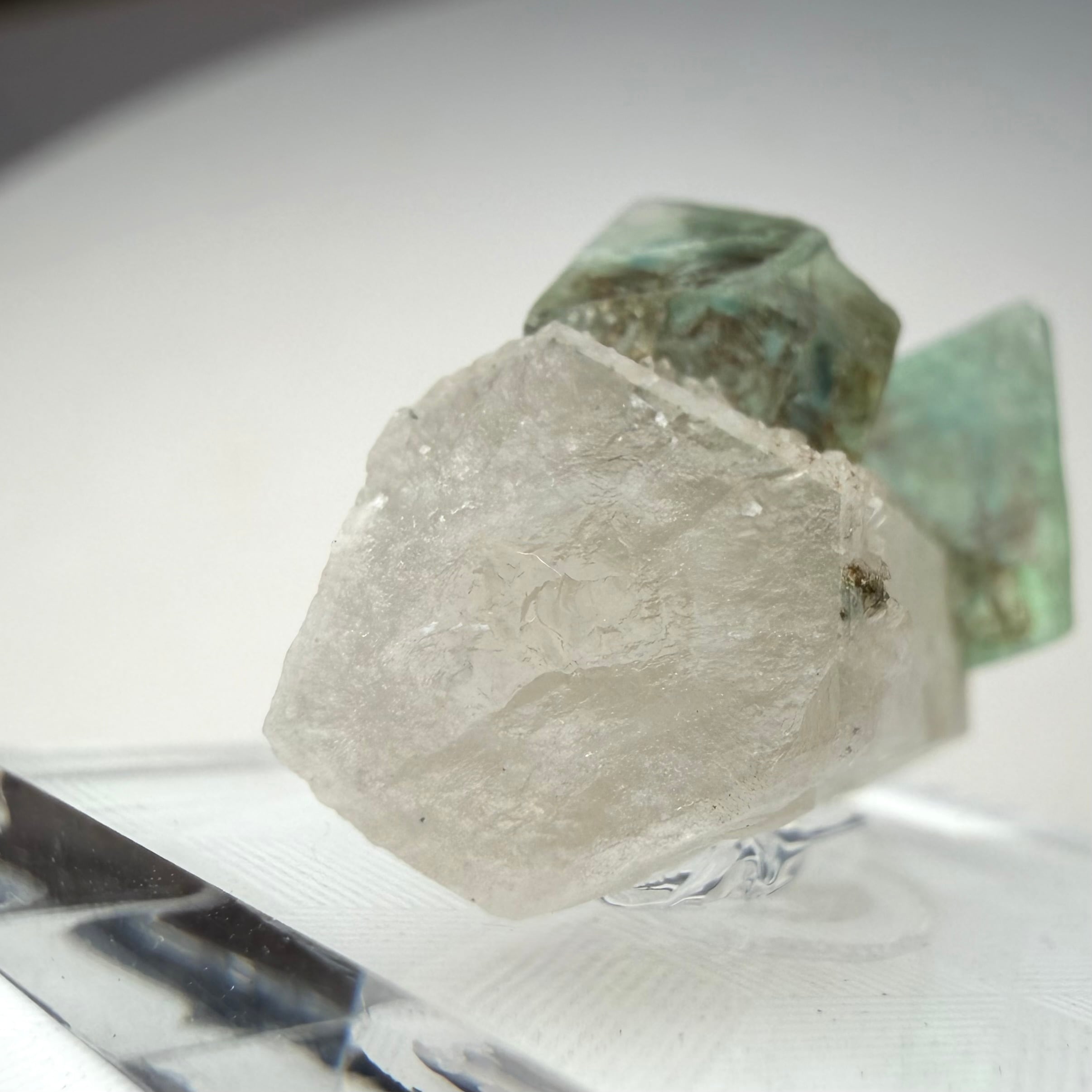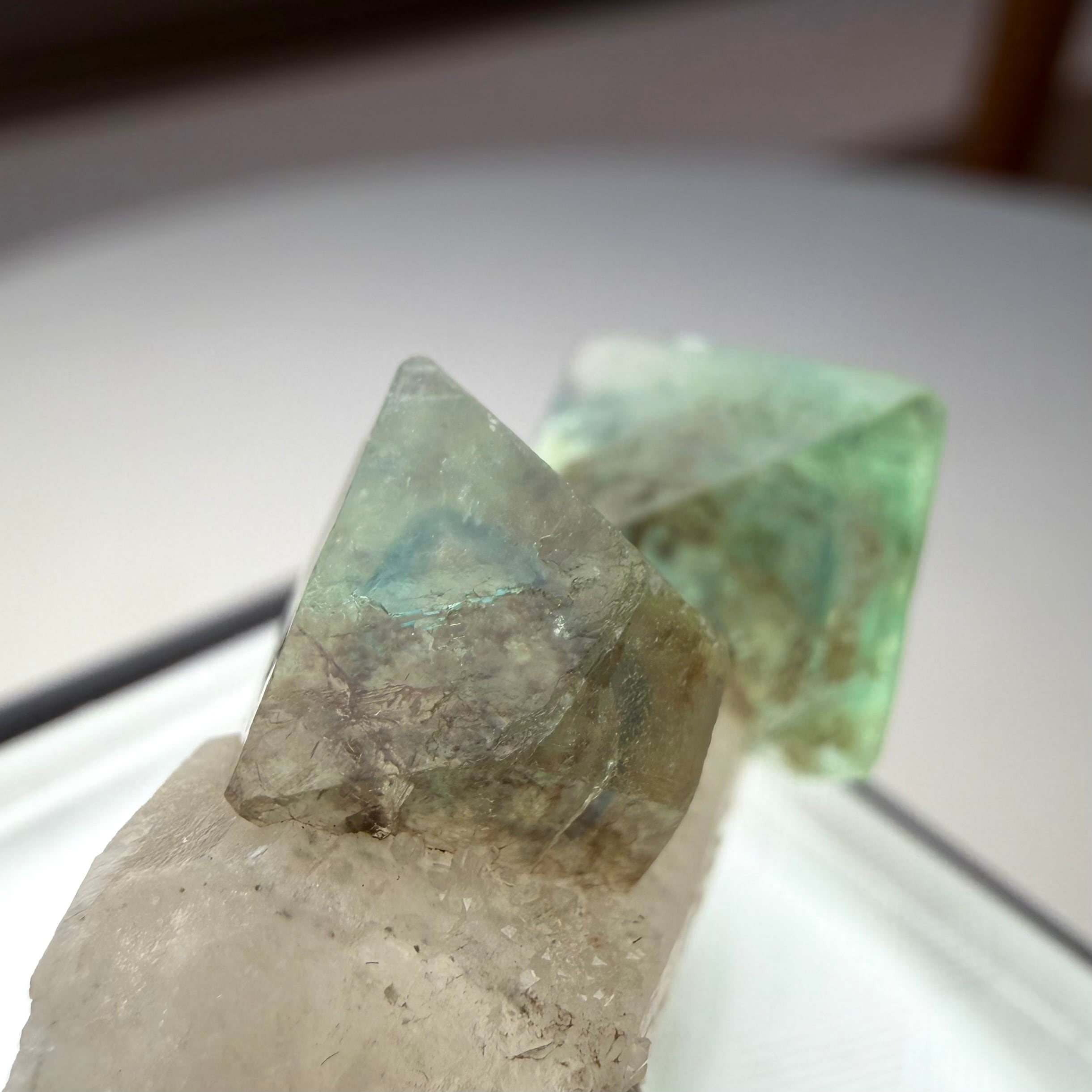 グリーンのフローライトの内部には、ブルーのゾーニングや不規則なモヤのようなファントムが見られ、クリアでしっかりとテリのある結晶が楽しめます。