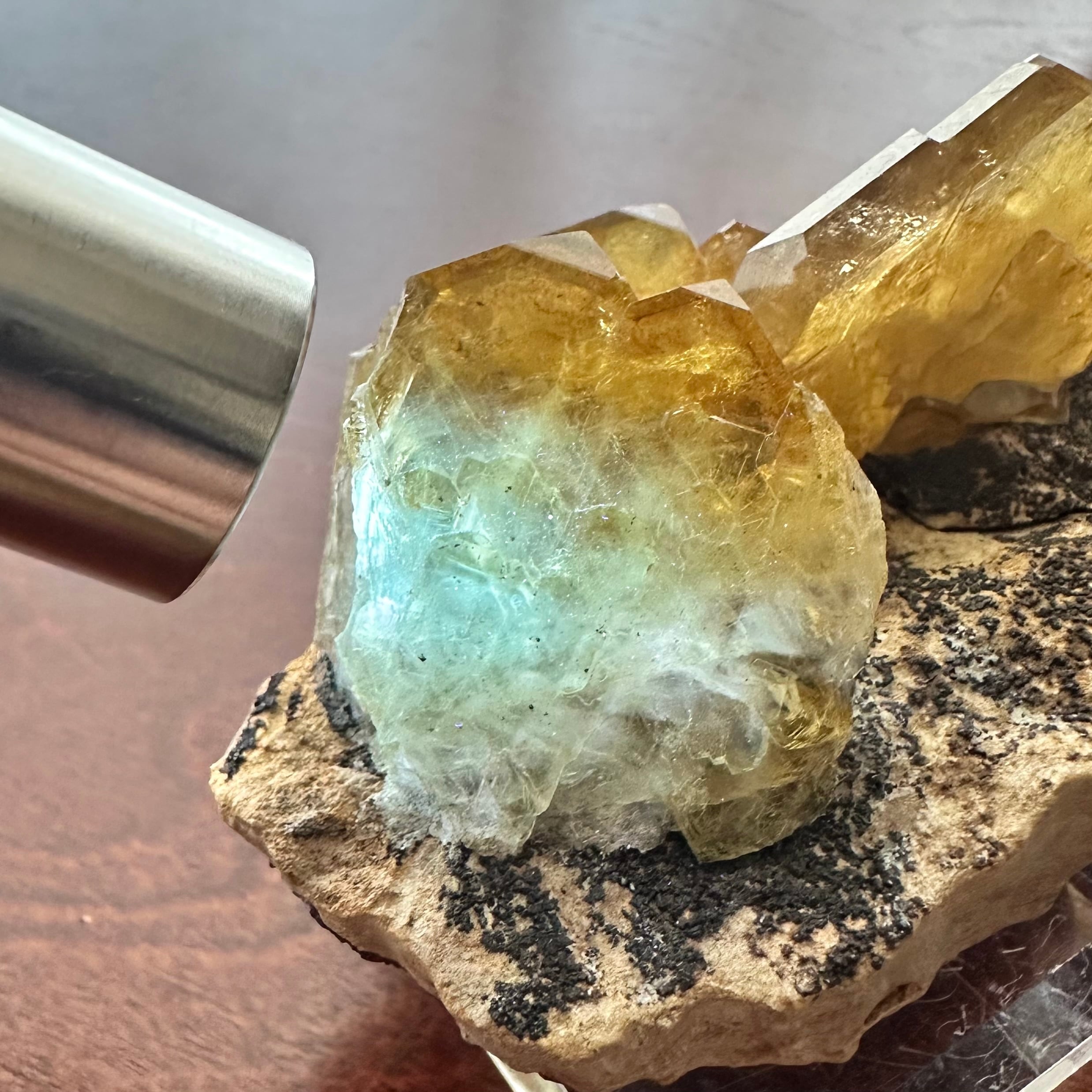 結晶と母岩部分とのバランスも良好で、バライトは白く蛍光します。