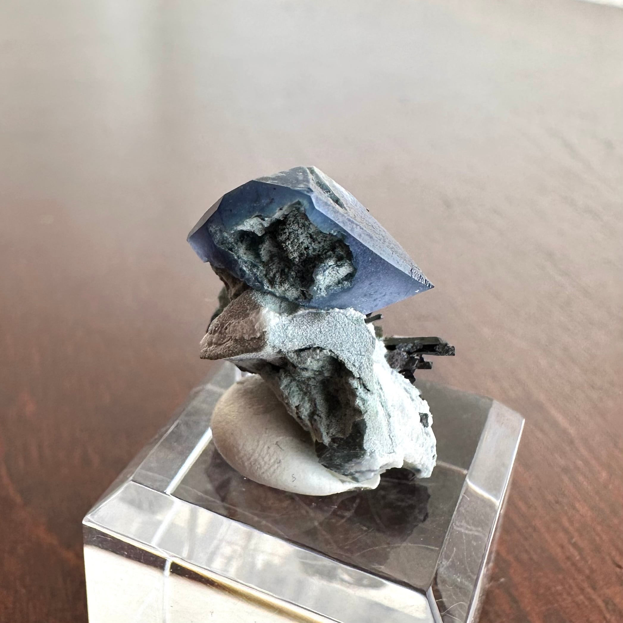 露出したベニトアイトは特徴的な三角形を美しく維持していて一辺の長さが大体15ミリ程、その全てがクリアとはいきませんが透明感と深いブルーの発色を見せる良結晶です。