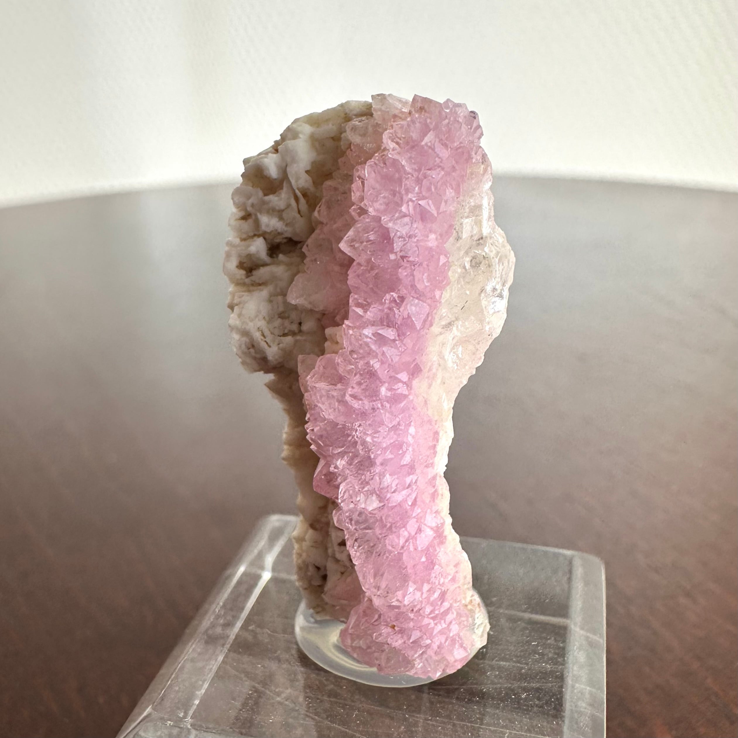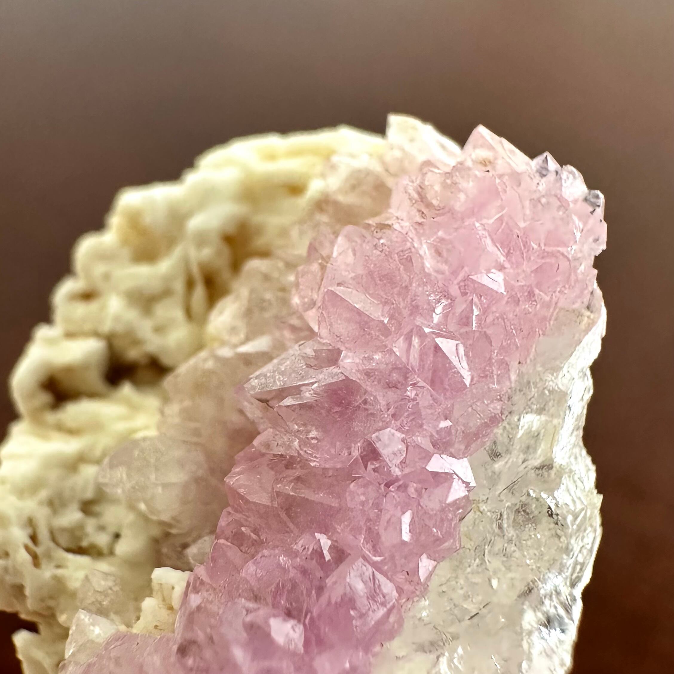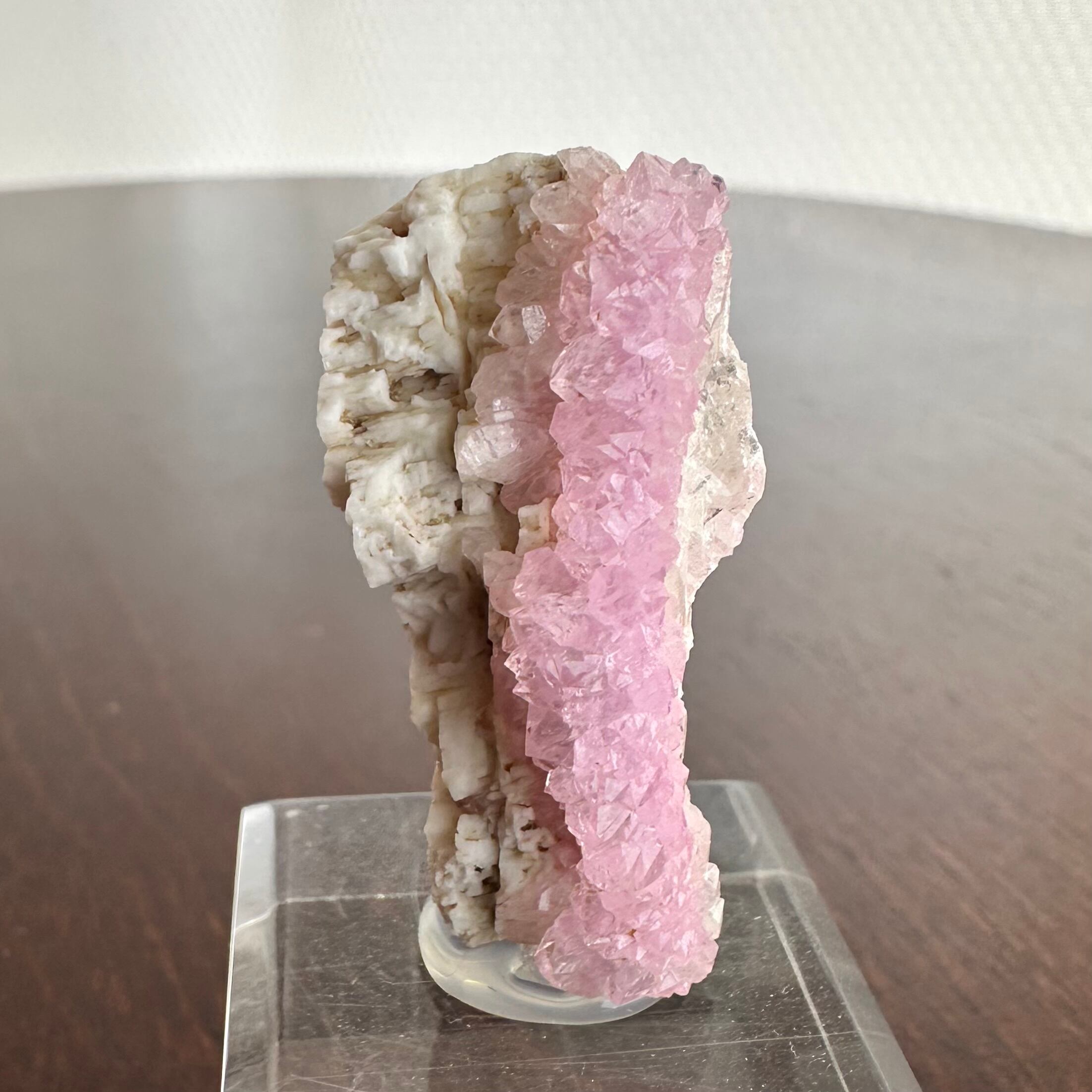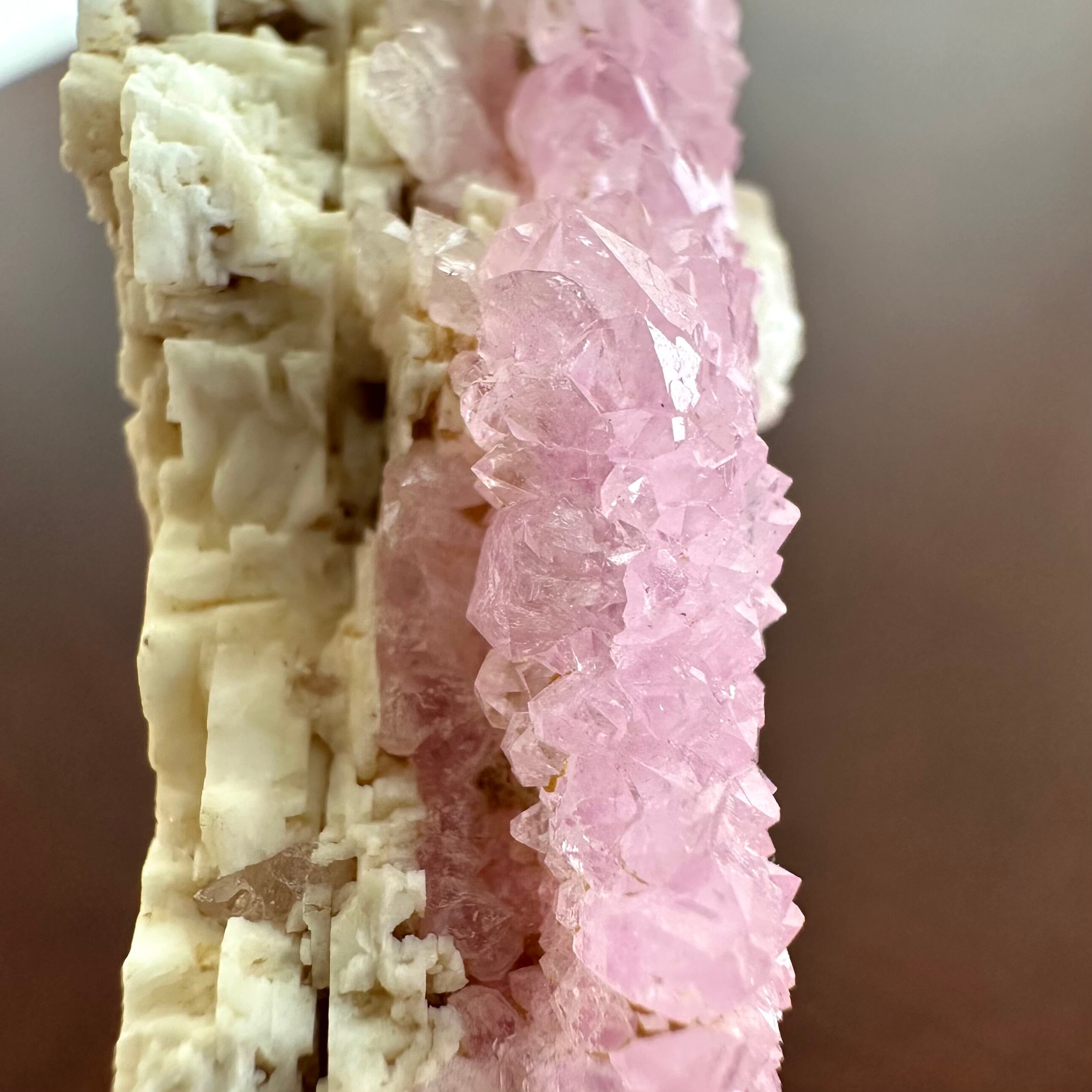 結晶が美しい形状を呈するローズクォーツは珍しく、更にピンクの発色の明瞭さが加わる良結晶で、クリアなクォーツが波打つようなローズクォーツのクラスターに寄り添うかのような景色が魅力的です。