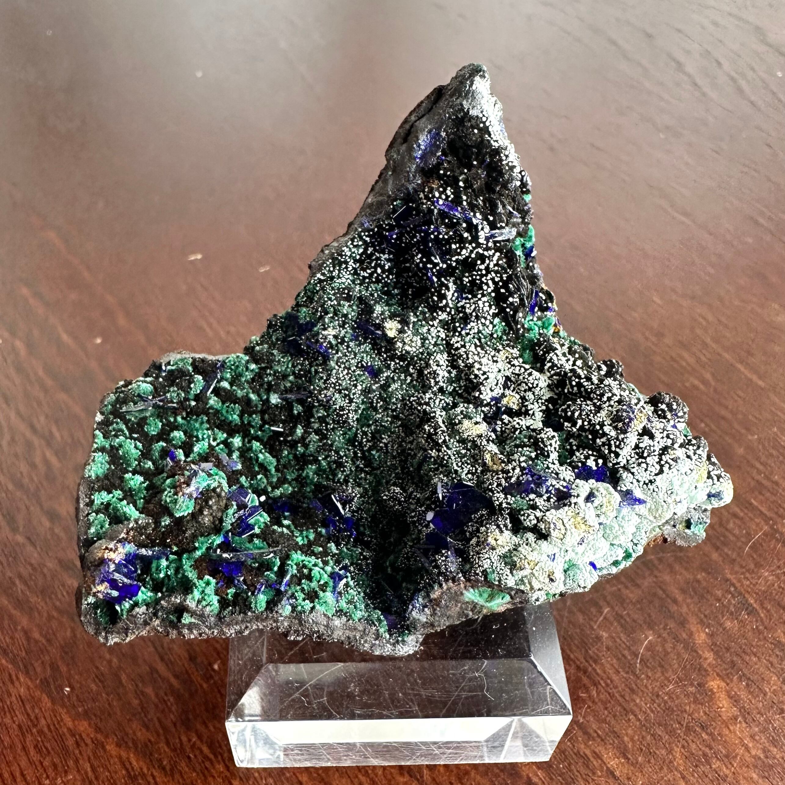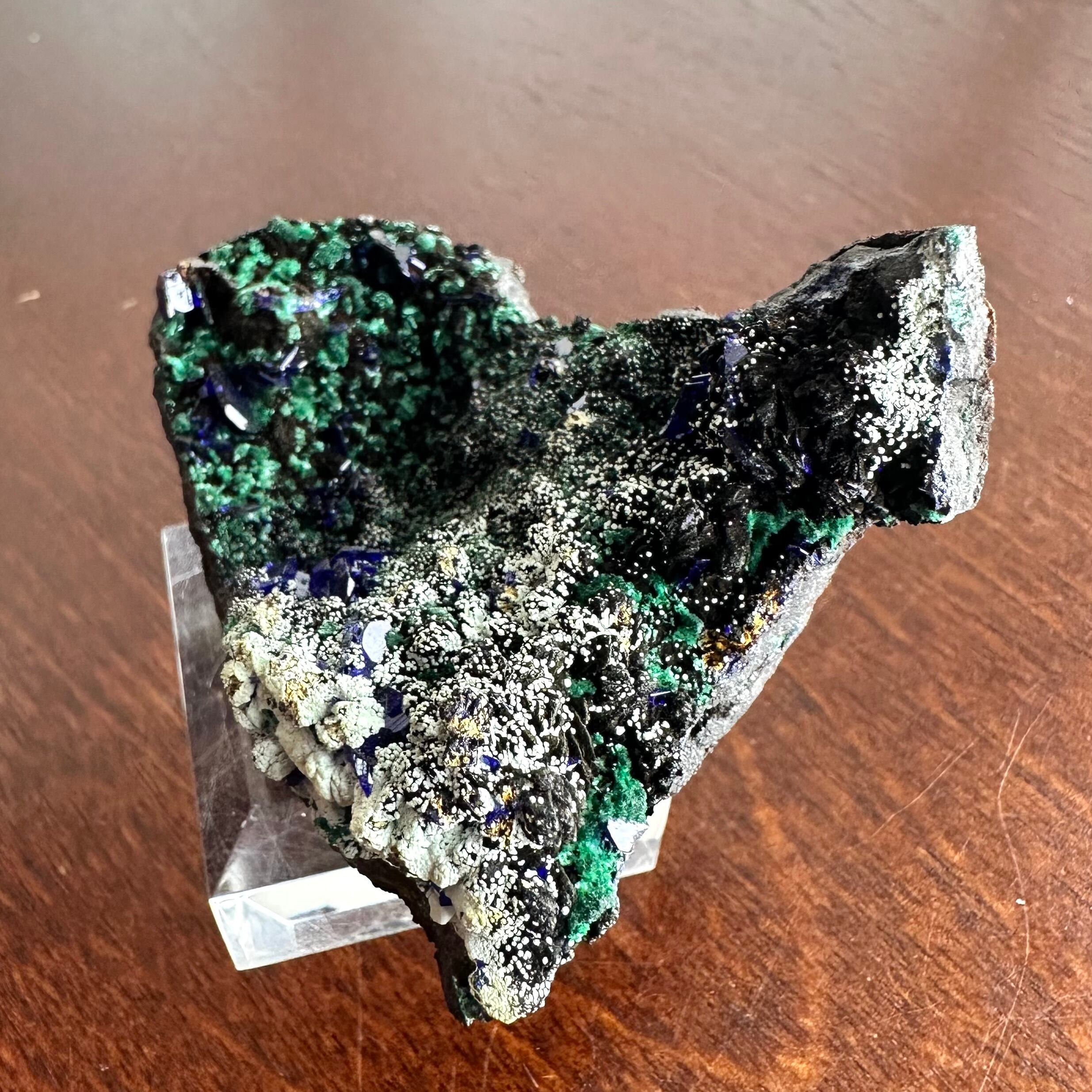 透明感と発色に優れたアズライトと、マラカイトがメインの標本ですが、前コレクターのラベルに記載は無いもののブロシャン銅鉱等その他の鉱物も共に結晶しているように見受けられます。