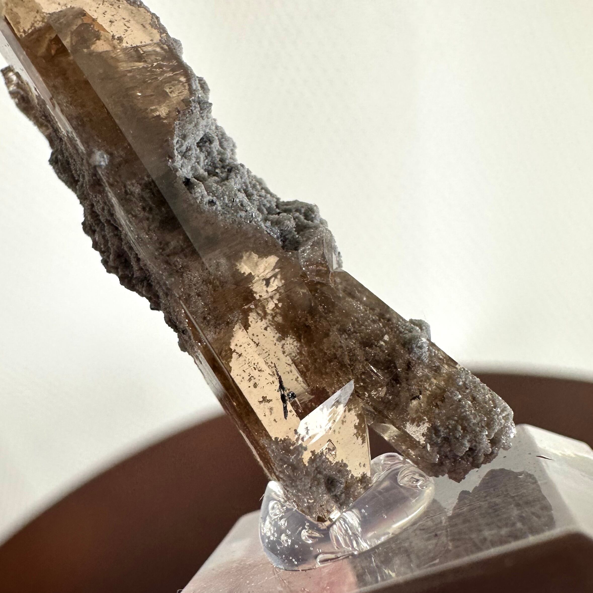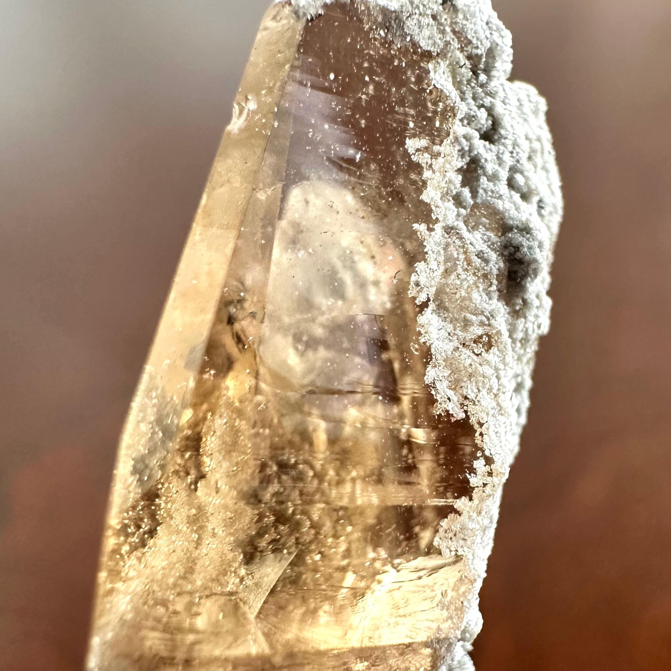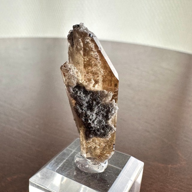 シェリーカラーの結晶は透明感とテリの強い良結晶ですが、砂岩が多く貫入するためグレイとシェリーカラーのマダラ模様となってしまっています。
