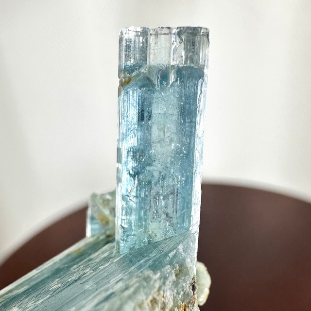全体的な発色はベトナム産としては淡めのブルーですが、結晶下部の元々サイズ感があったであろう厚みのある部分と、そこから伸びる細い結晶とのバランスが魅力的で、メインのすらりと伸びた結晶はトップもしっかりと残っています。