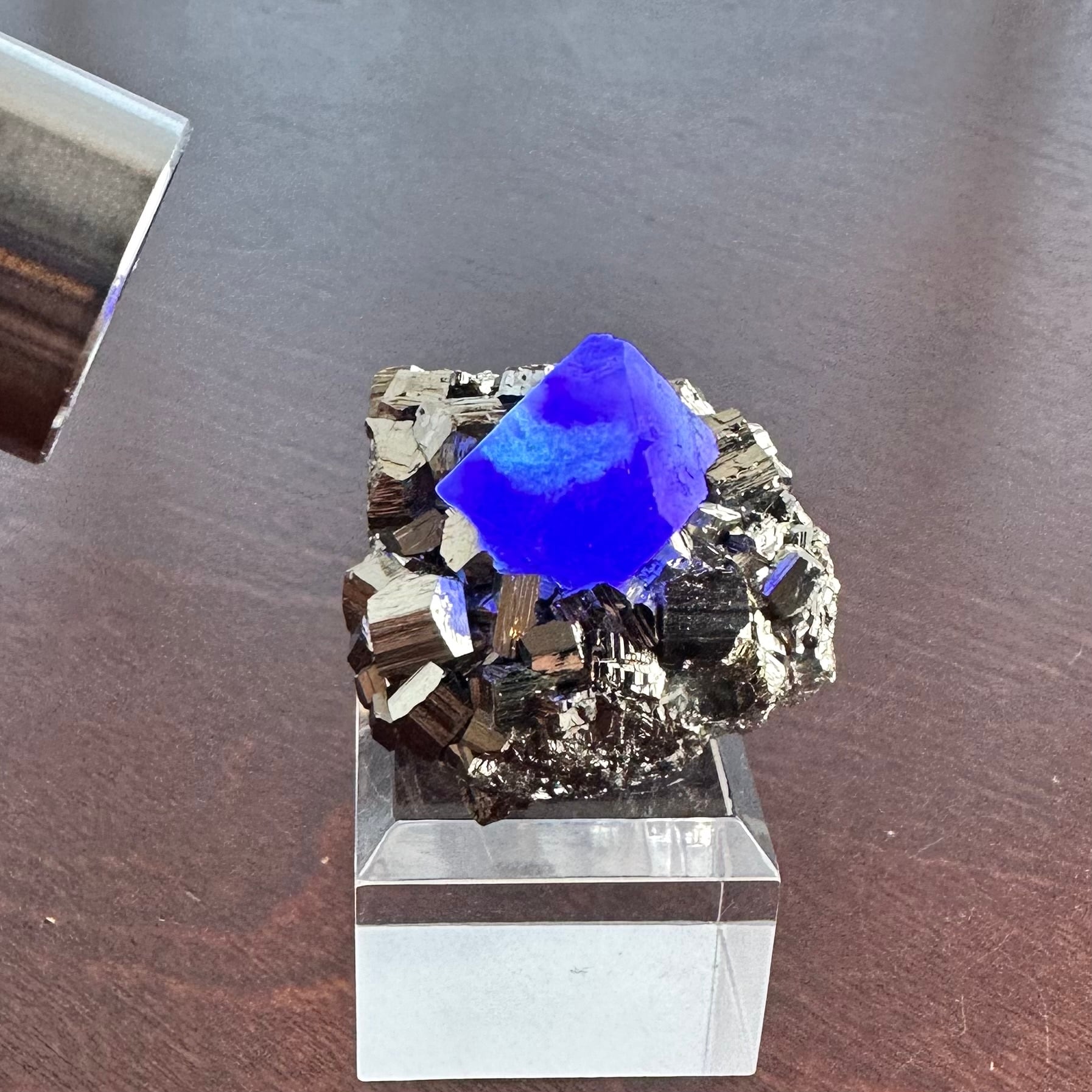 フローライトは白い内包物が結晶表面に見られるため最良とは言えませんが透明感があり、パイライトは強い光沢が特徴で、それぞれの結晶するバランスが非常に素晴らしいフォルムを生み出しています。