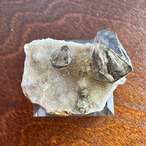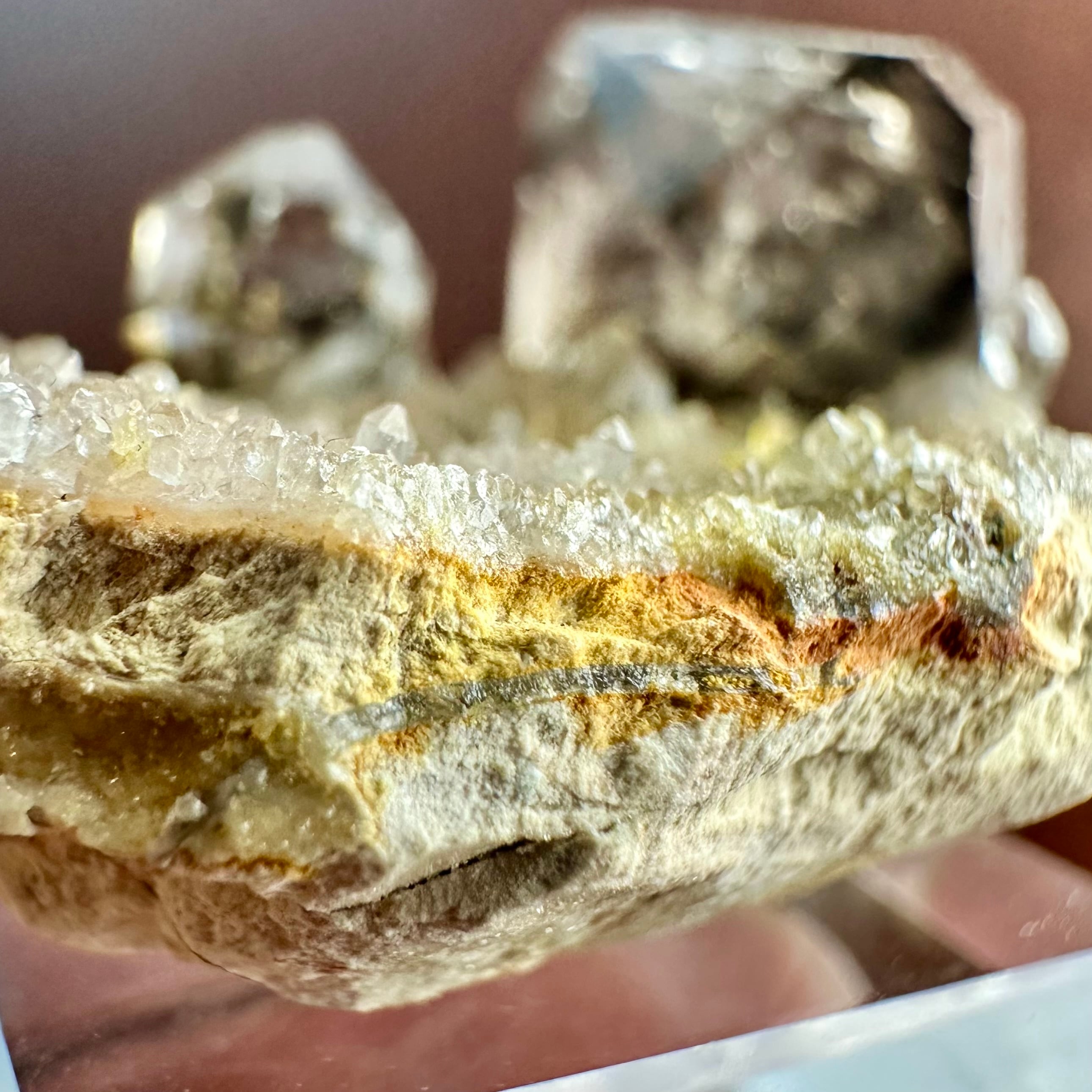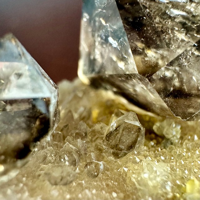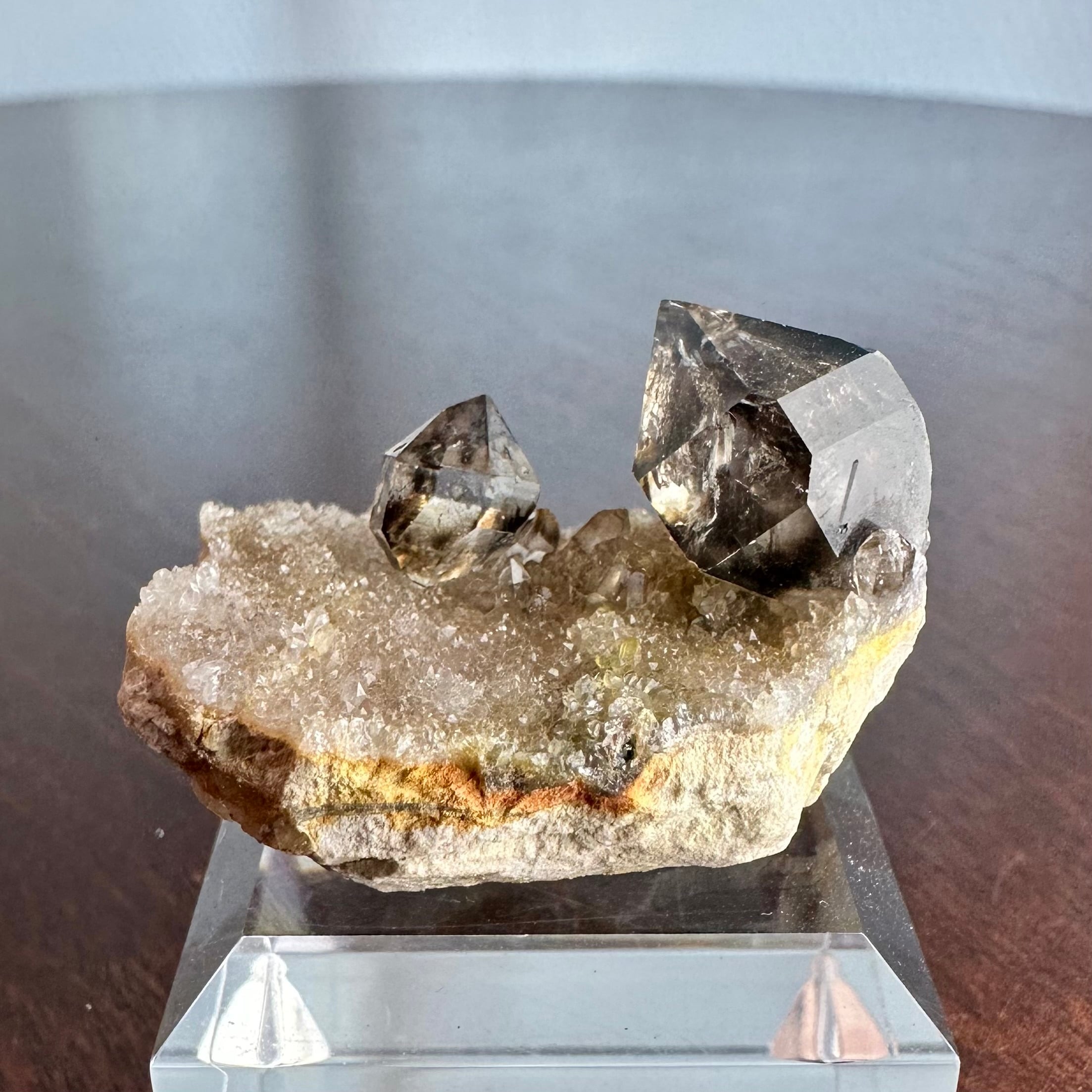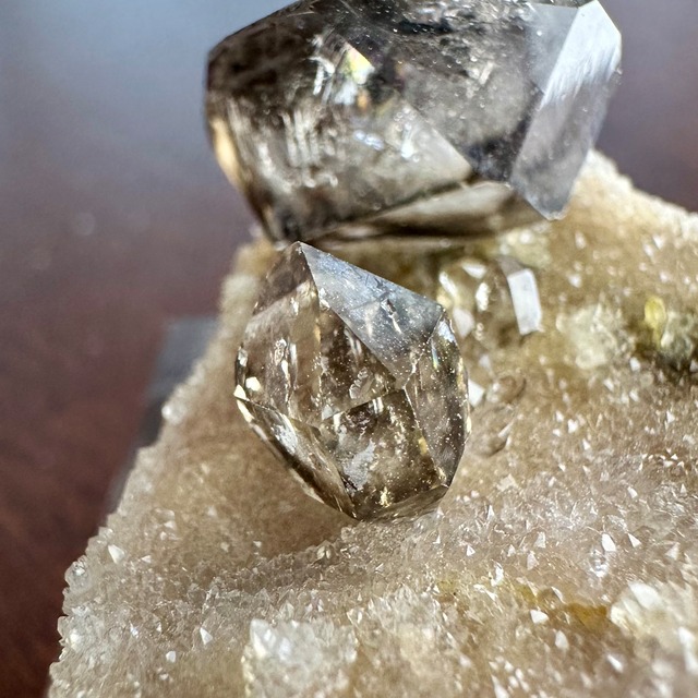 また、この標本は両錐と思しき小さめのスモーキークォーツが複数結晶する点も印象的です。