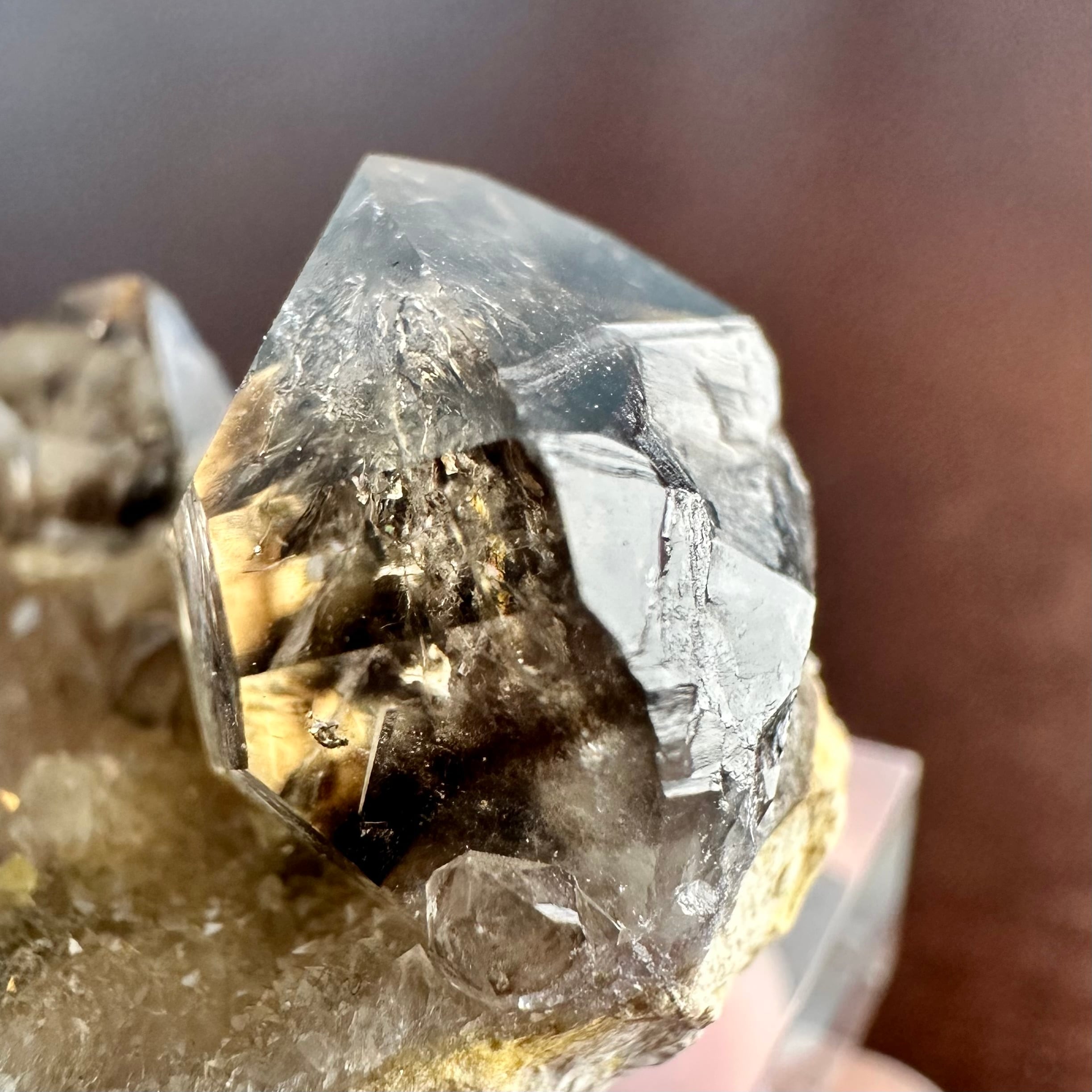 この産地の特徴がしっかり出た、微細なクォーツが無数にみられる母岩部分とスモーキークォーツのメイン結晶とのコンビネーションで、テリが強くクリアなスモーキークォーツは内部のモヤ感が美しく、自然光下でも透過光下でもその美しさが楽しめる良結晶です。