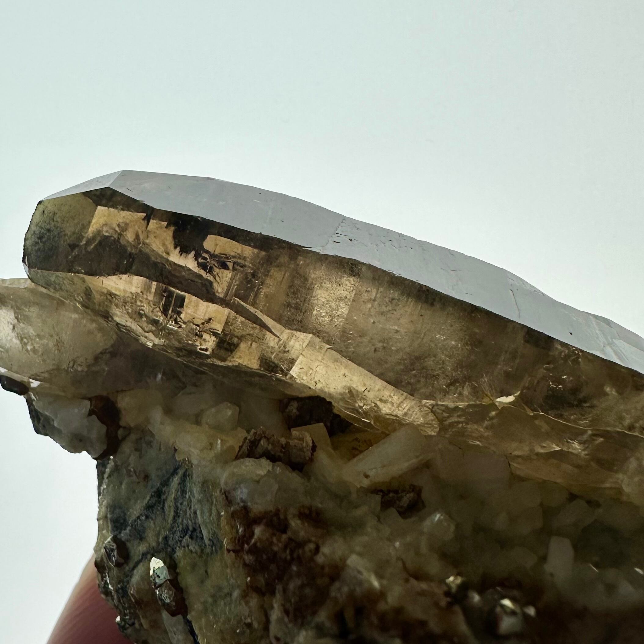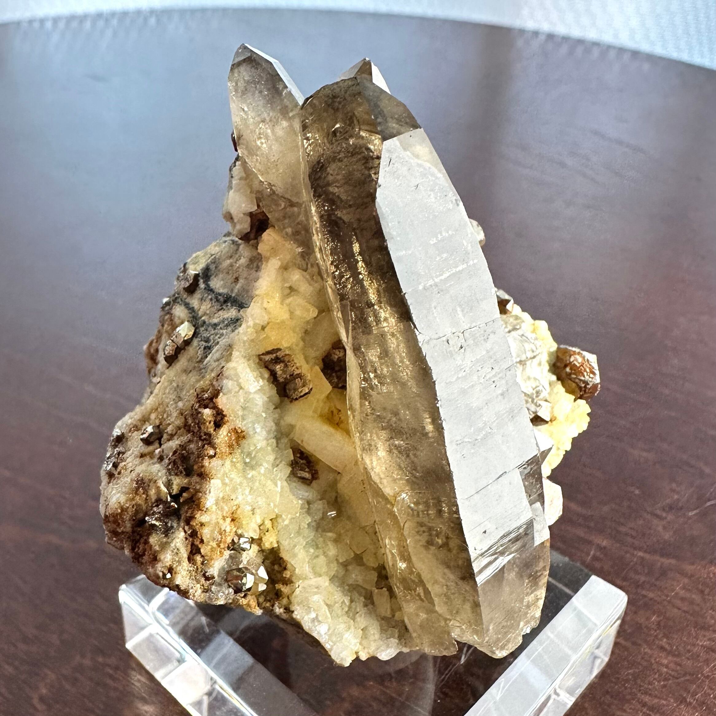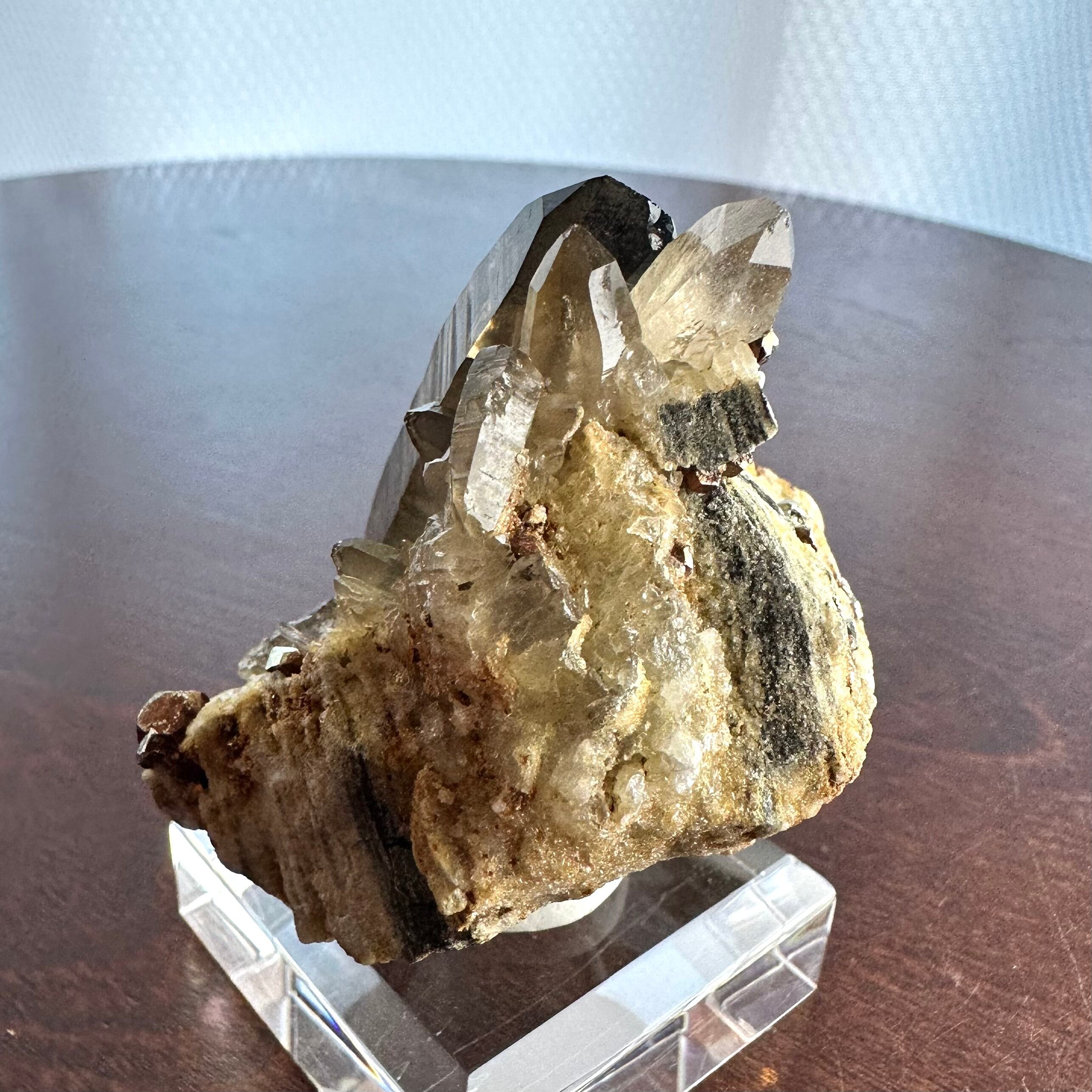 スモーキークォーツをメインに、パイライトやその他残る母岩部分とのコンビネーションがバランスの良い標本です。