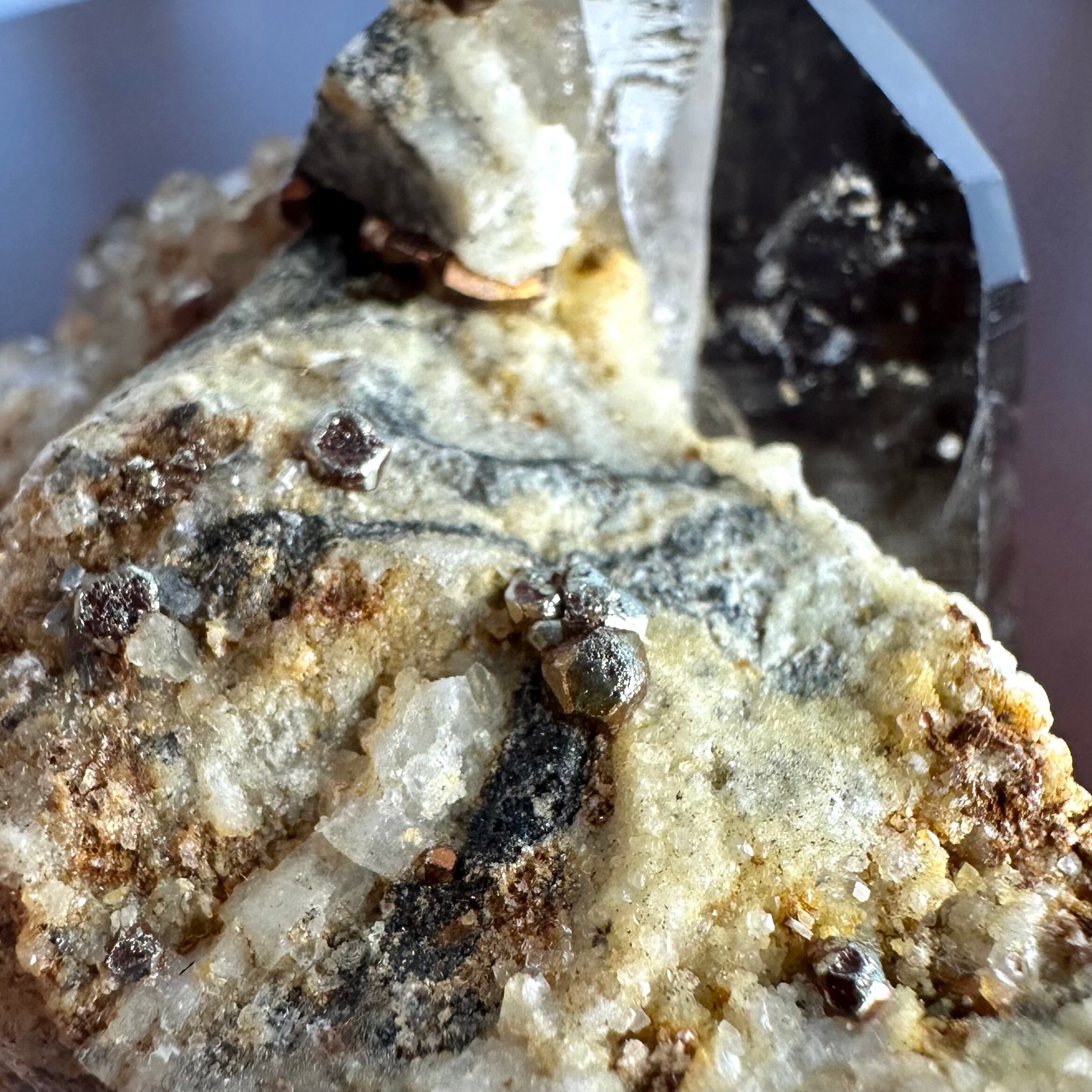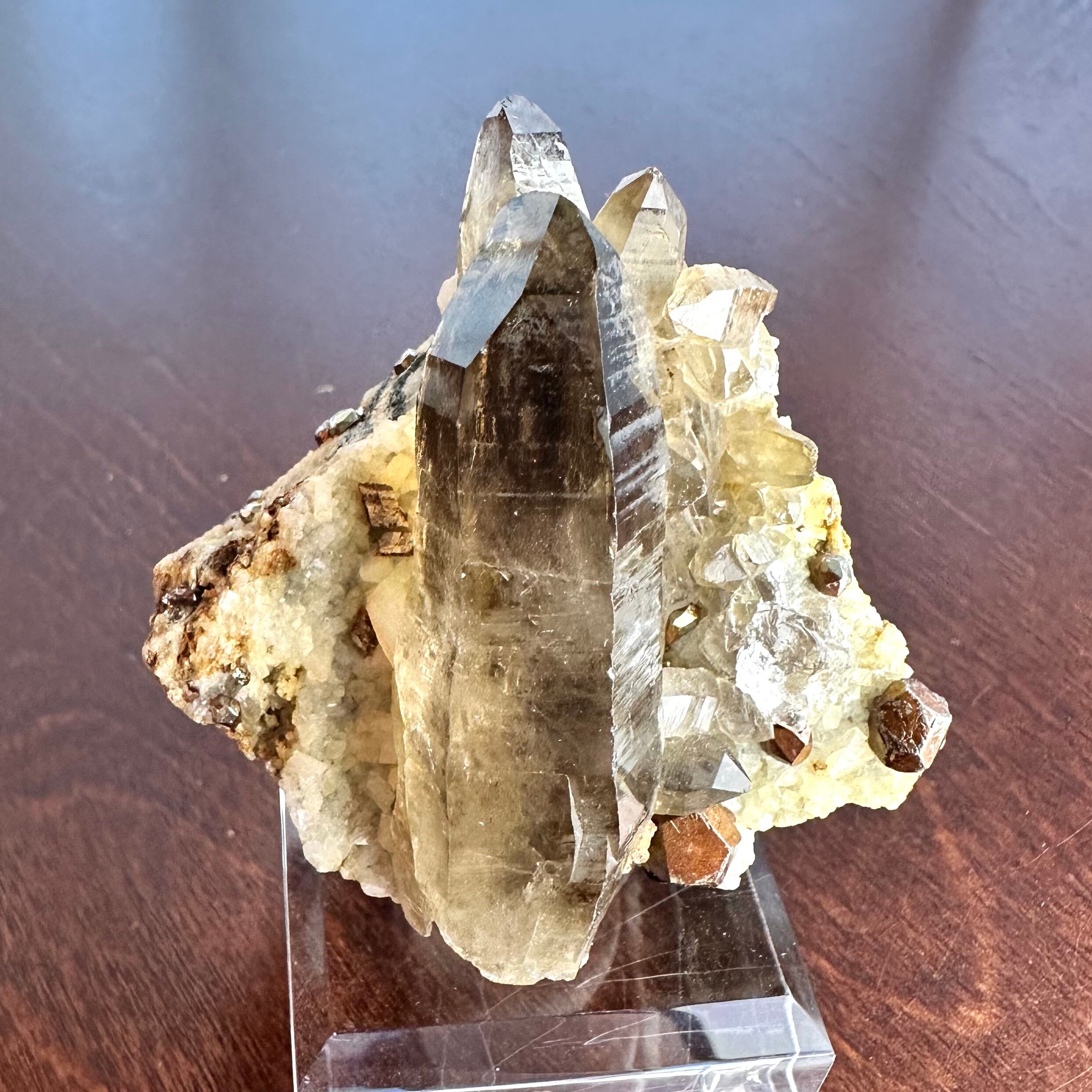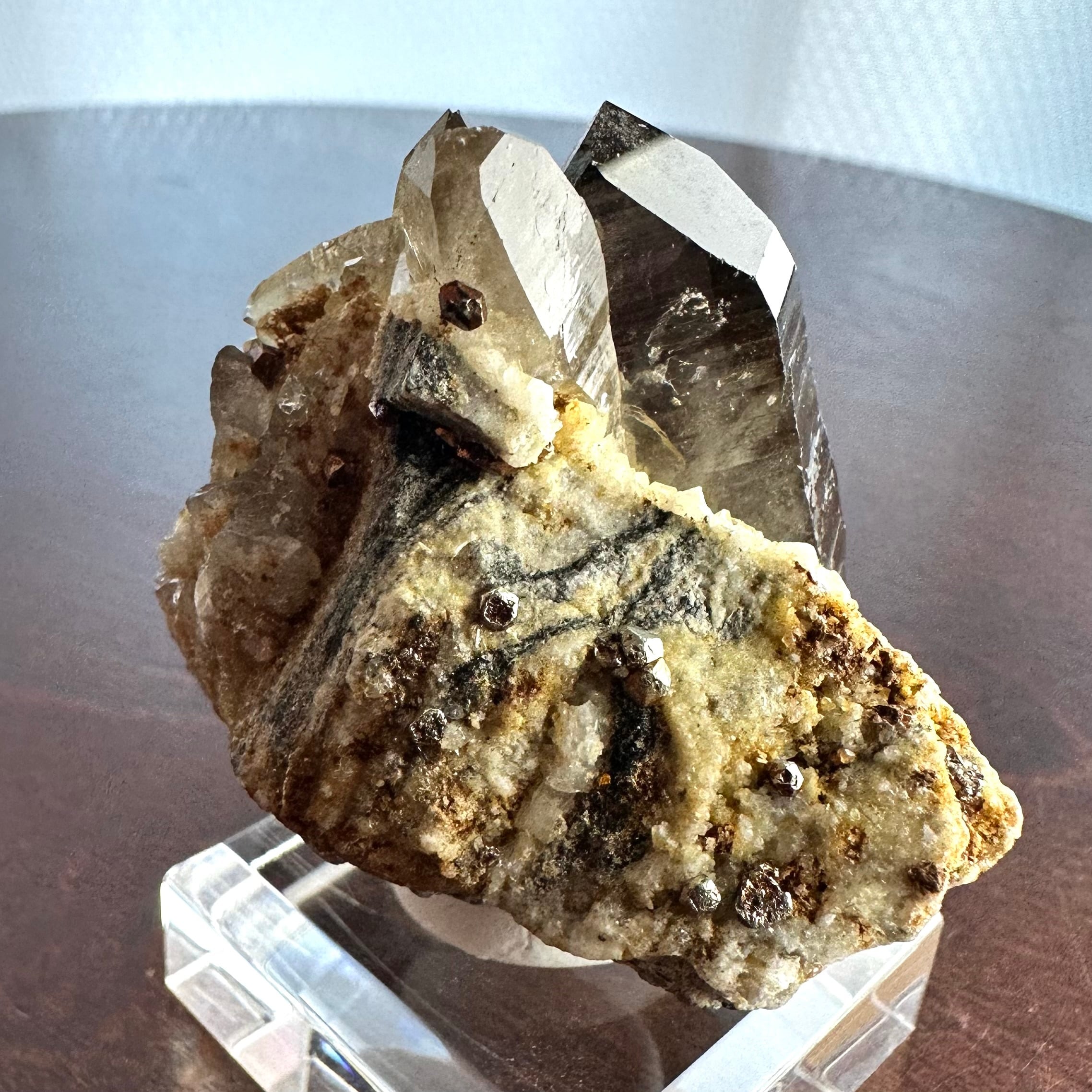 スモーキークォーツをメインに、パイライトやその他残る母岩部分とのコンビネーションがバランスの良い標本です。