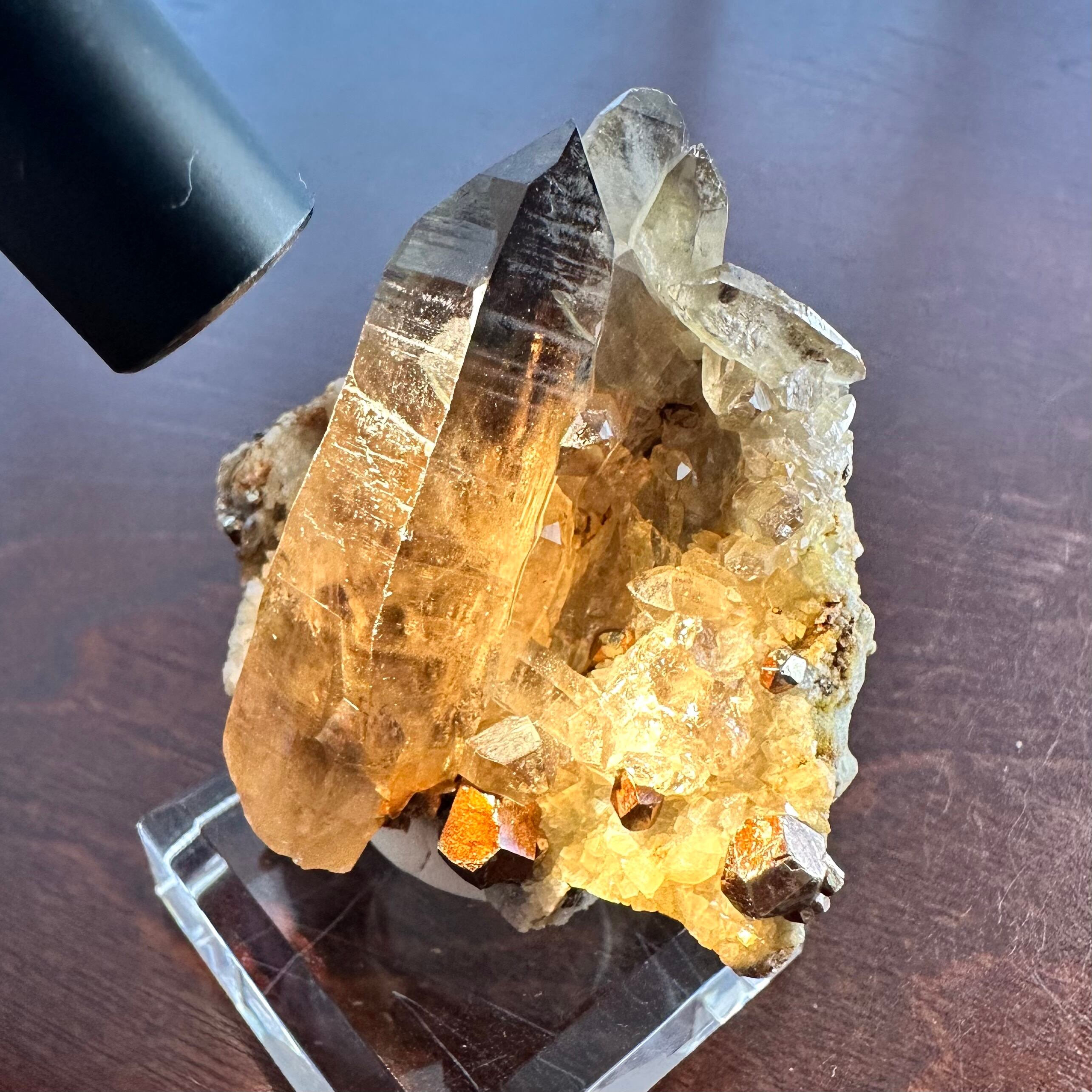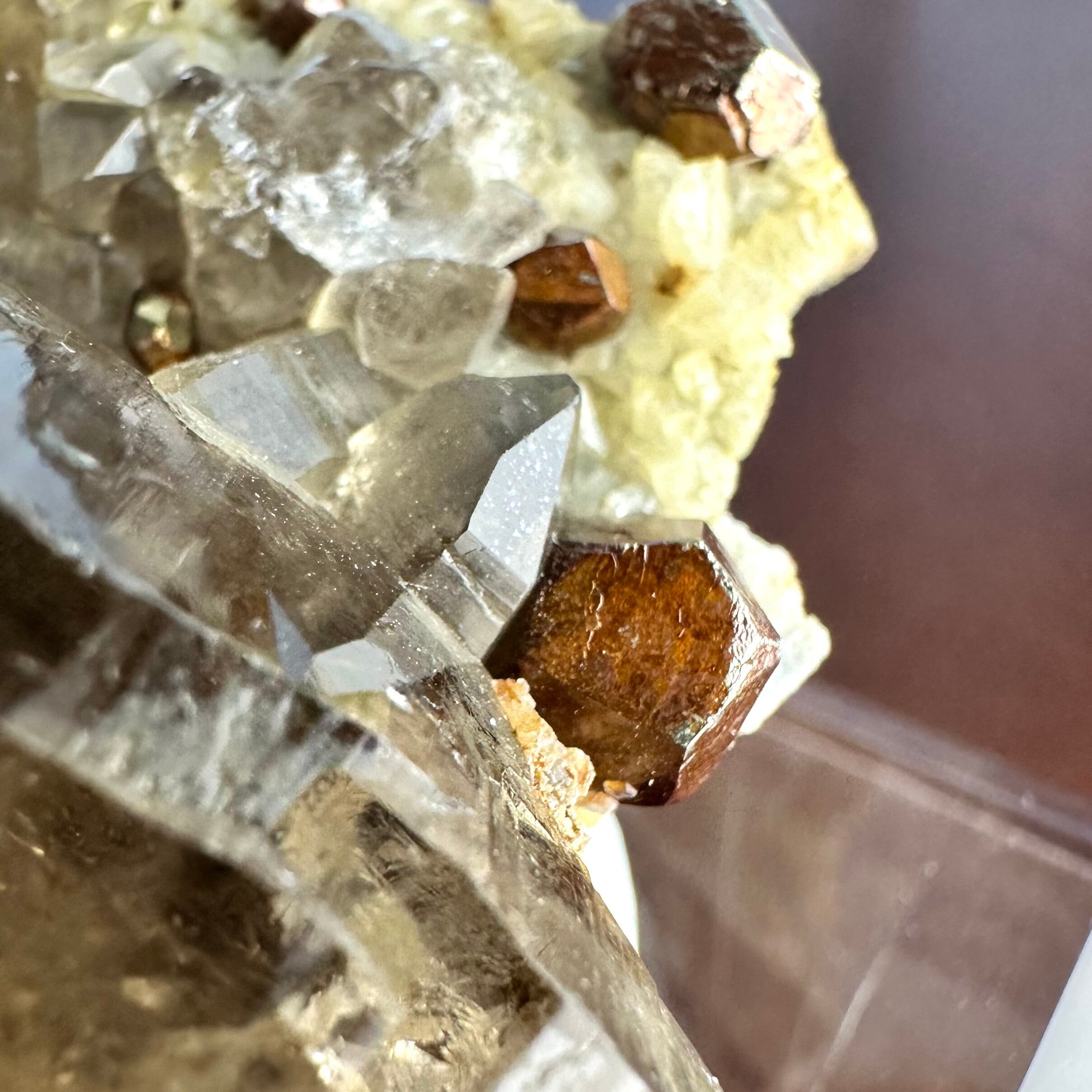 テリと透明感のあるスモーキークォーツや、十二面体に近しいユニークな形状のパイライトが印象的で、パイライトは標本全体的に見られます。