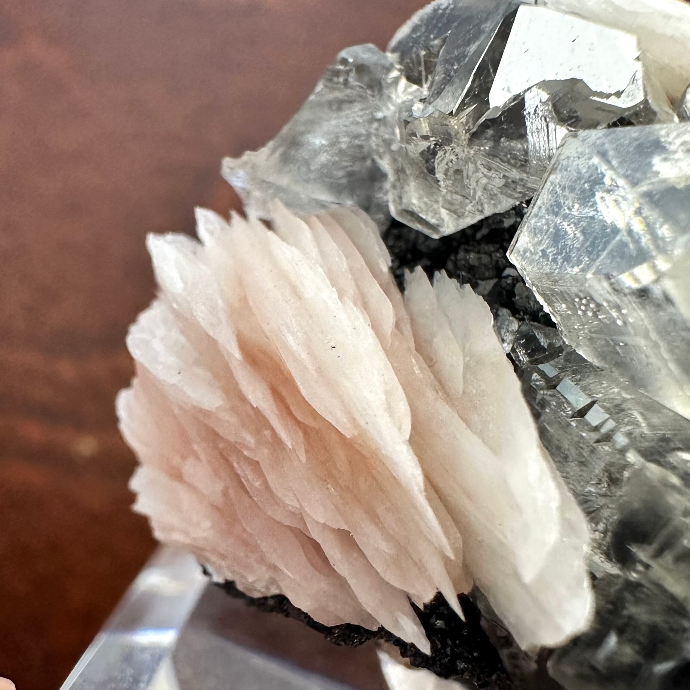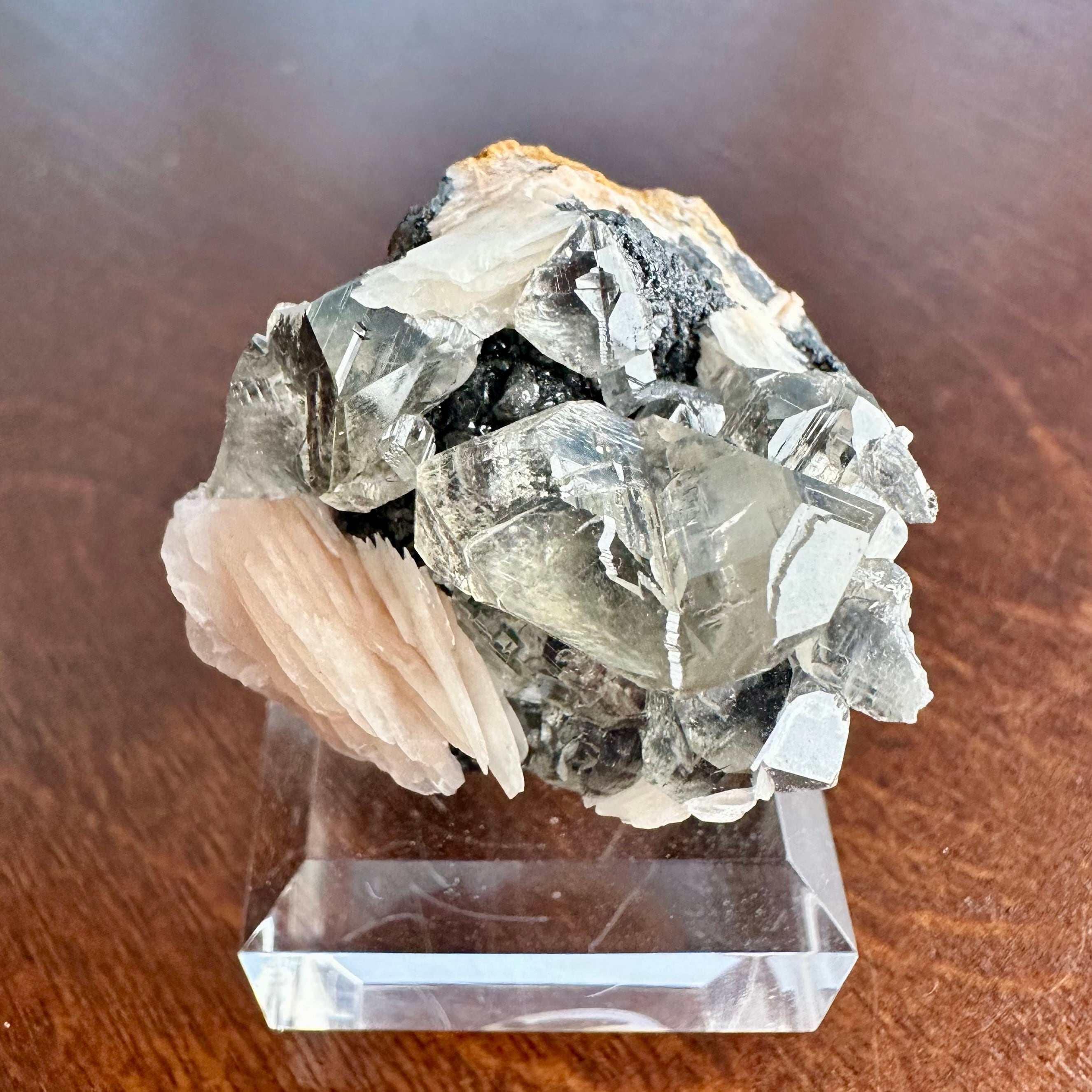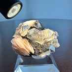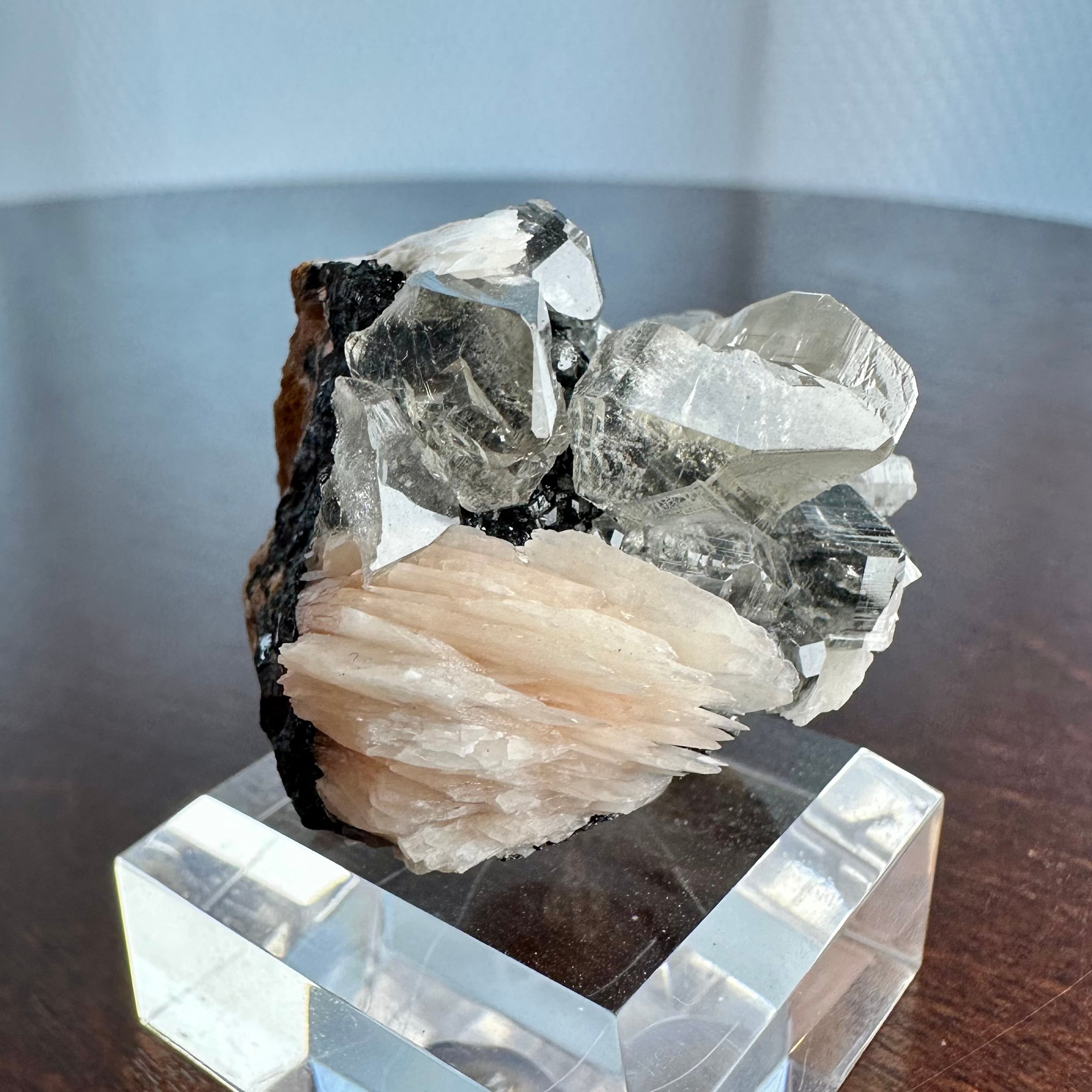 層状になった淡いピンクのバライトは形状が整っていて、メイン結晶の双晶セルサイトとのバランスも良好、比較的流通量が見られる中で全体的な纏まりやフォルムが魅力的な標本です。