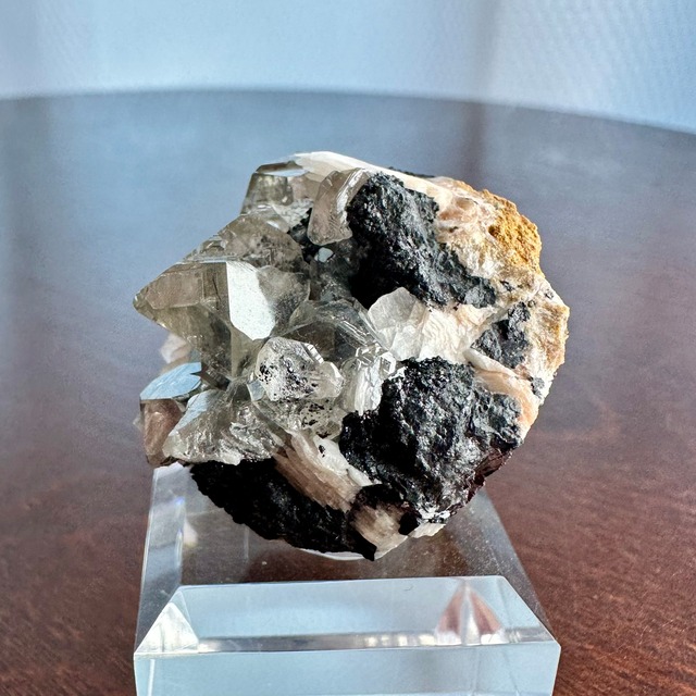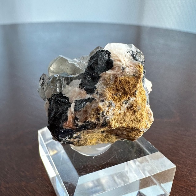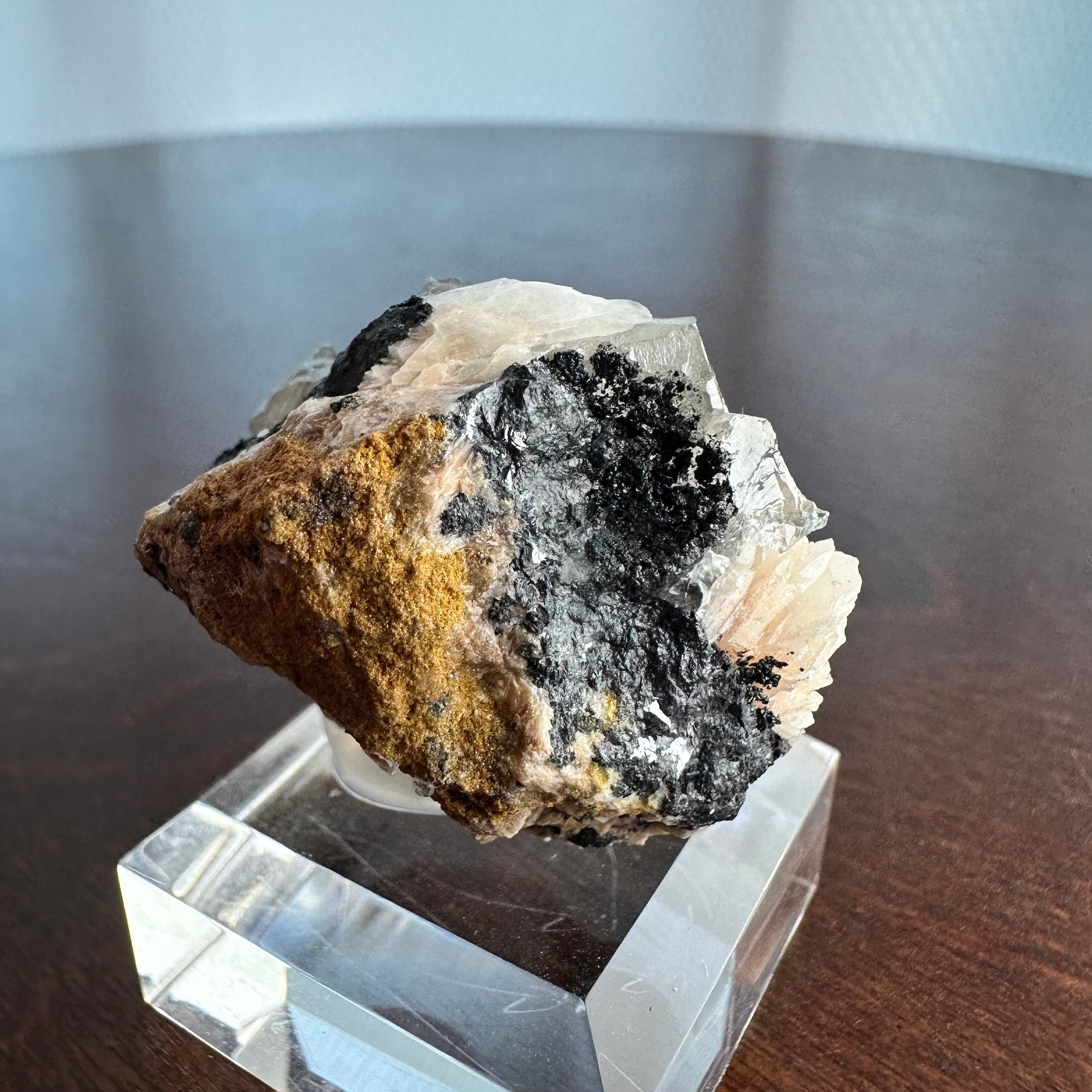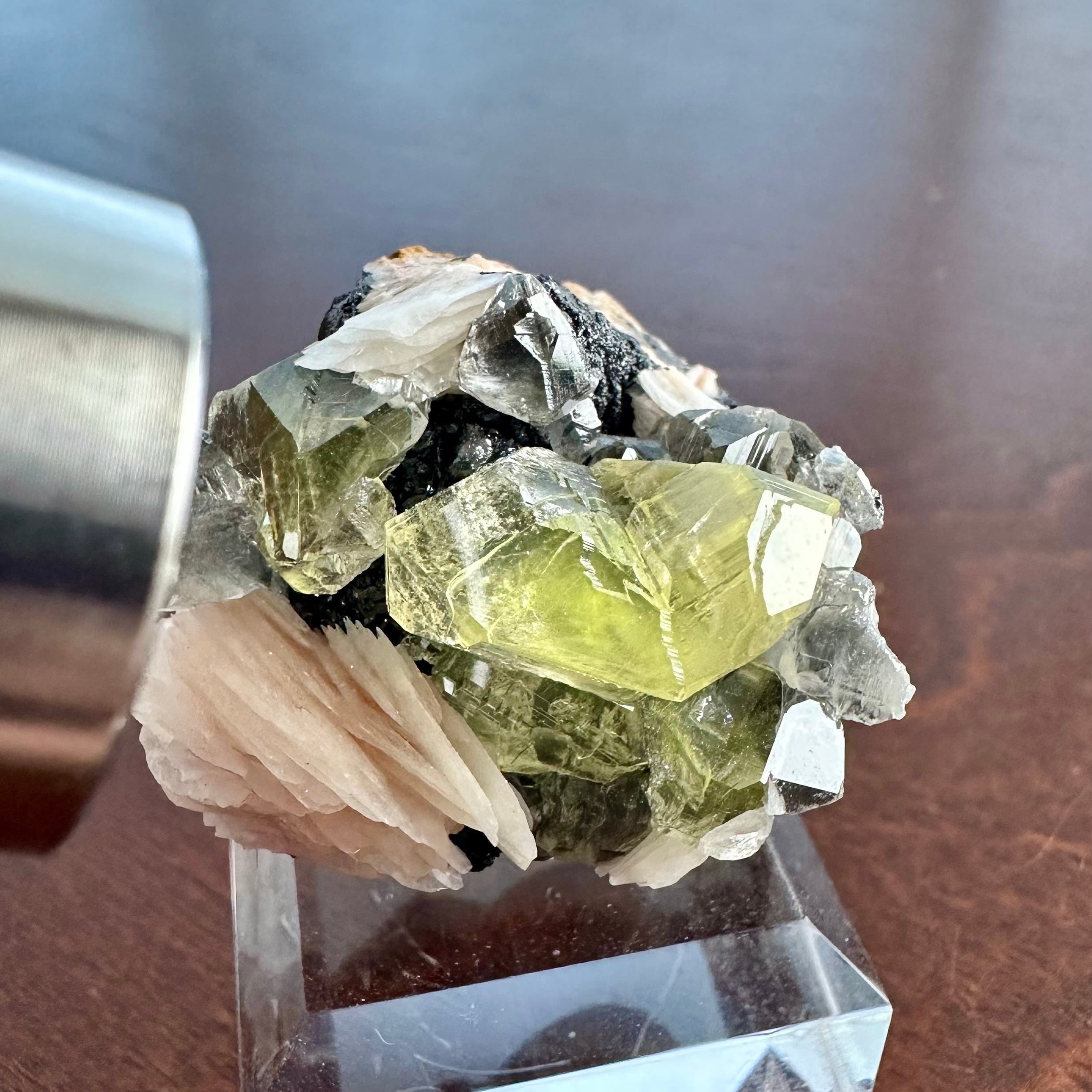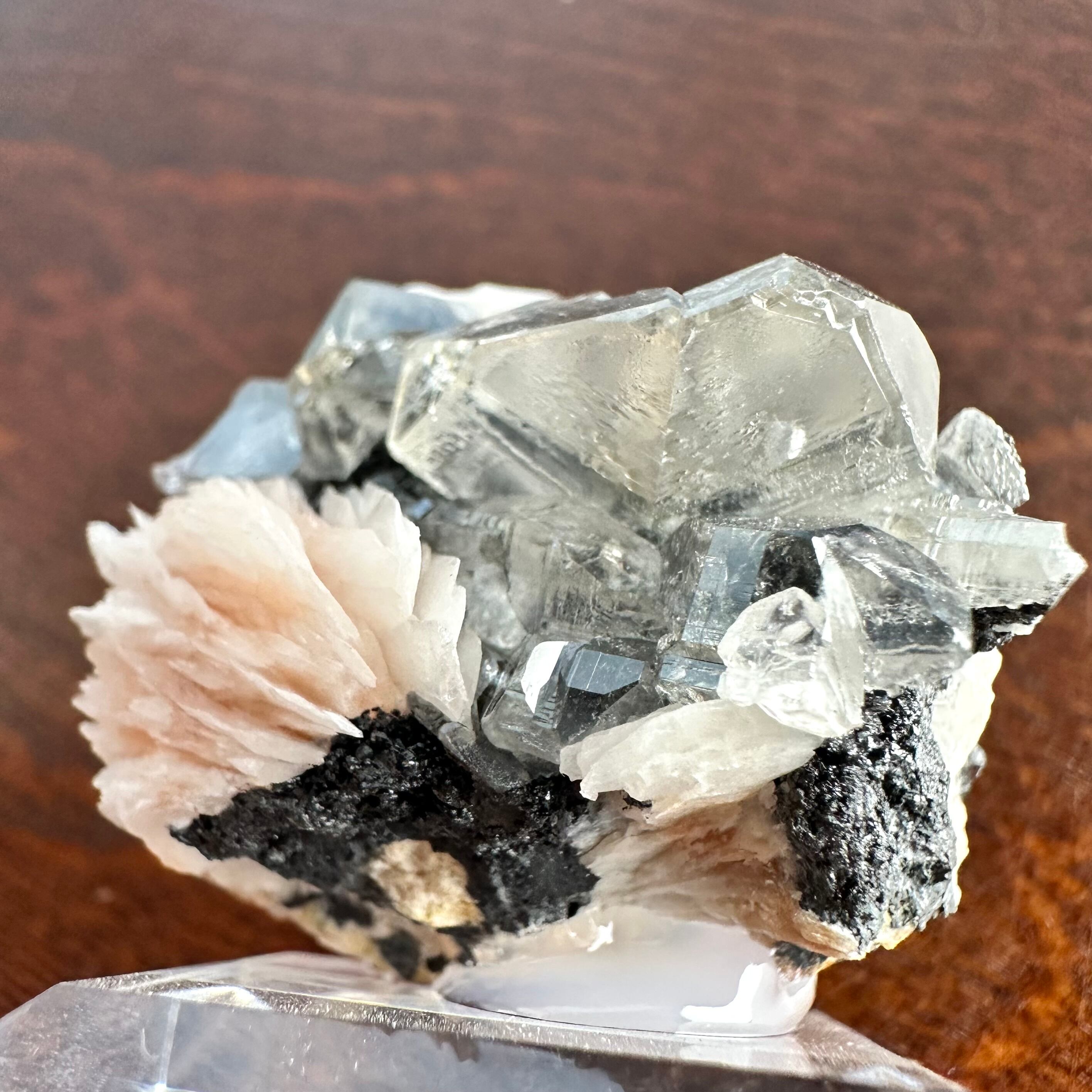 層状になった淡いピンクのバライトは形状が整っていて、メイン結晶の双晶セルサイトとのバランスも良好、比較的流通量が見られる中で全体的な纏まりやフォルムが魅力的な標本です。