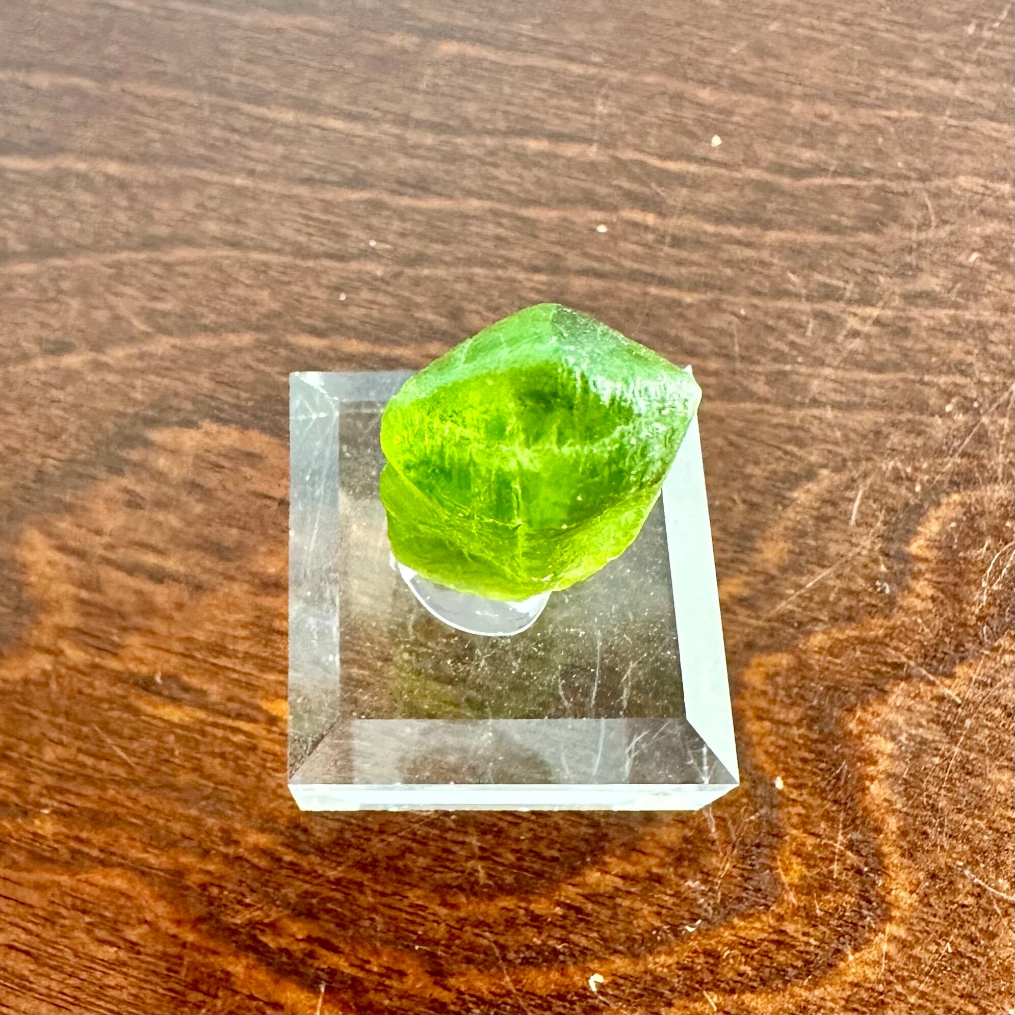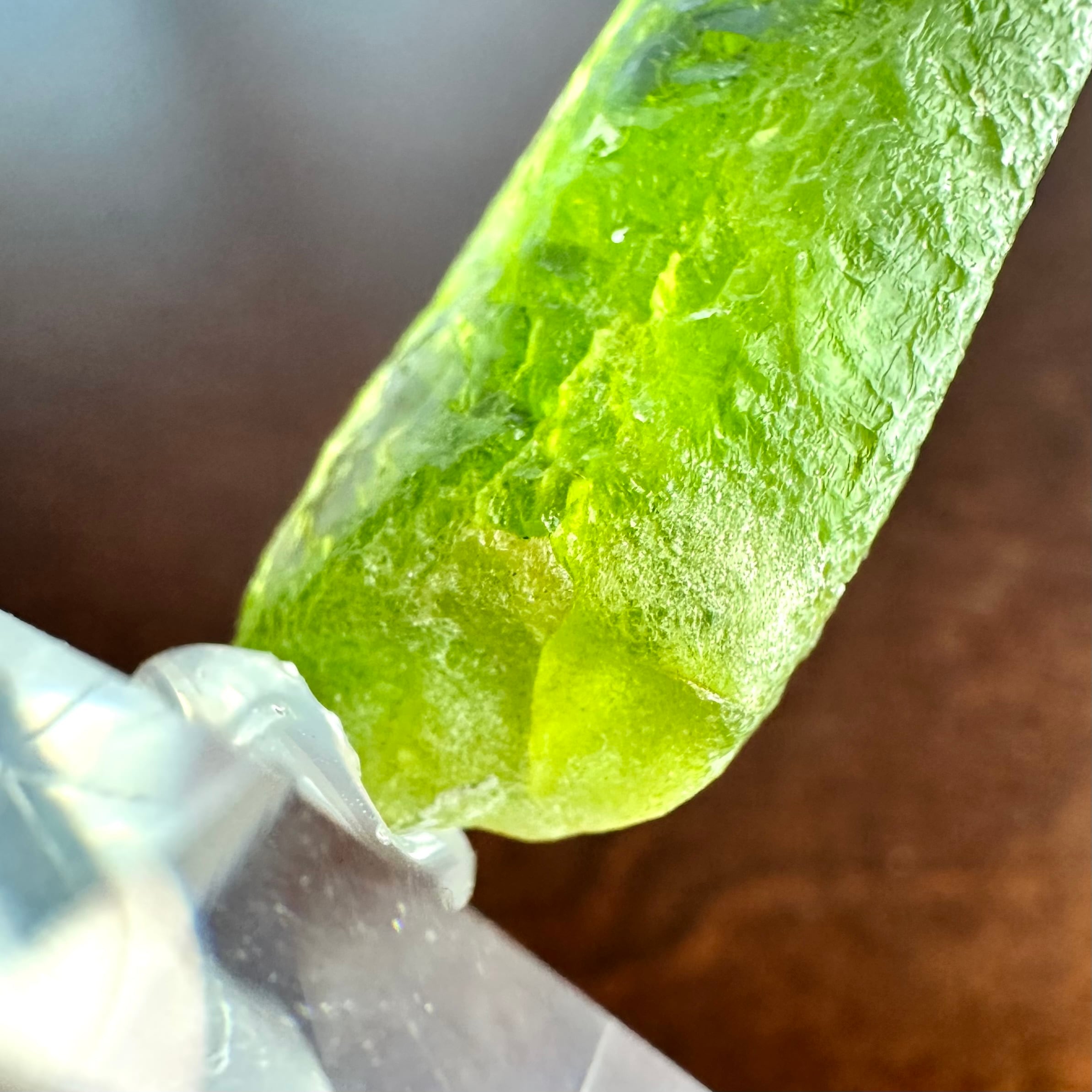 全体的なサイズ感もペリドットとしては大きめで、表面は若干溶けた蝕像気味ながらも透明感からか発色の良さが際立つ結晶です。