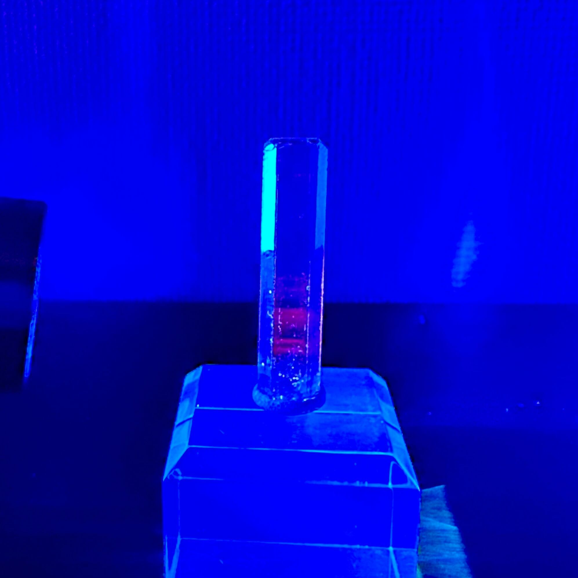 グリーンのバンド部分は赤く蛍光しますが、結晶の透明度が高いこともあって画像では強く映っています、自然光下ではあまり赤みが分からない程度の赤蛍光です。