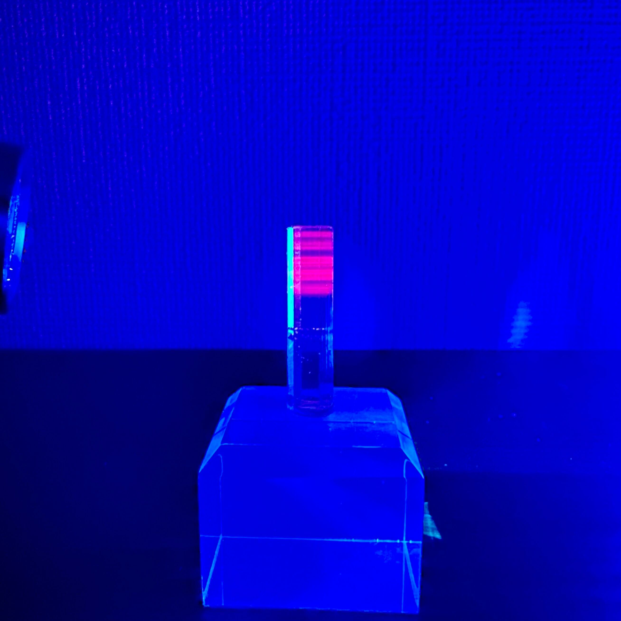 グリーンのバンド部分は赤く蛍光しますが、結晶の透明度が高いこともあって画像では強く映っています、自然光下ではあまり赤みが分からない程度の赤蛍光です。