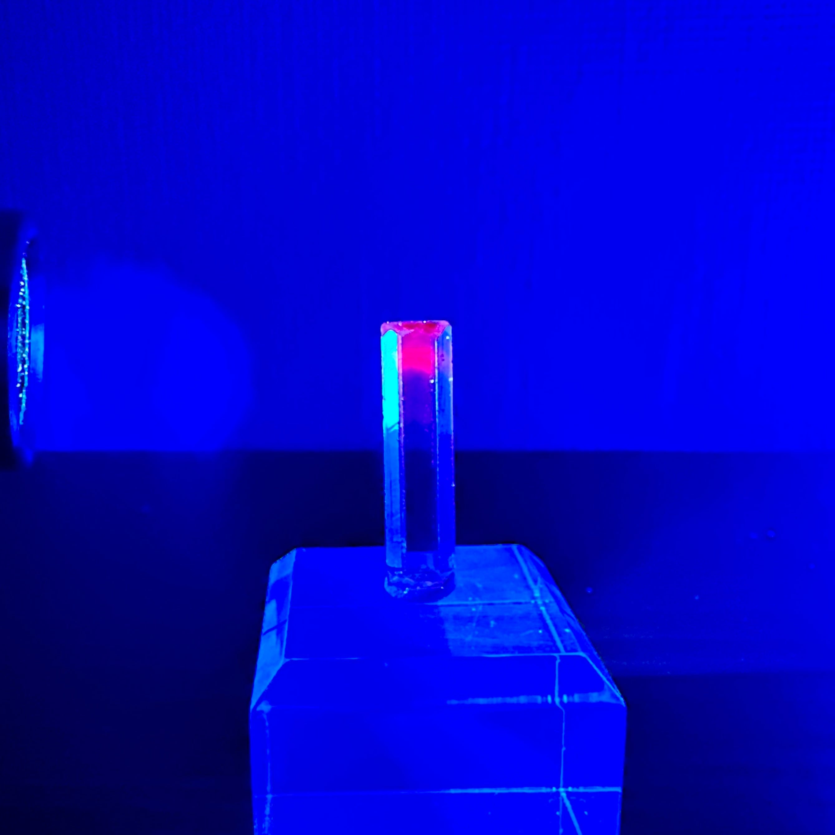 グリーンのバンド部分は赤く蛍光しますが、結晶の透明度が高いこともあって画像では強く映っています、自然光下ではあまり赤みが分からない程度の赤蛍光です。
