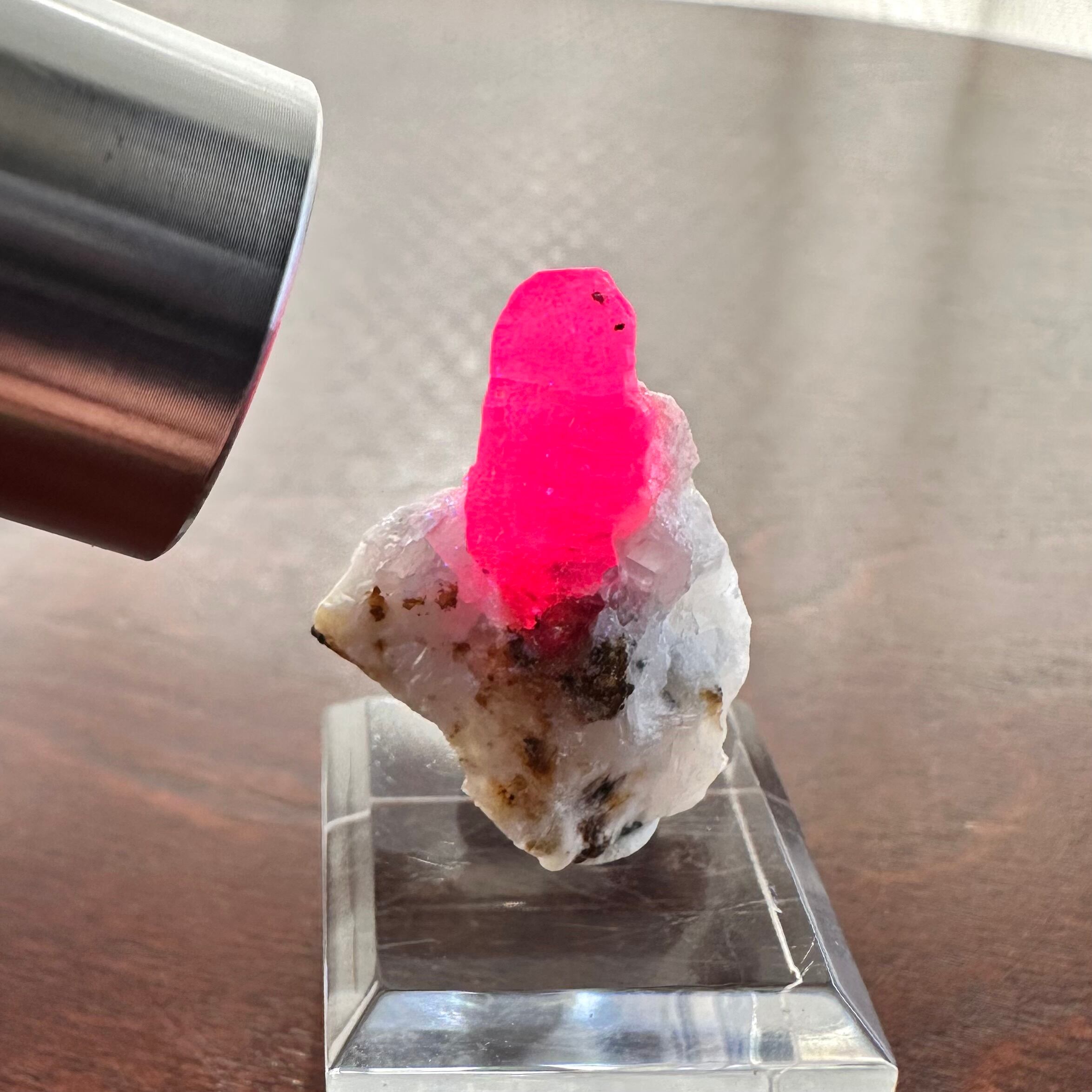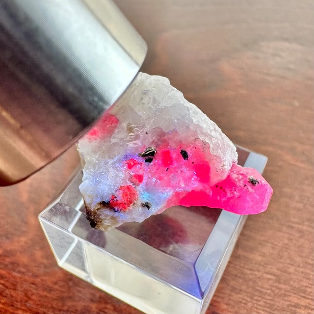 ルビーの露出部は高さ11ミリ程で、強い蛍光が見られ、パイライトも僅かに見られます。
