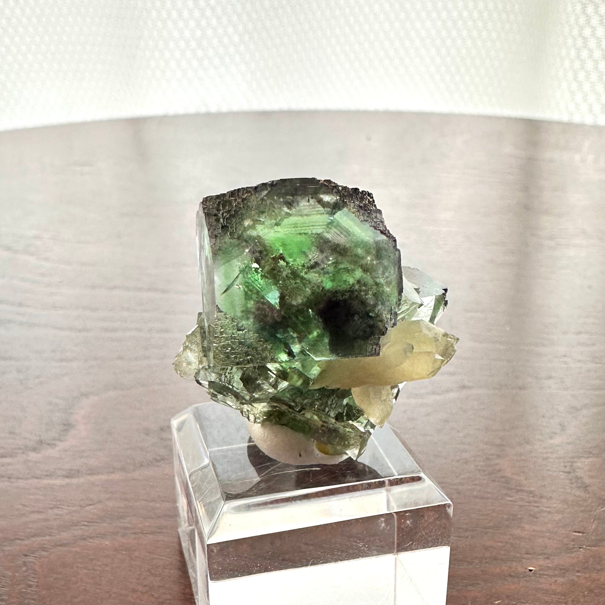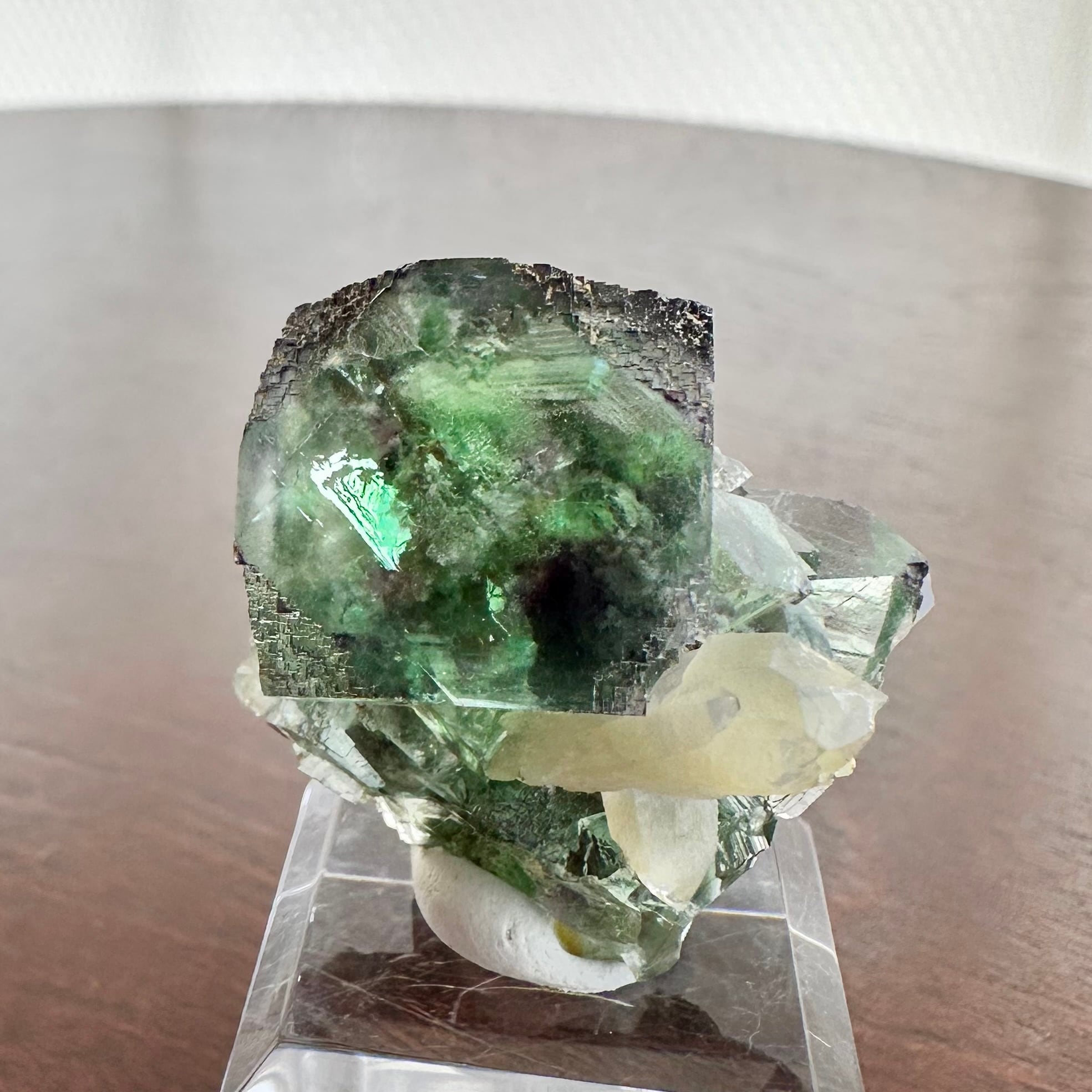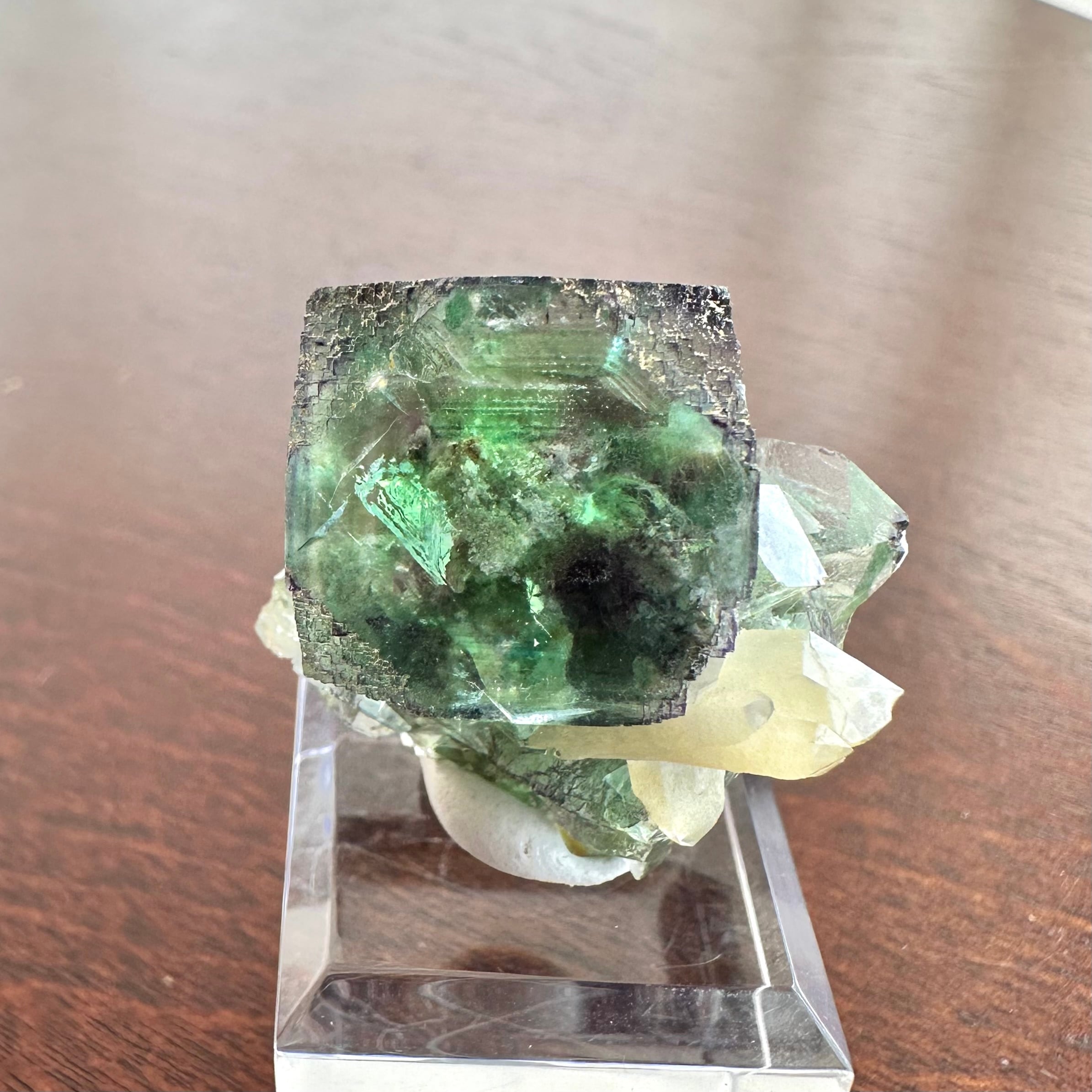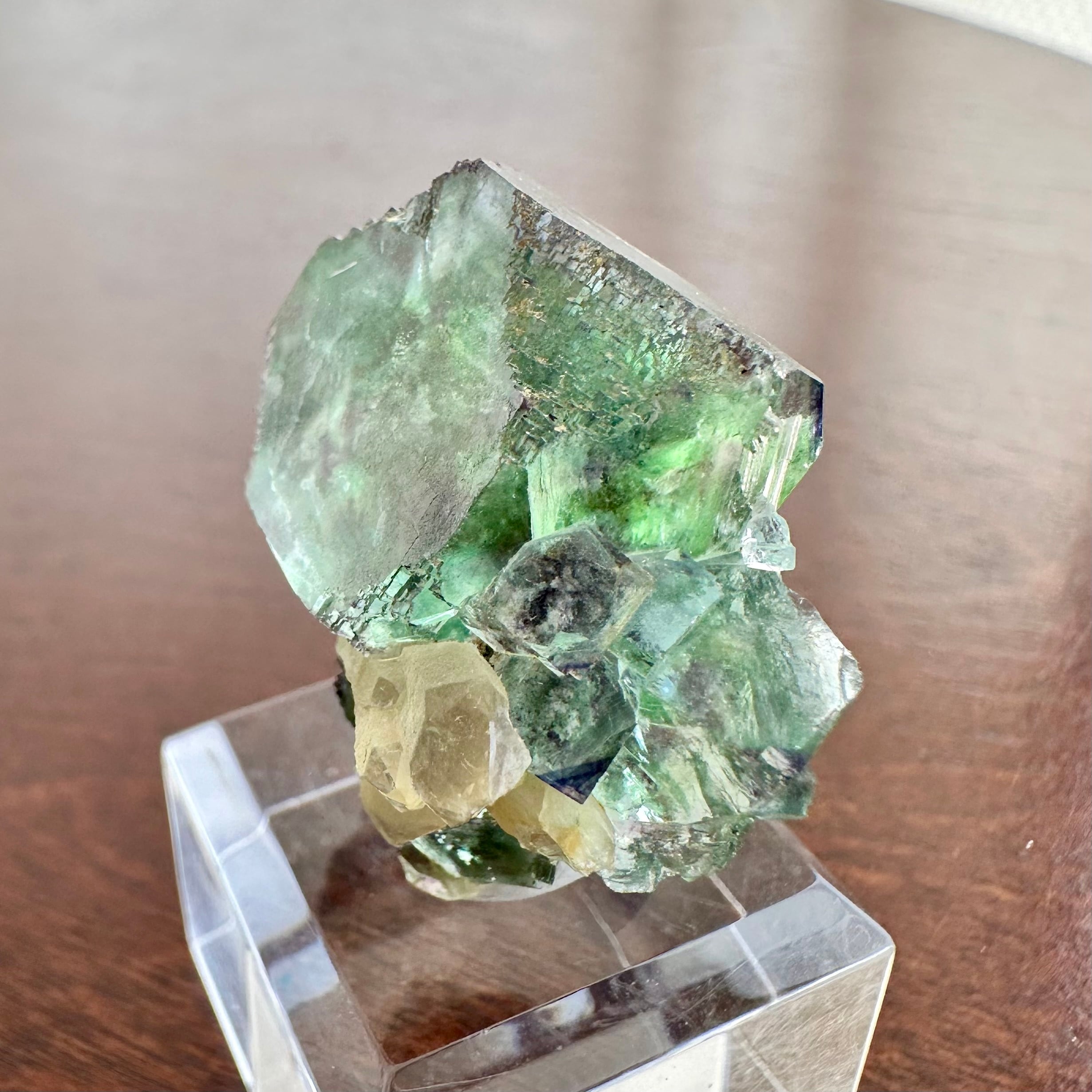 この産地のものとしてはフローライトの結晶面のテリが強く、クリアで結晶内部までしっかりと透けて見える良結晶で、サムネイルサイズながら全体的なボリュームが感じられる標本です。