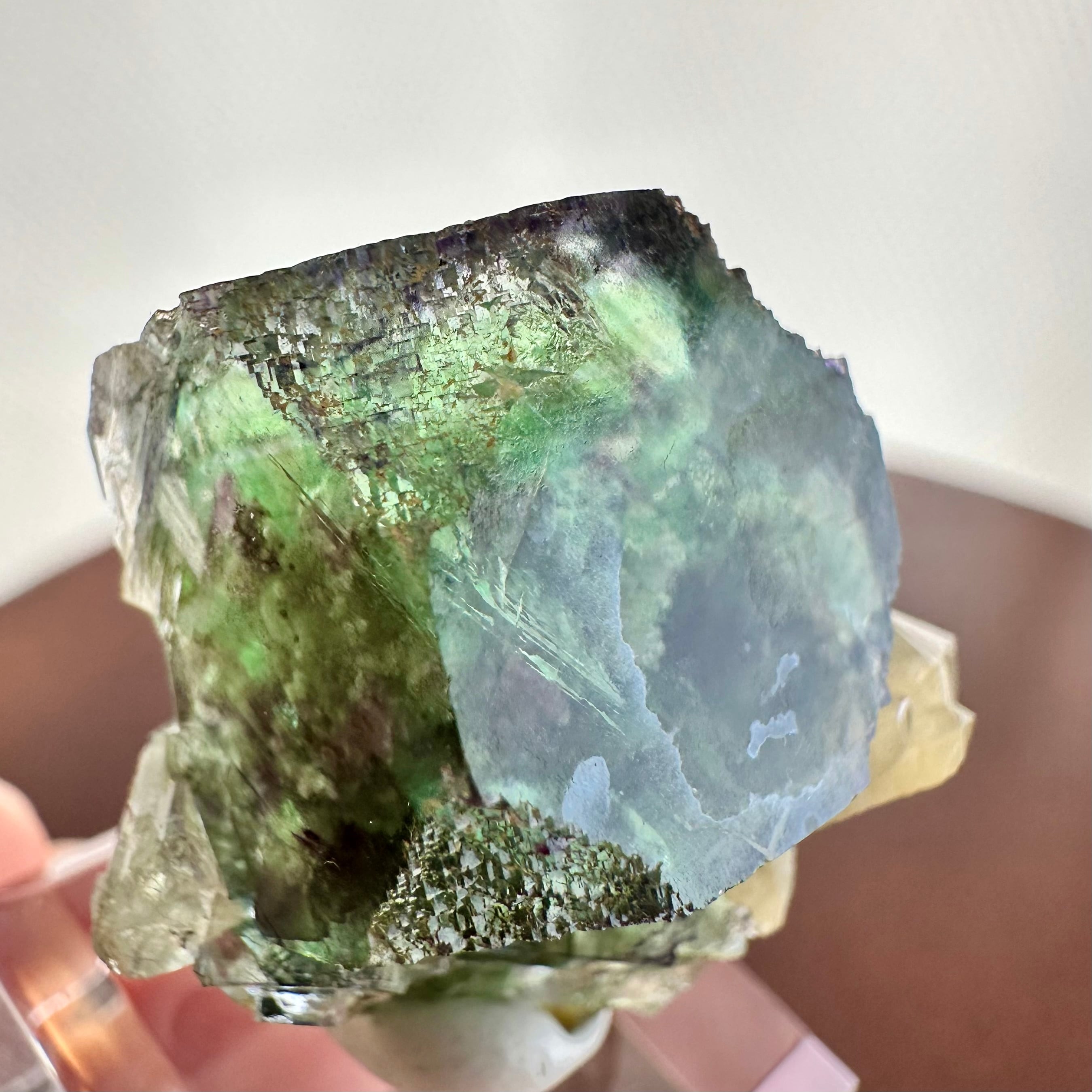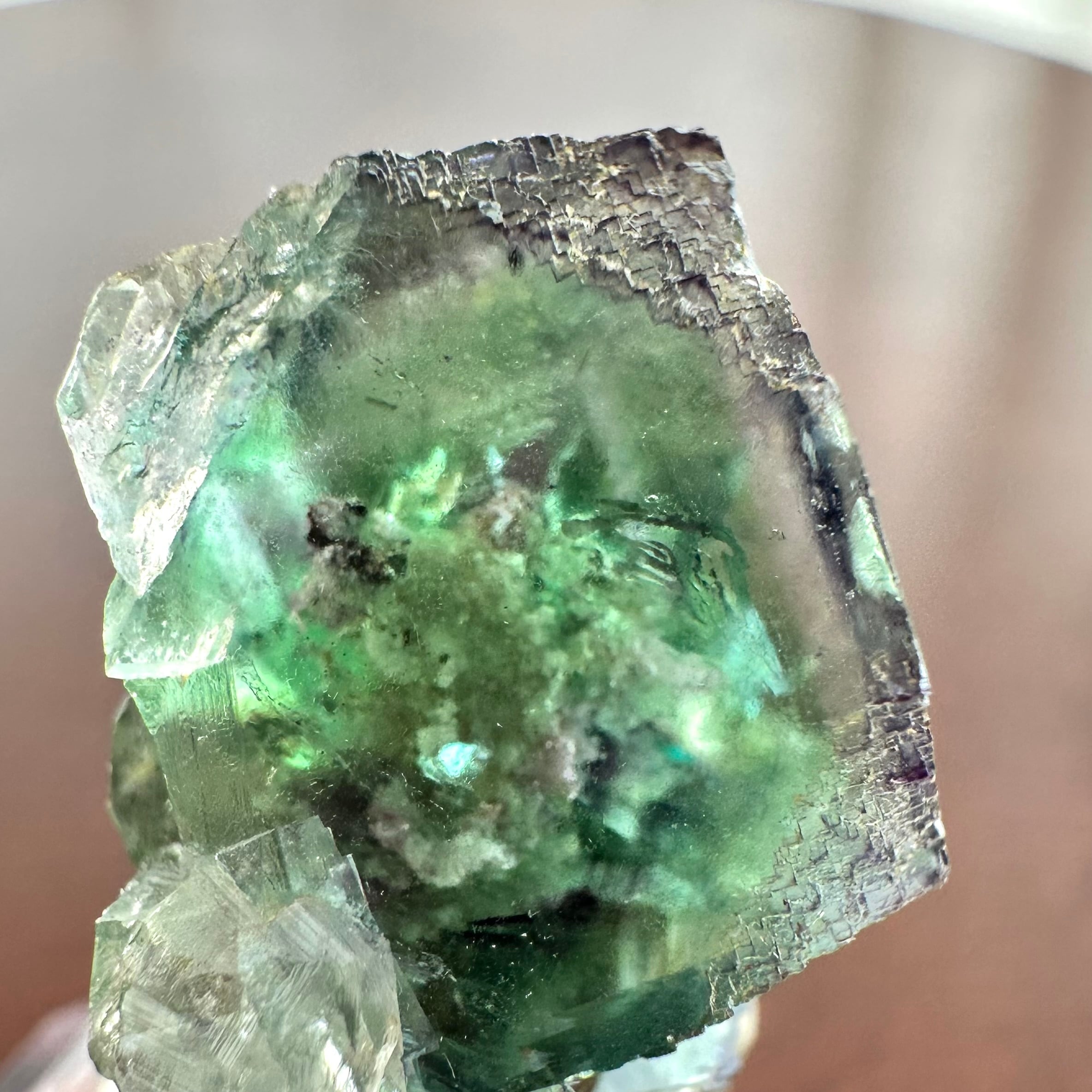 結晶のエッジ部分は細かいステップ状となっていて、グリーン以外のブルーやパープル、カラーレスの部分も見て取れます。