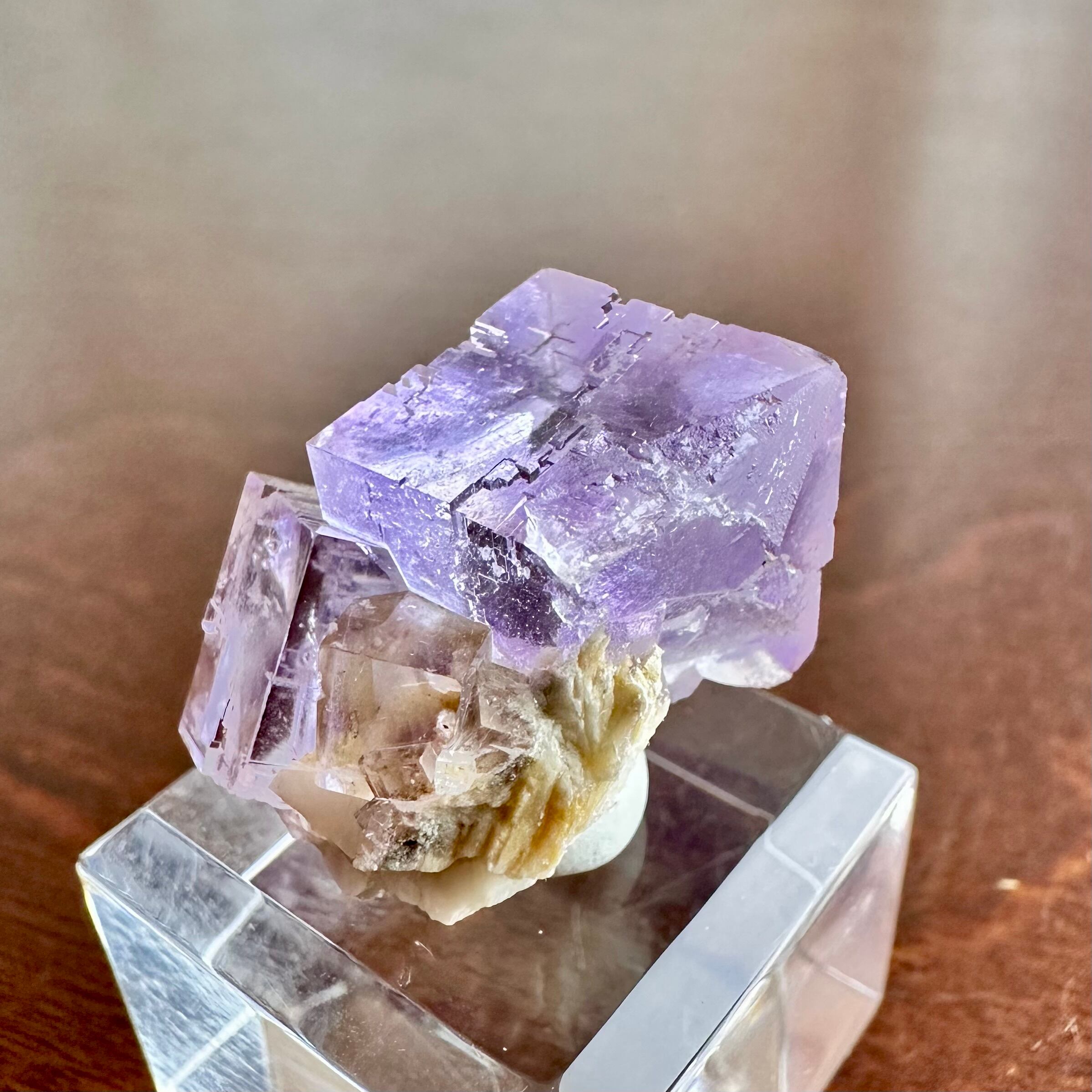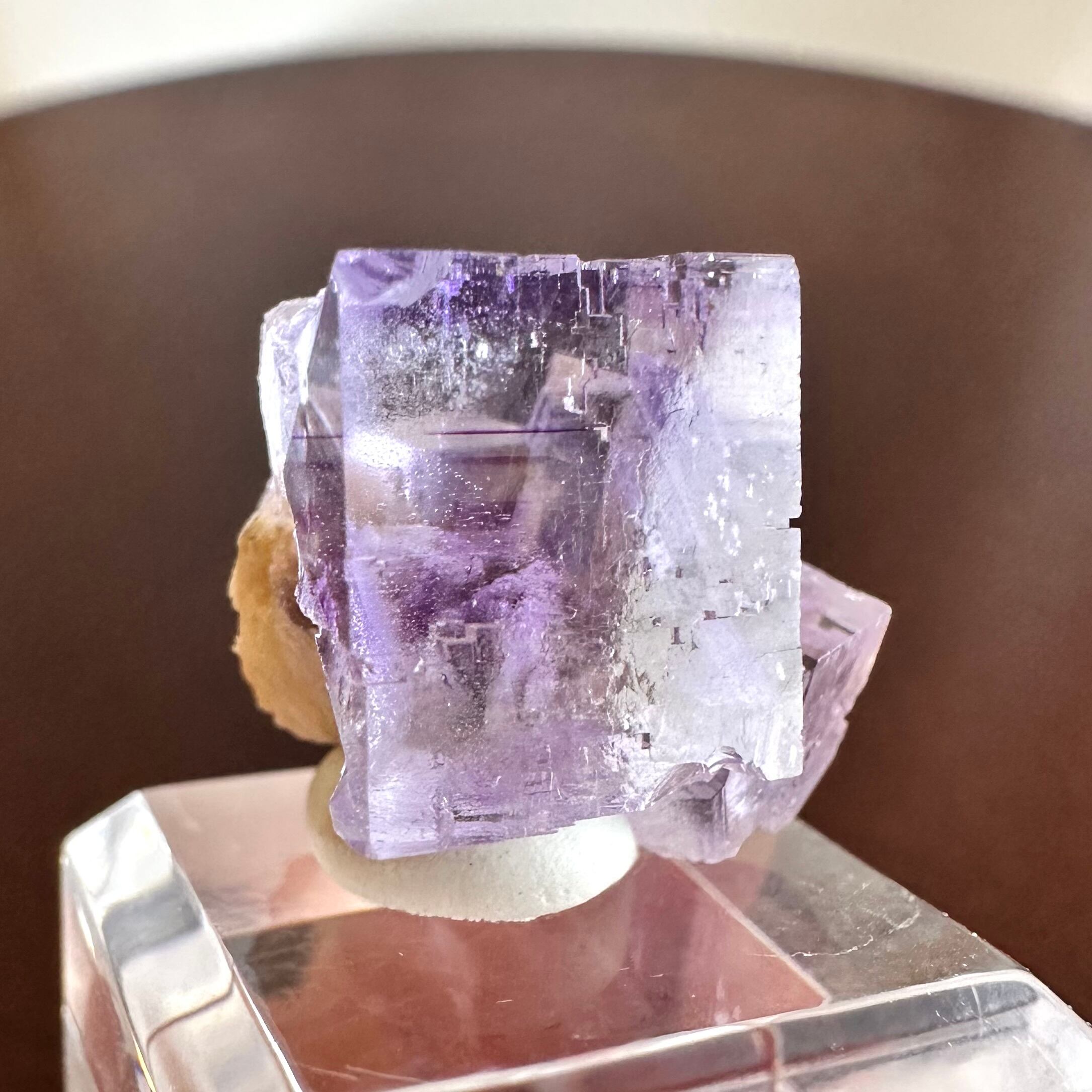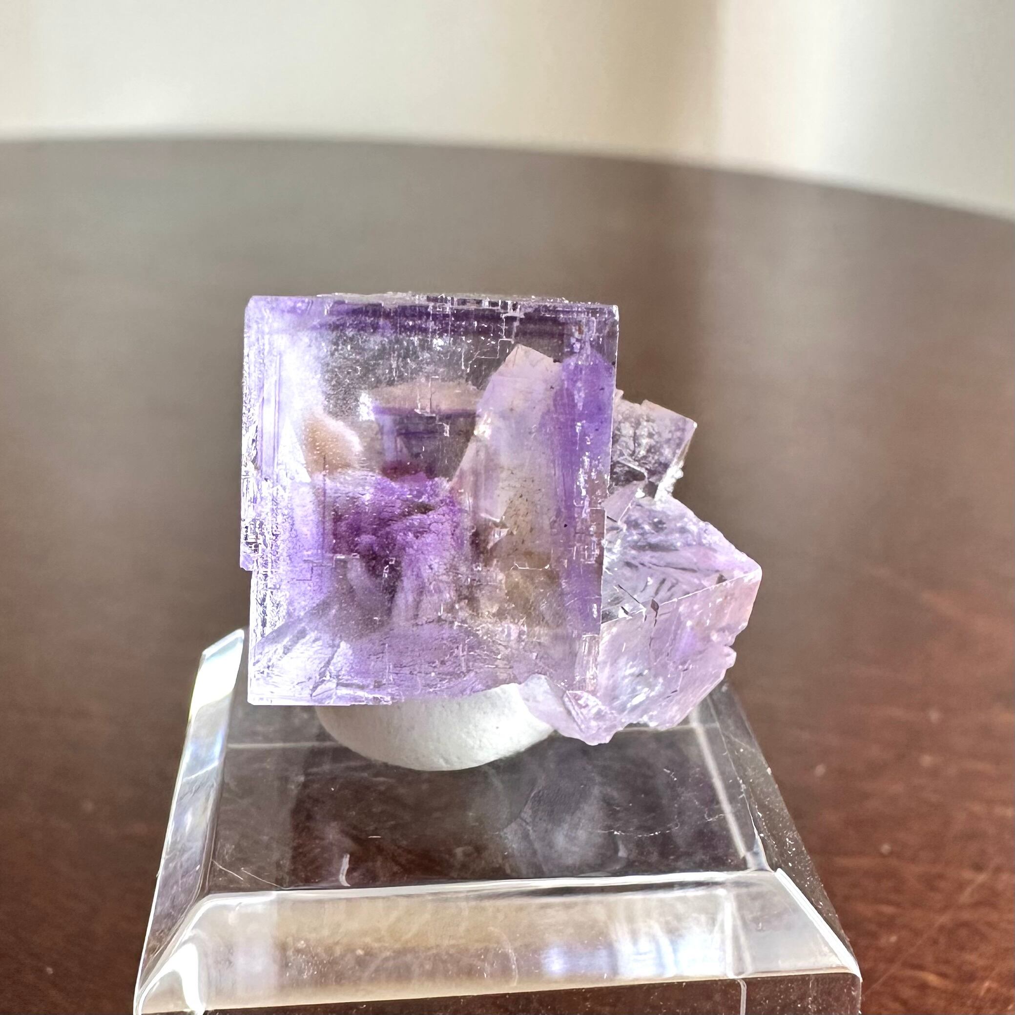 ベルベス産の特徴を捉えた美しいサムネイル標本で、エッジにダメージはありますがガラス光沢に近い結晶面や淡いパープルとパキっと入るゾーニングの濃いパープルとの対比が美しい標本です。