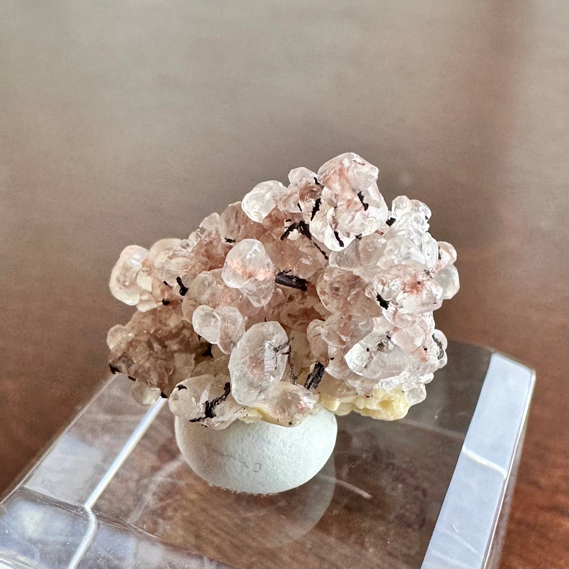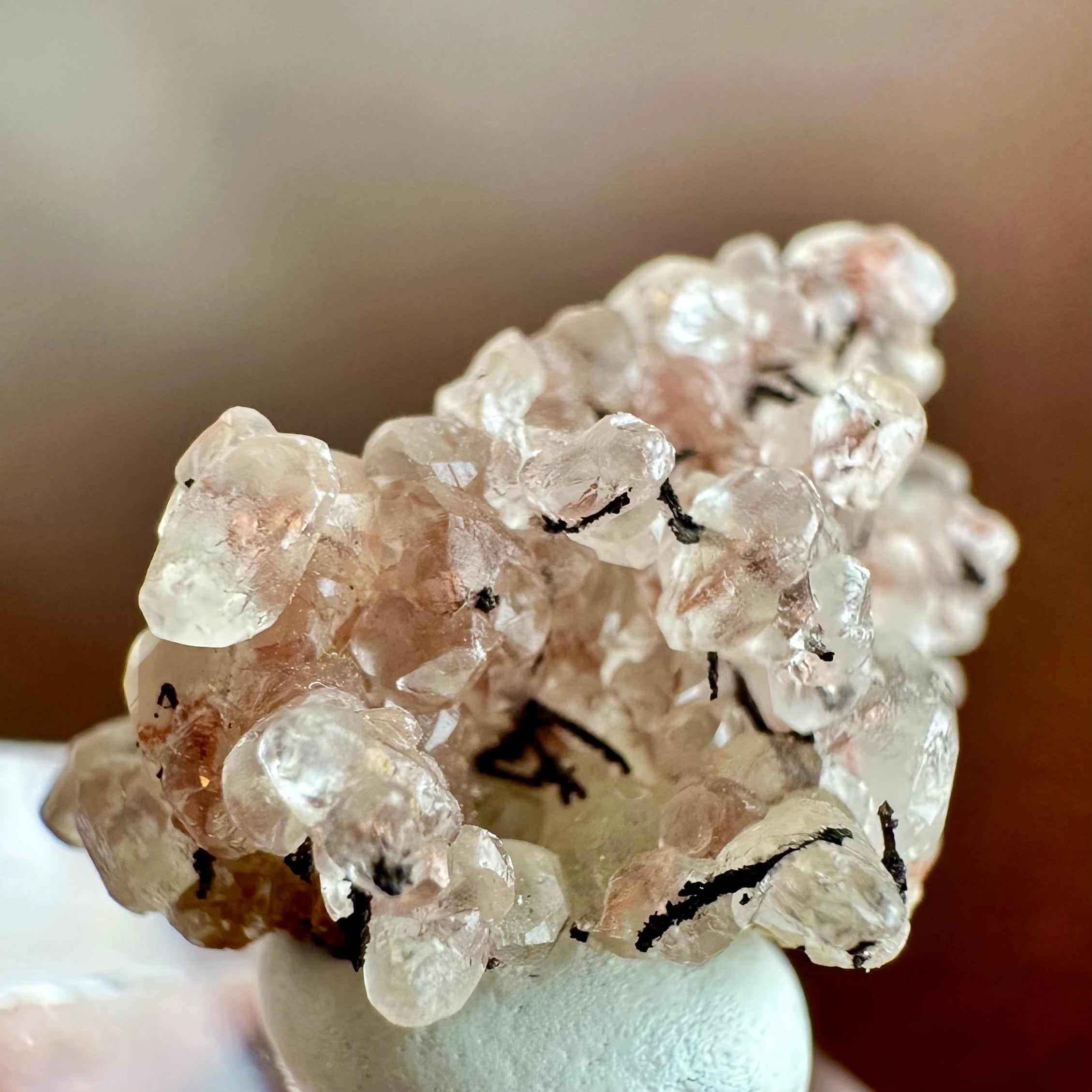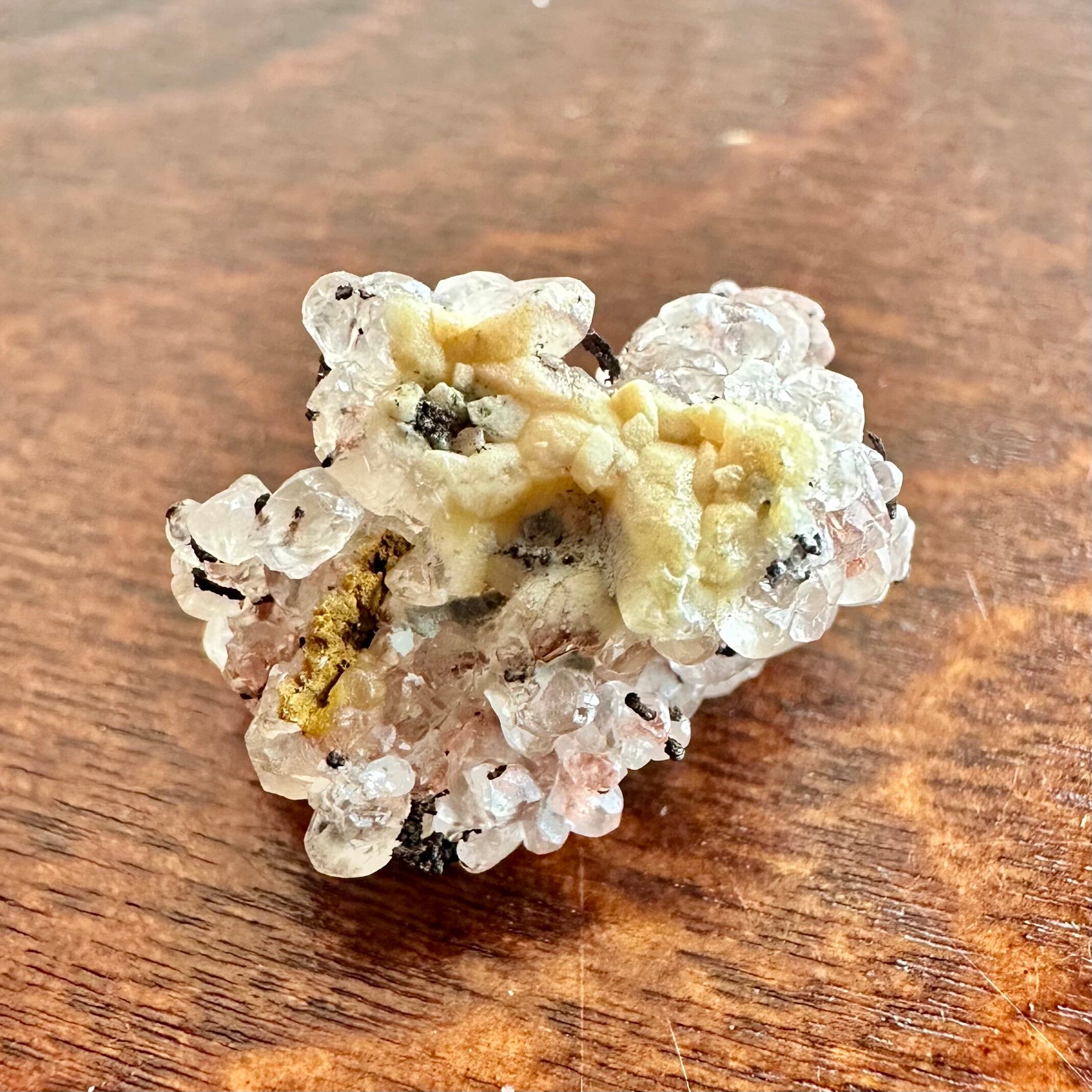 上記の点を鑑みても、粒状で細かなカルサイトの結晶内部に鮮やかな発色のコッパーが残る標本で、ユニークさと美しさのあるサムネイル標本です。