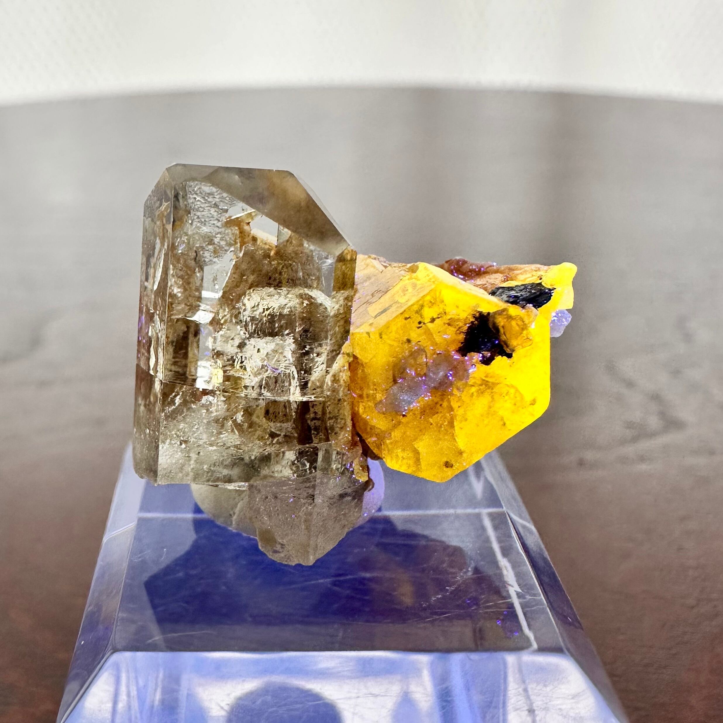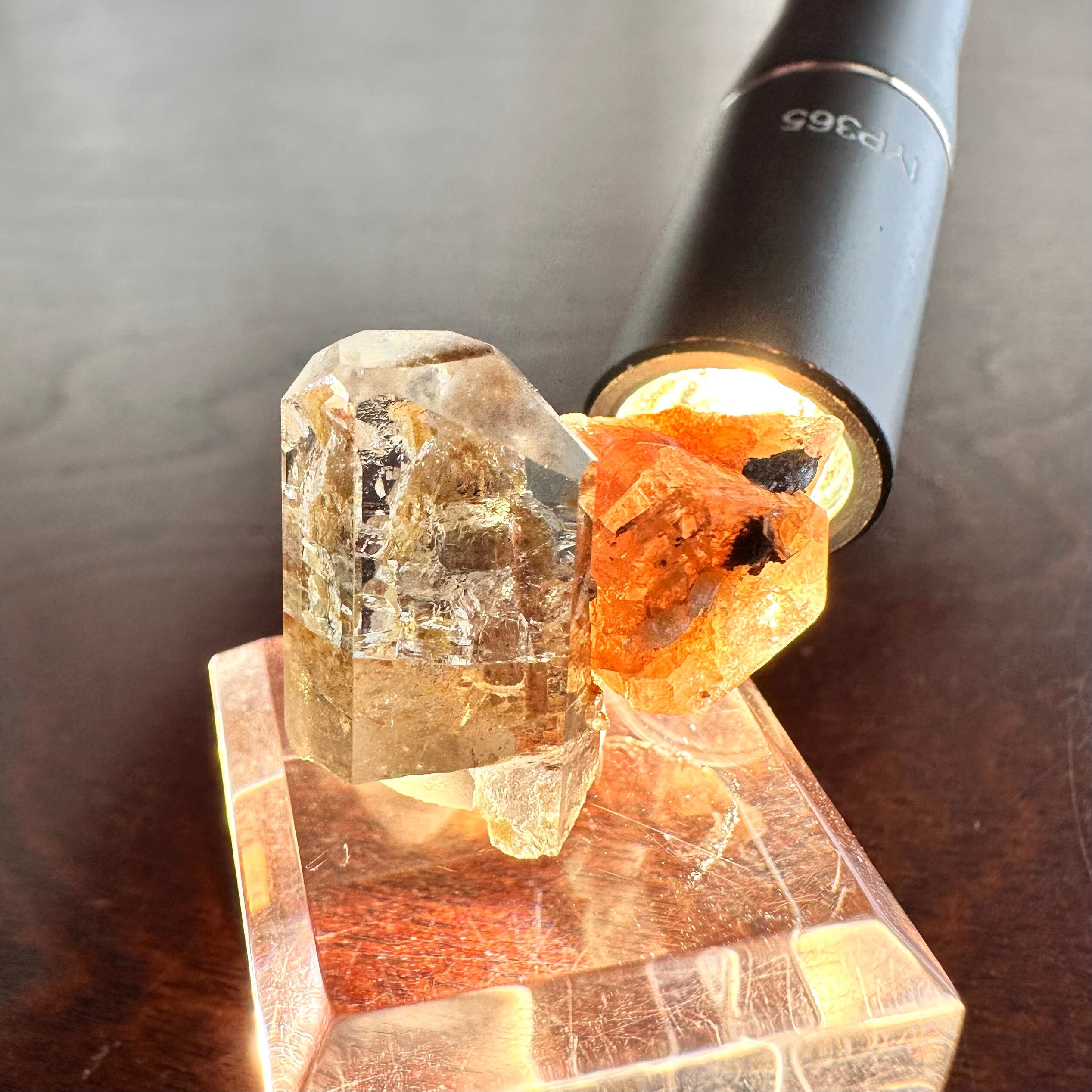 カラーレスのトパーズはクリアさが際立った結晶でテリもあり、アパタイトは透明度こそ程々ながら紫外線光下で明るいイエローの蛍光が見られます。
