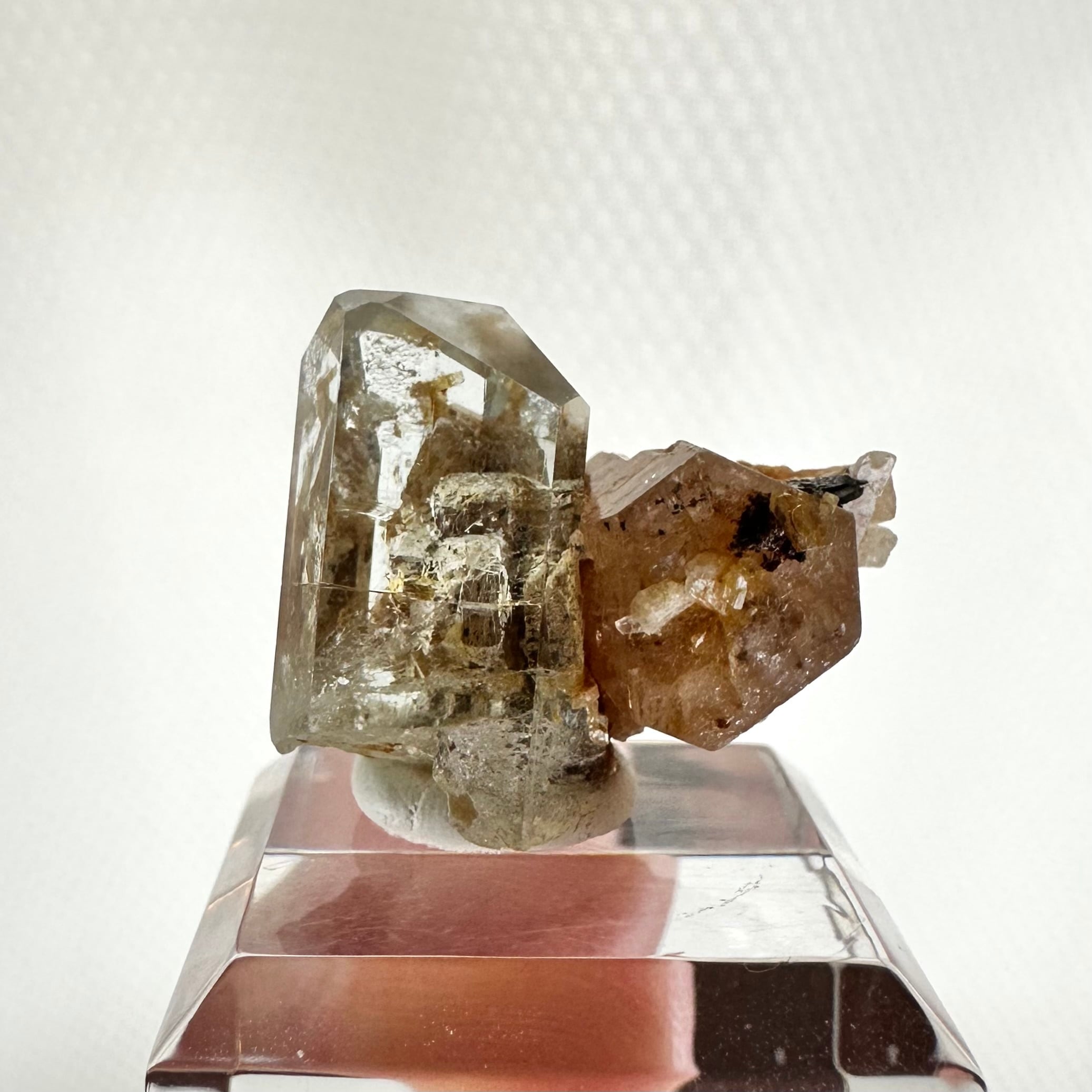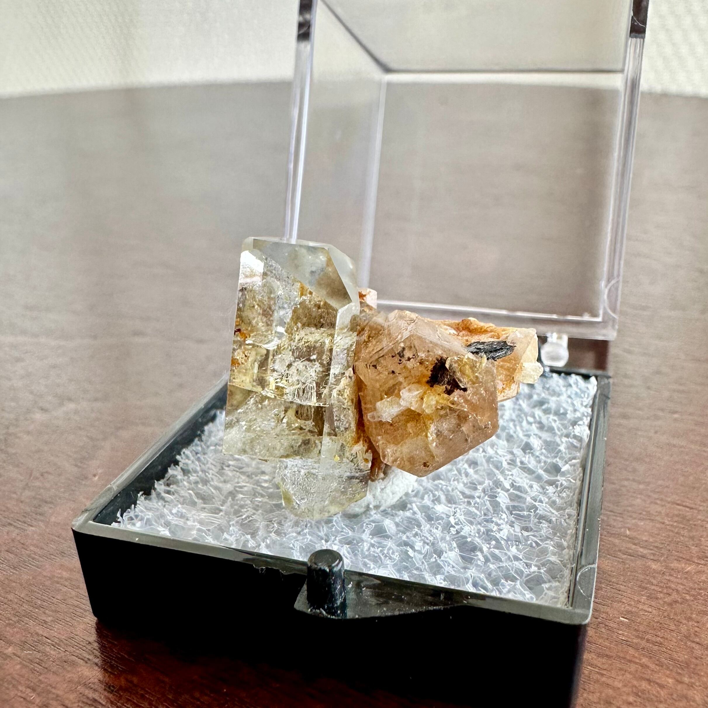 トパーズとピンクアパタイトのコンビネーションです、サムネイルサイズで可愛らしくまとまった標本です。