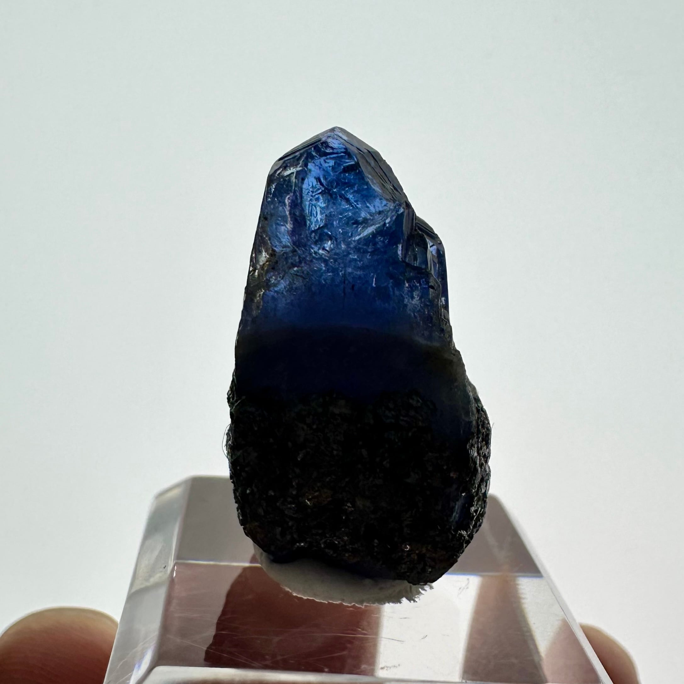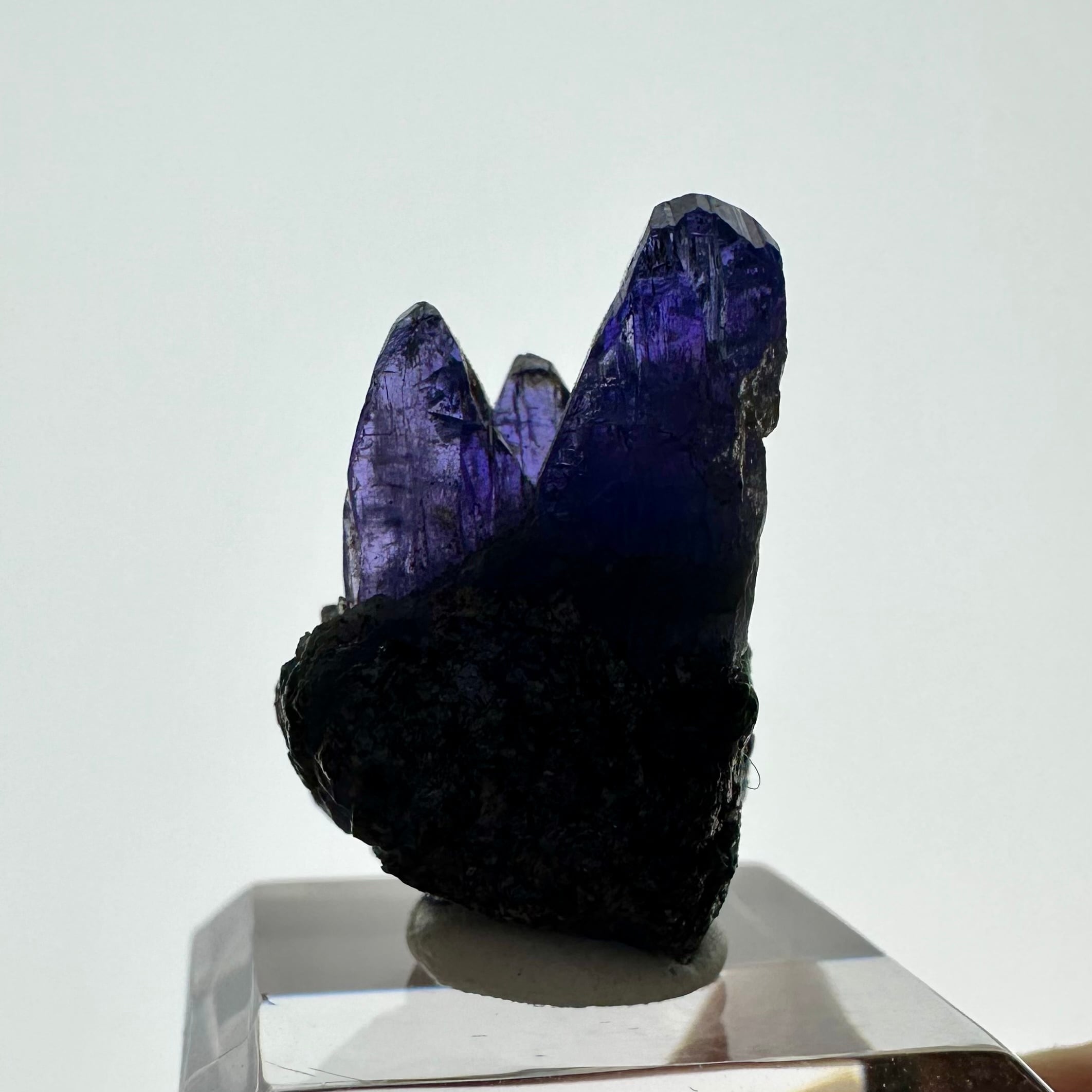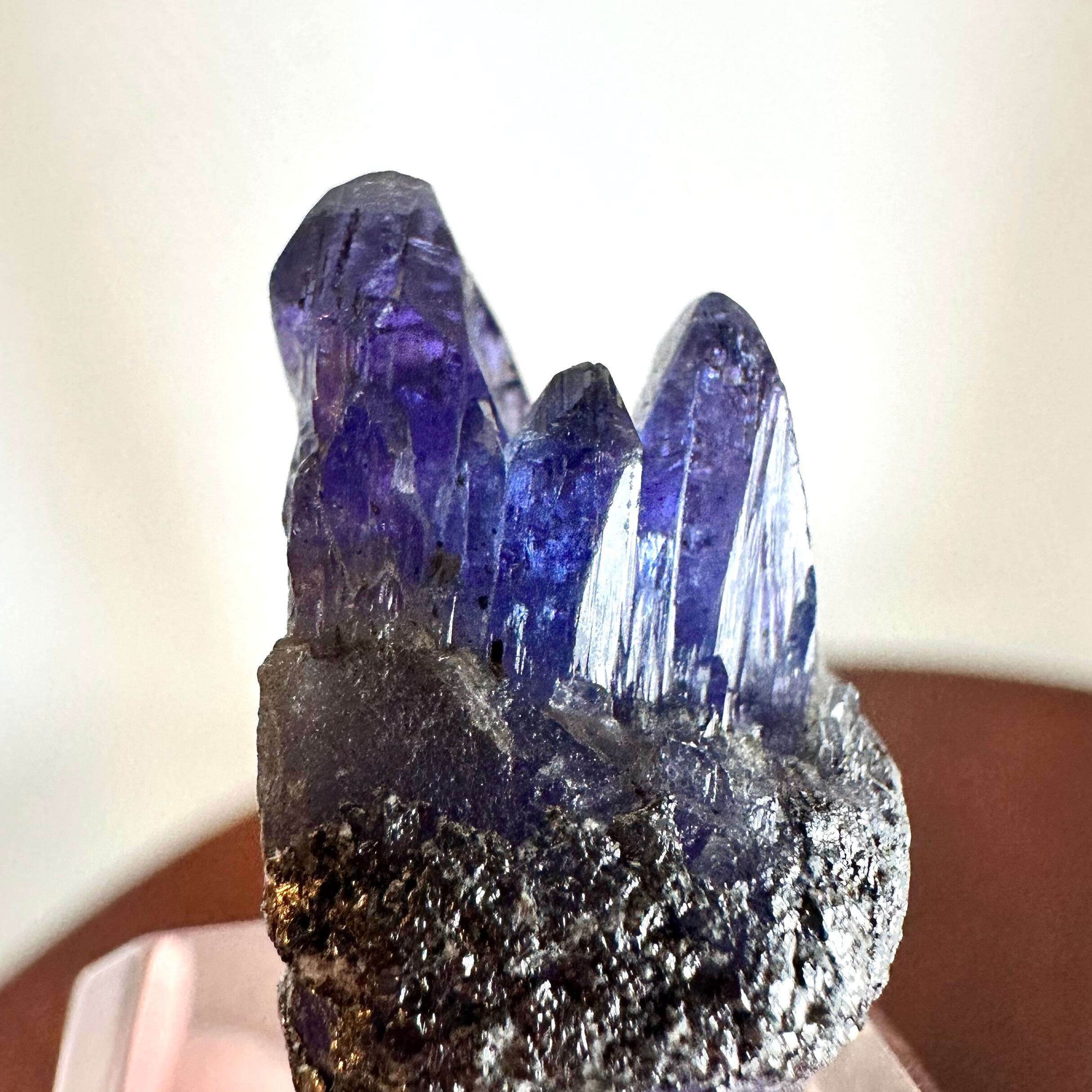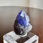 タンザナイトは側面の結晶には剥離したようなダメージも見られますが、透明感と発色の良さは良好で多色性もあり、艶のあるテリ感も抜群です。