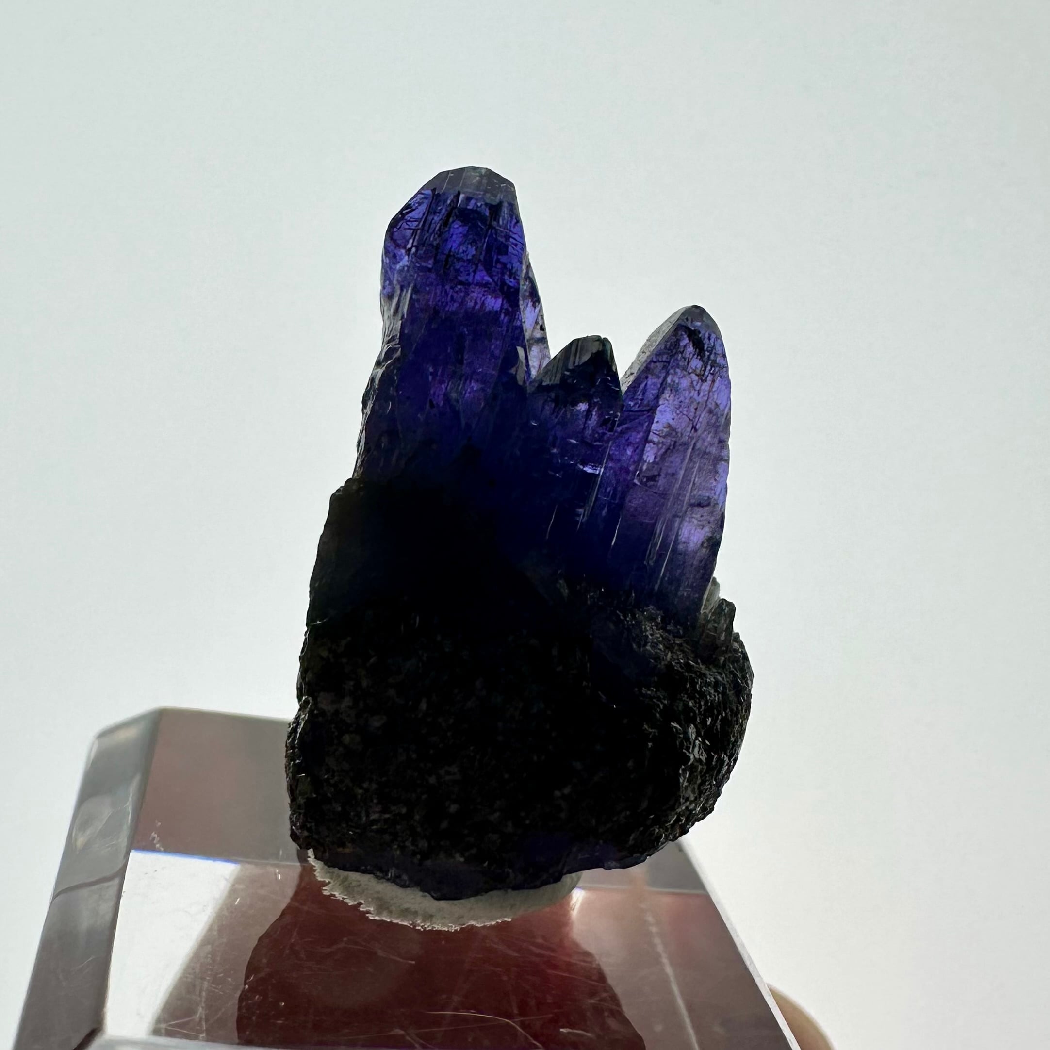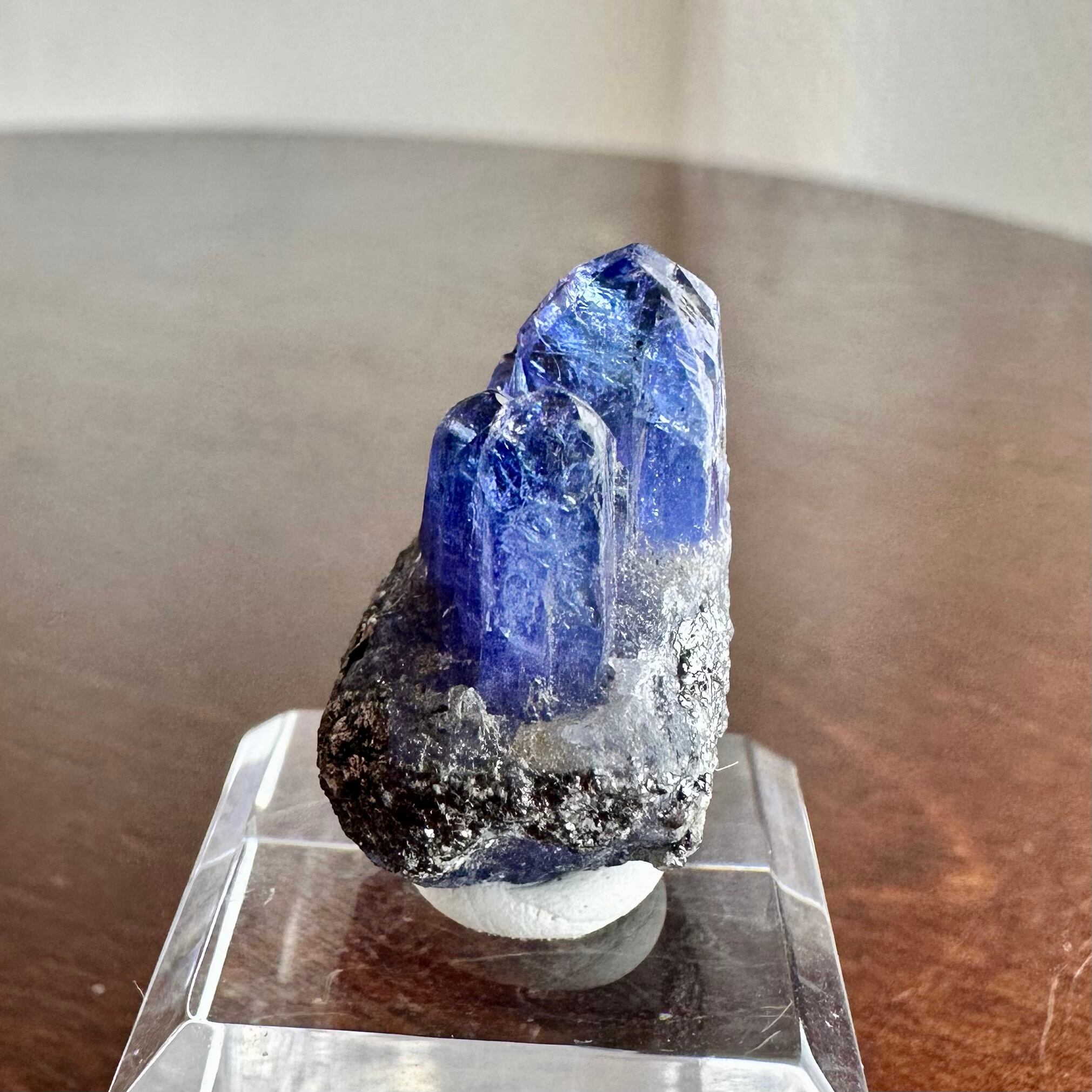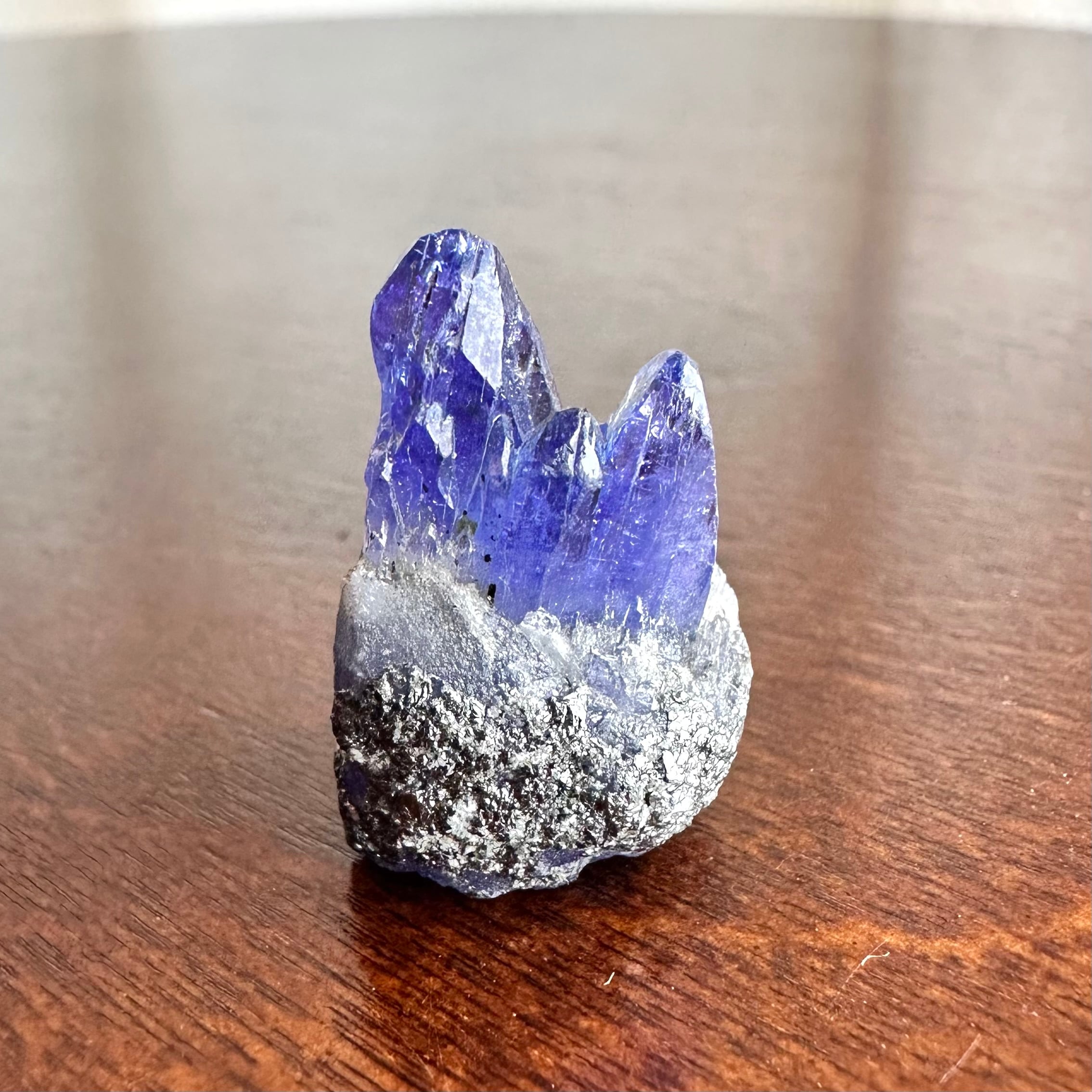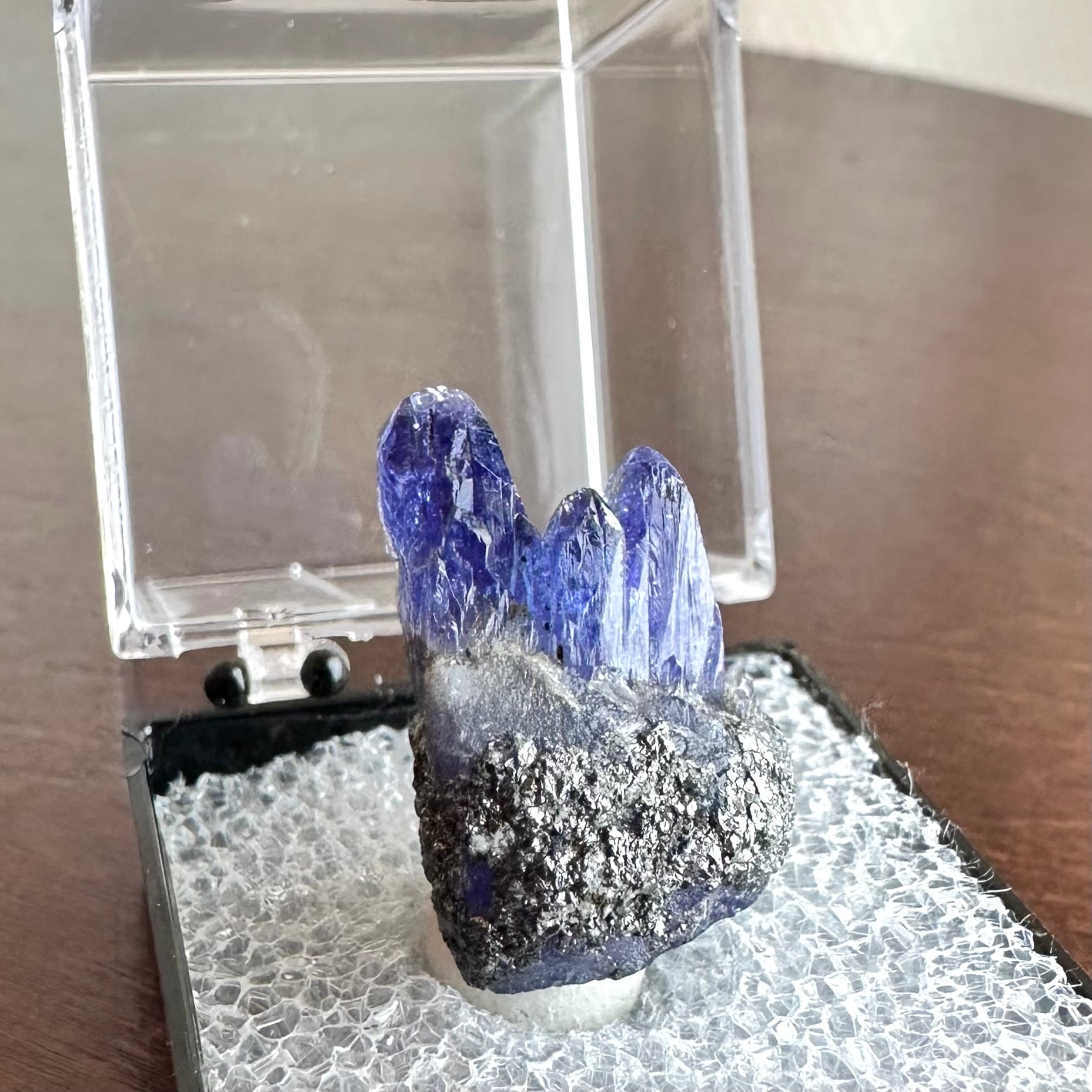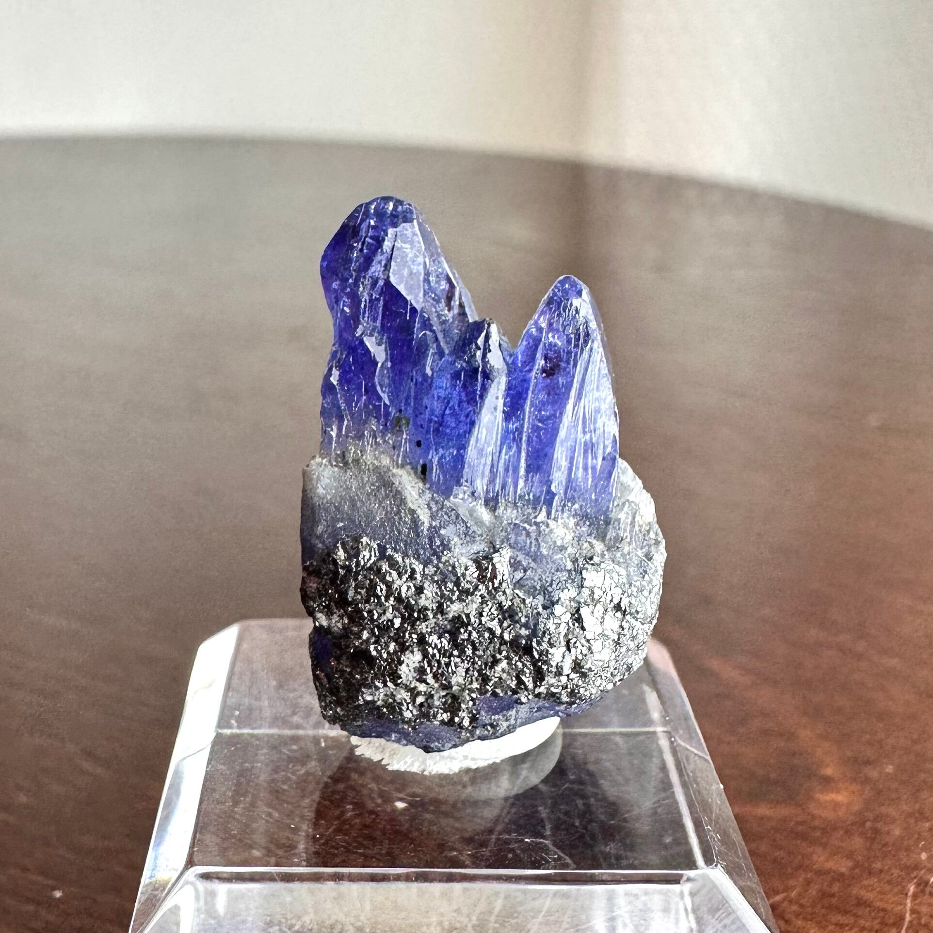 タンザナイトが連なり、標本下部のグラファイトがまるで台座の様な、非常に座りのいいタンザニア産の標本です。