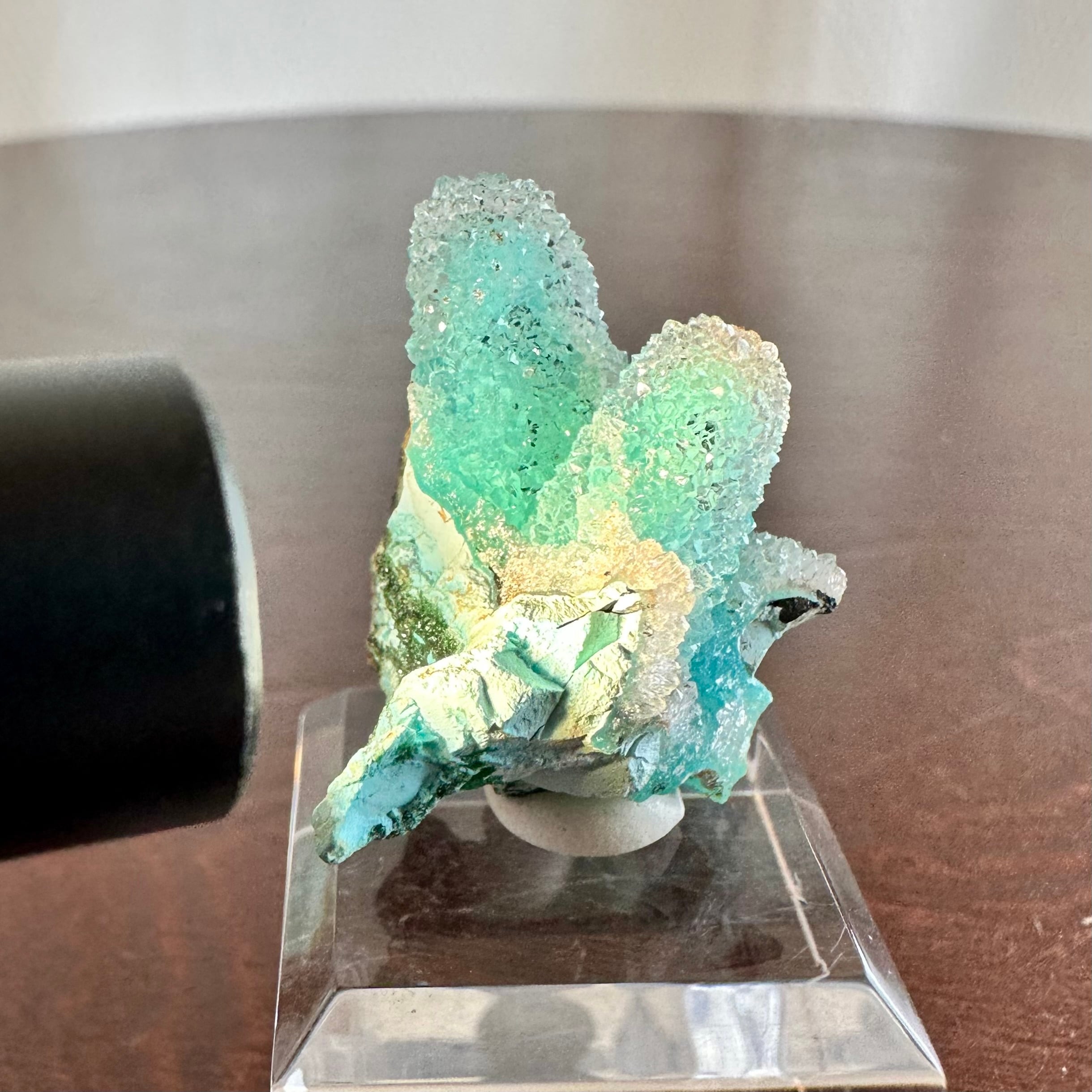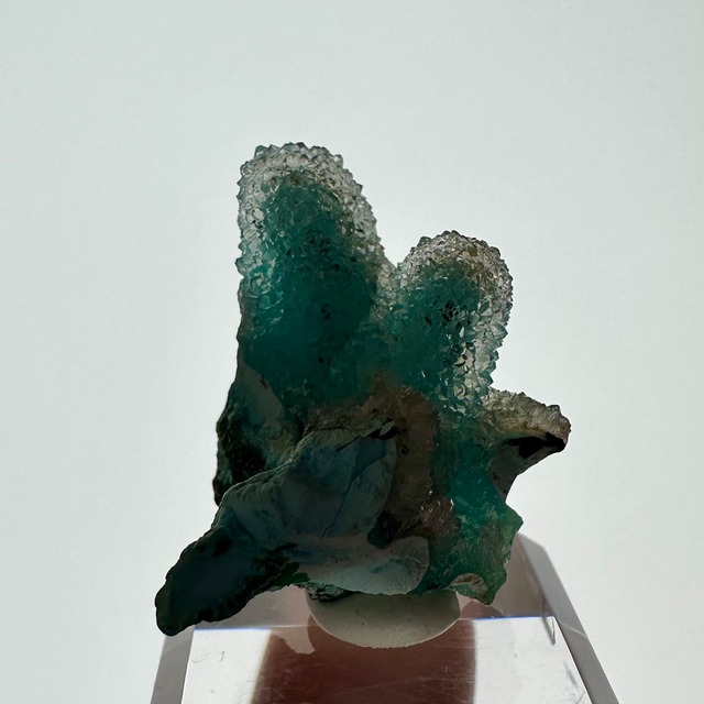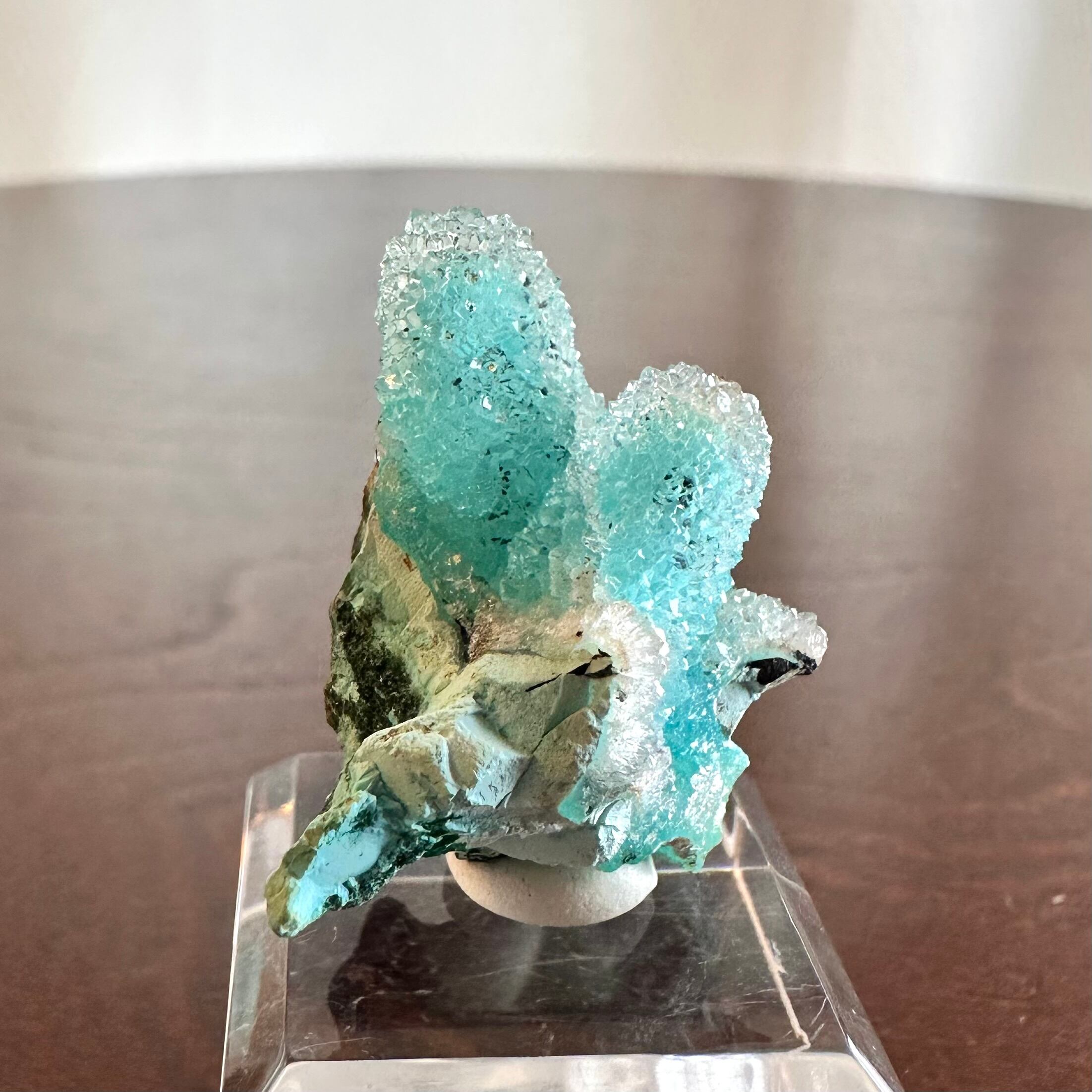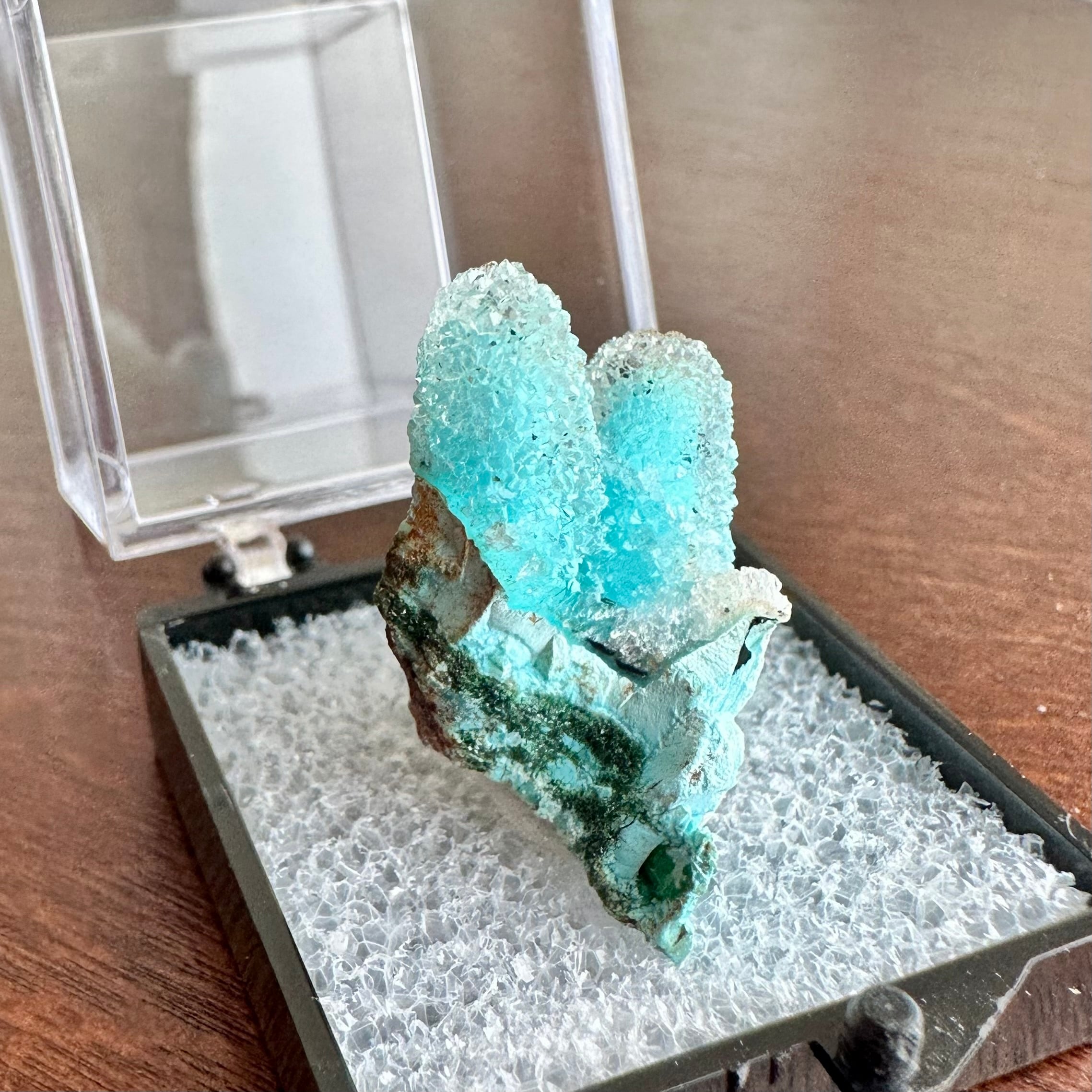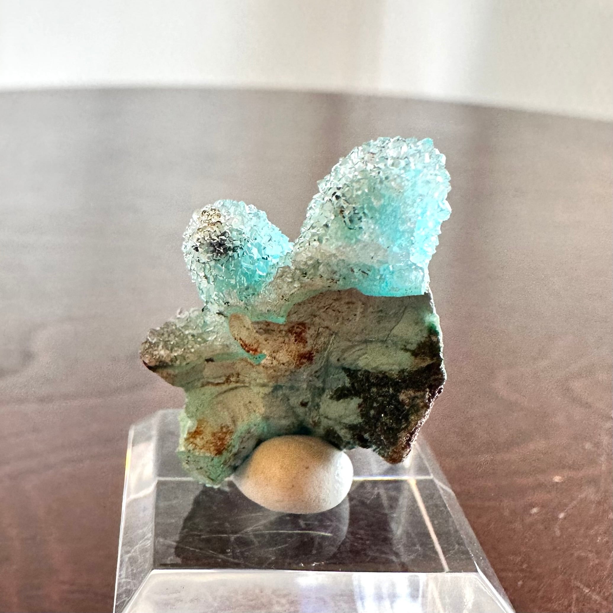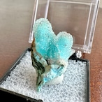 山型に二つ並んだクリソコラのフォルムが可愛らしい標本で、その全体をしっかりとクォーツがカバーすることできらめきが感じられる、サムネイルながら存在感抜群の標本です。