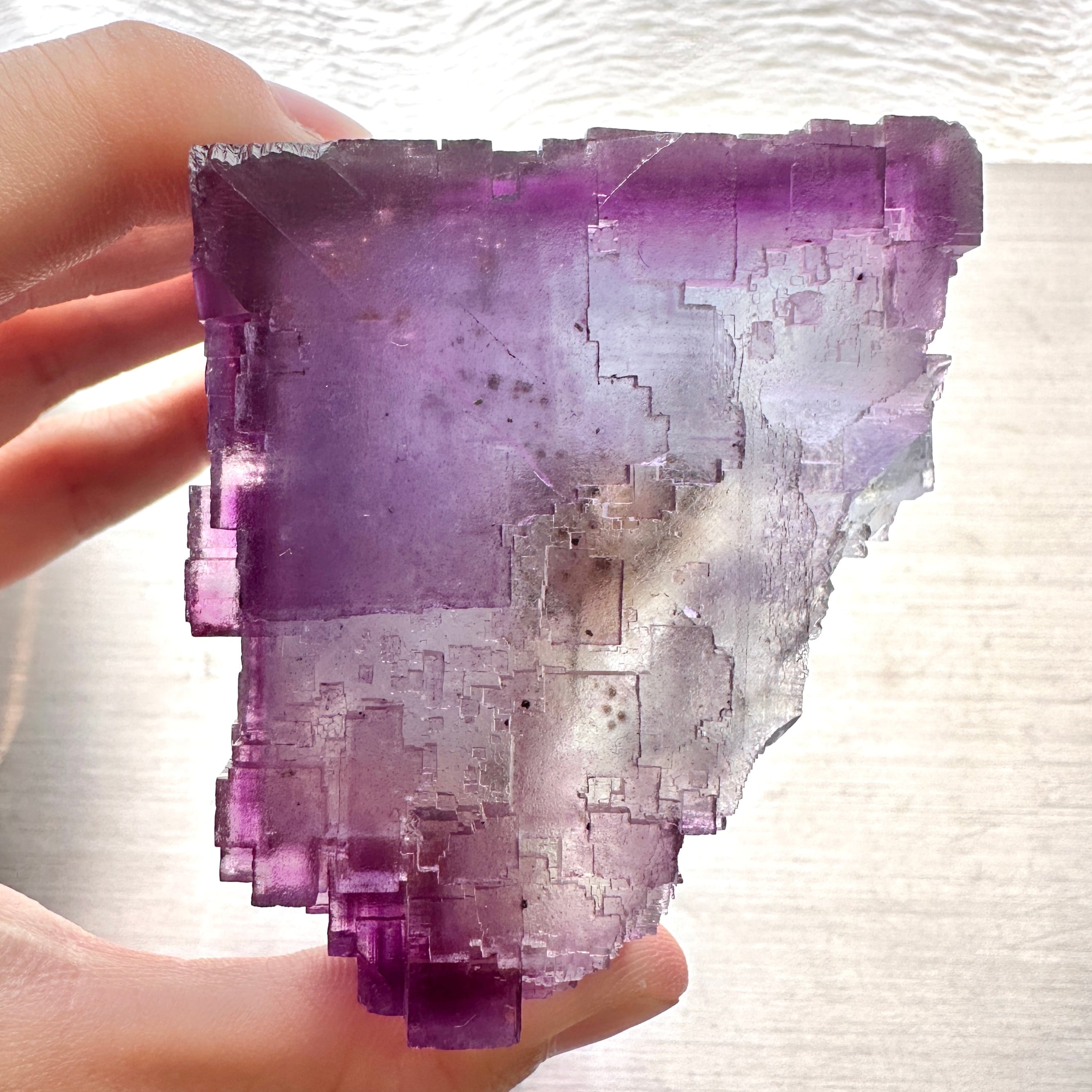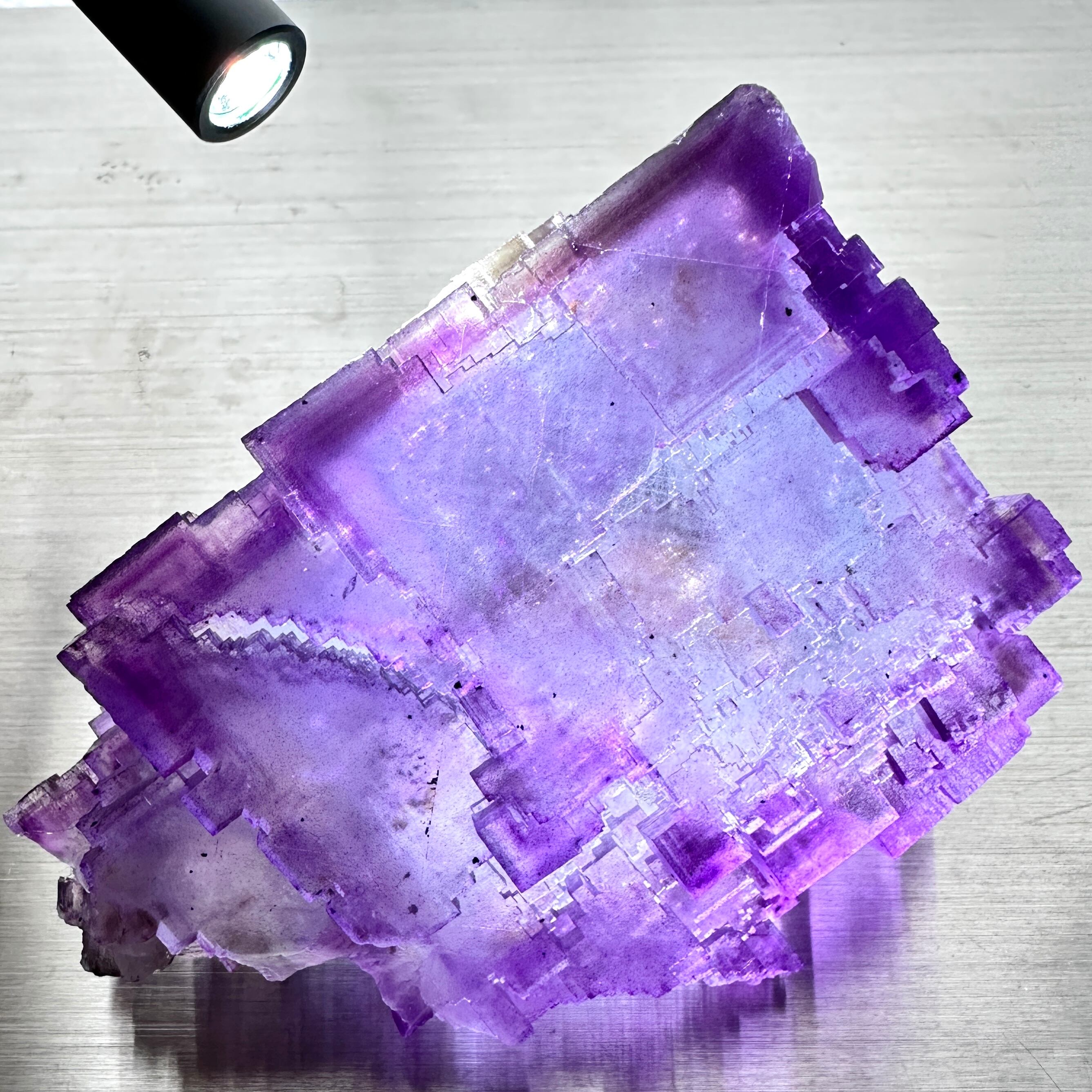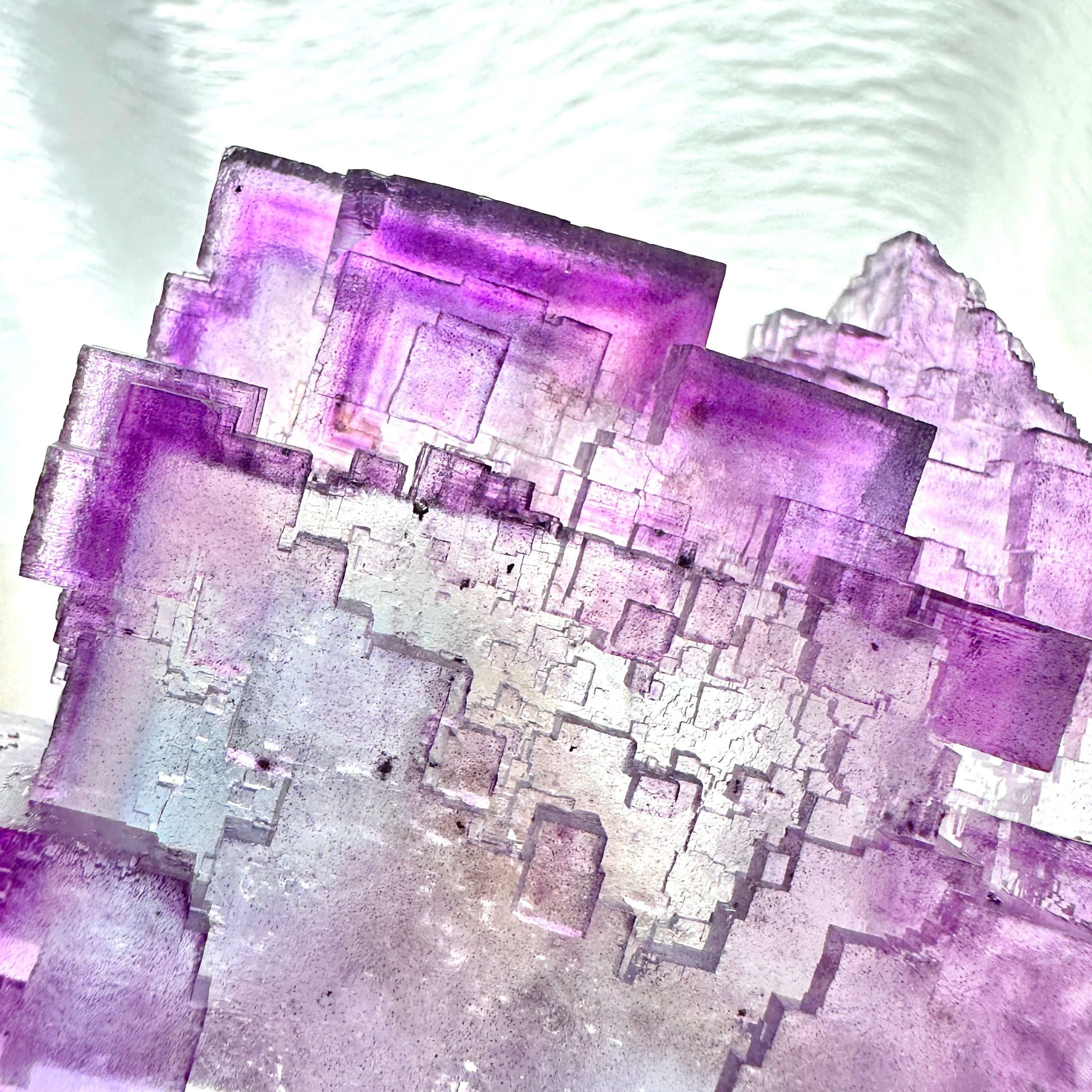 濃いパープルのゾーニングや、内部に僅かに見られる淡いブルーやイエロー混じりのユニークな発色は自然光下でも明瞭で、透過光下では更に鮮やかです。
