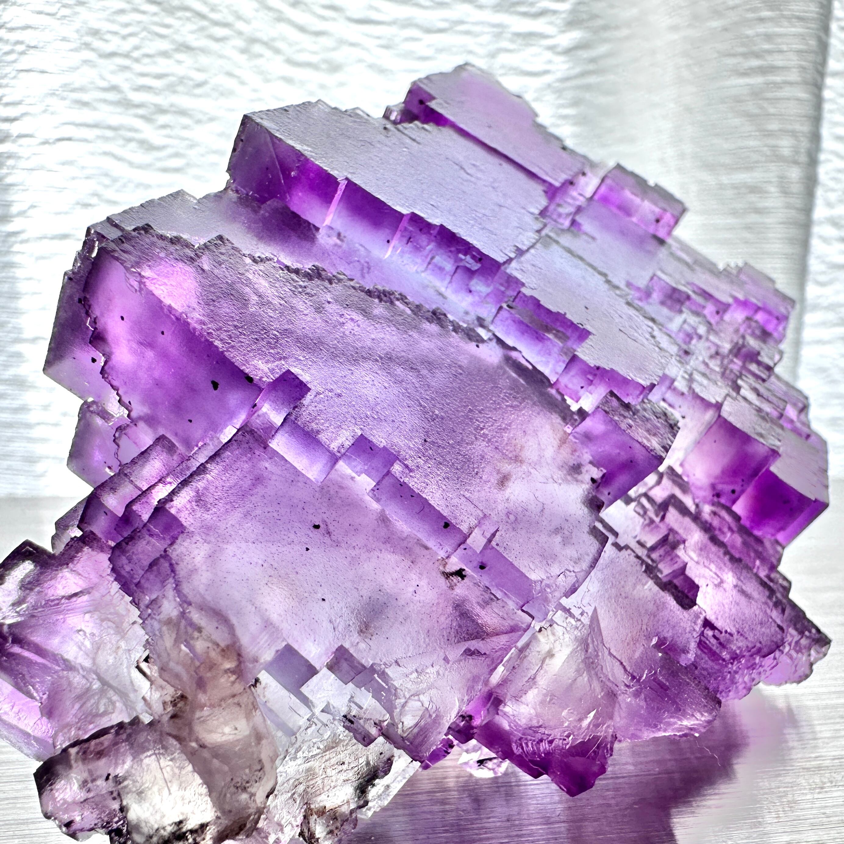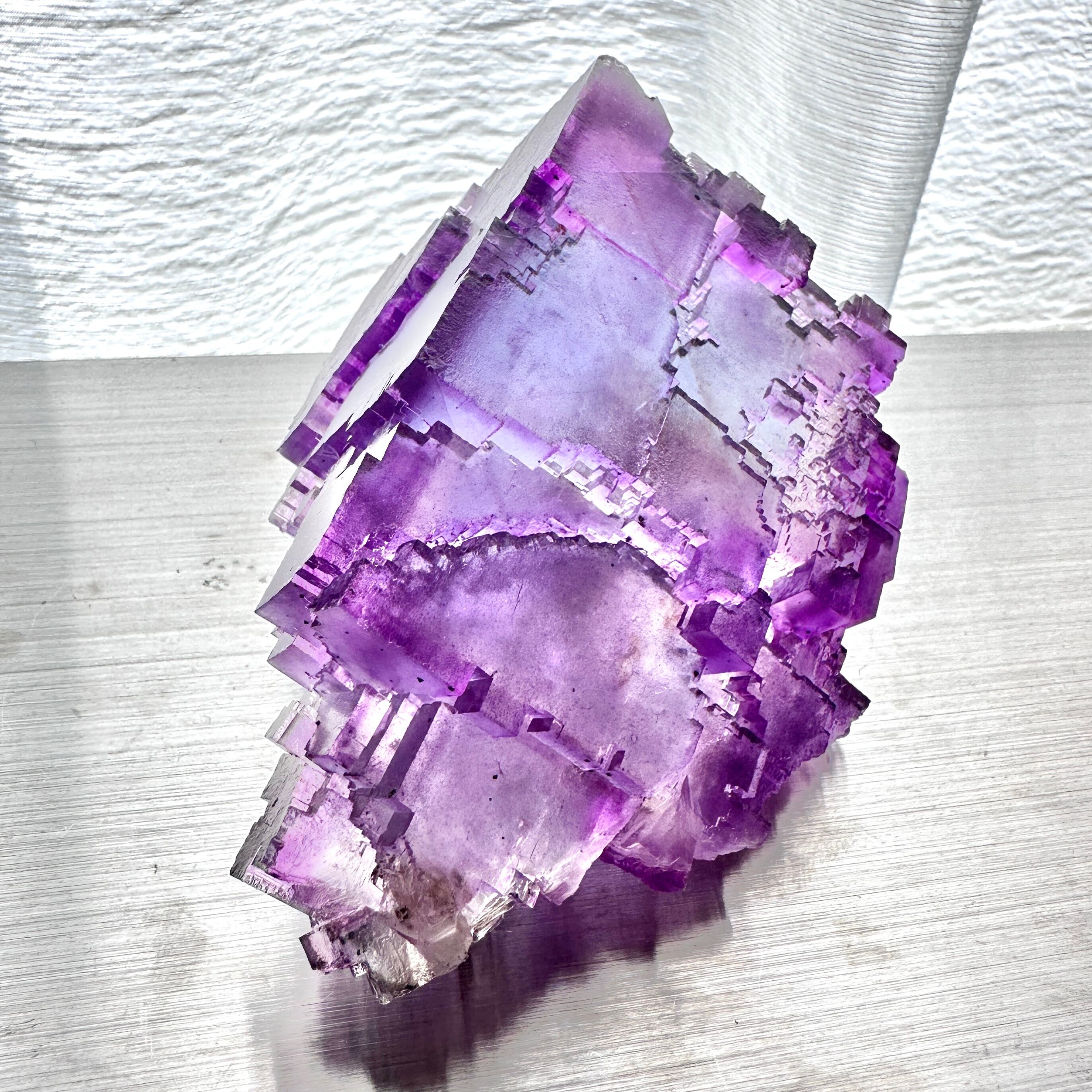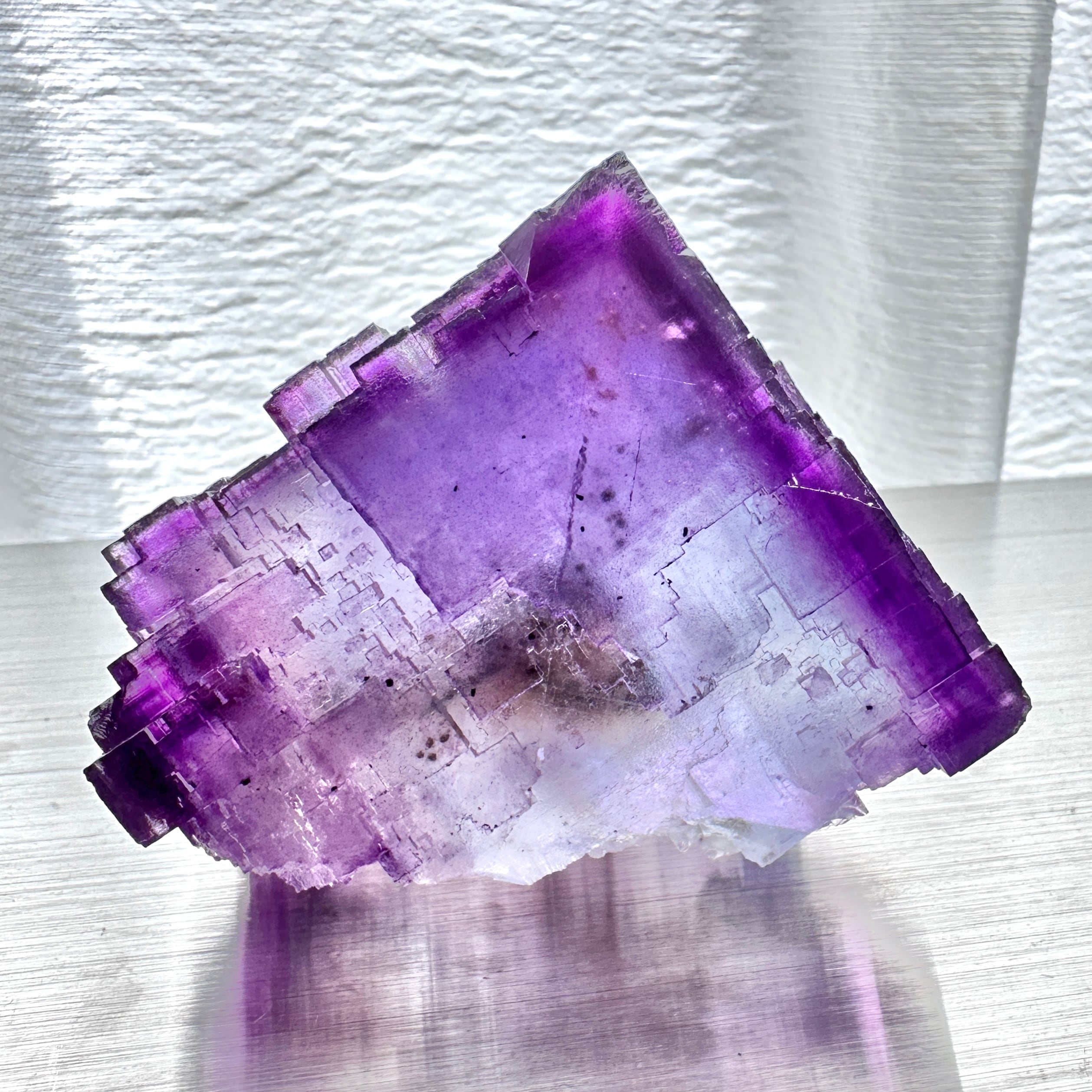 ボリュームのある結晶は存在感抜群で、そのサイズ感に対してダメージは少なく、結晶表面の凹凸やパープルを軸に結晶内部のユニークな発色も印象的な、サイズと美しさの両方を伴う標本です。