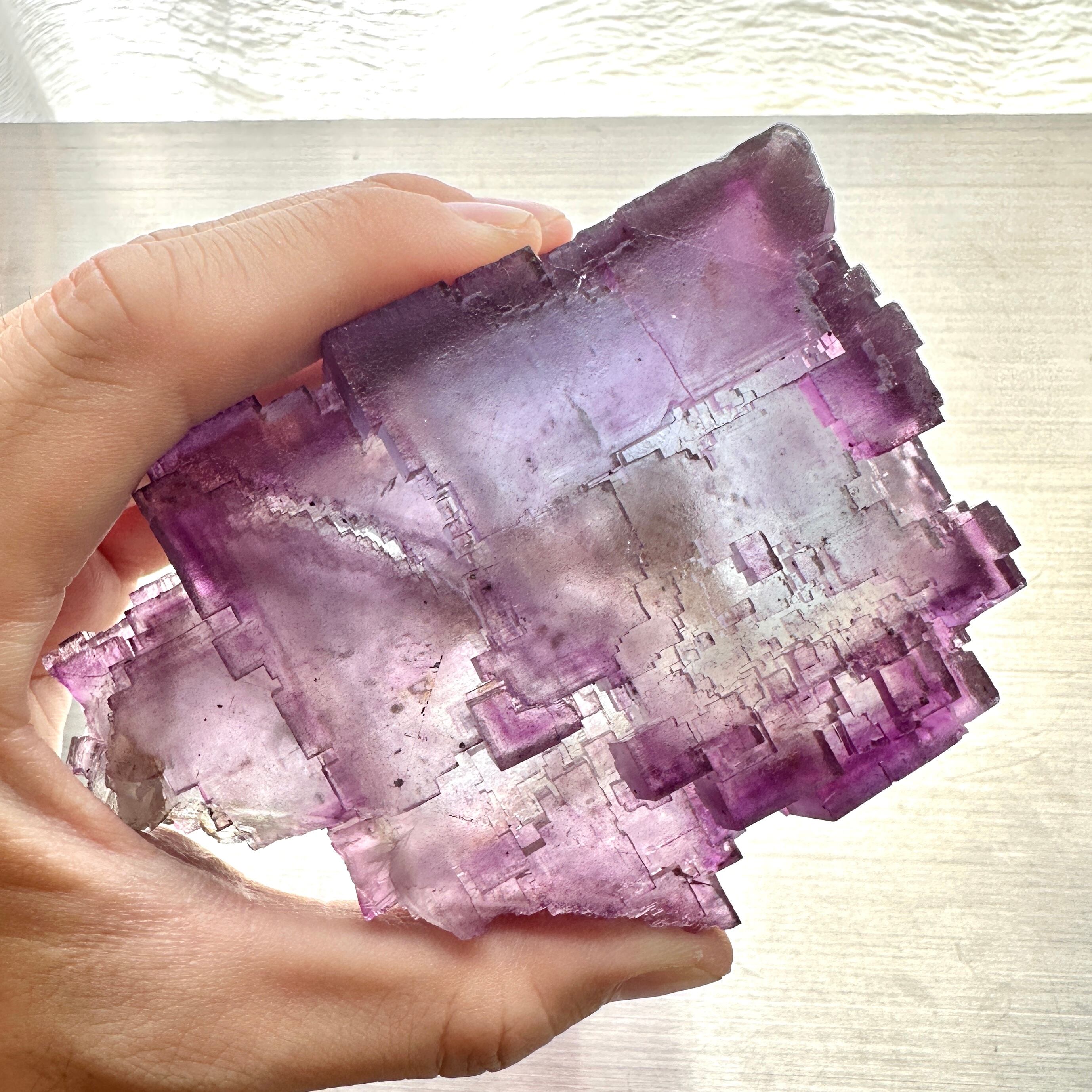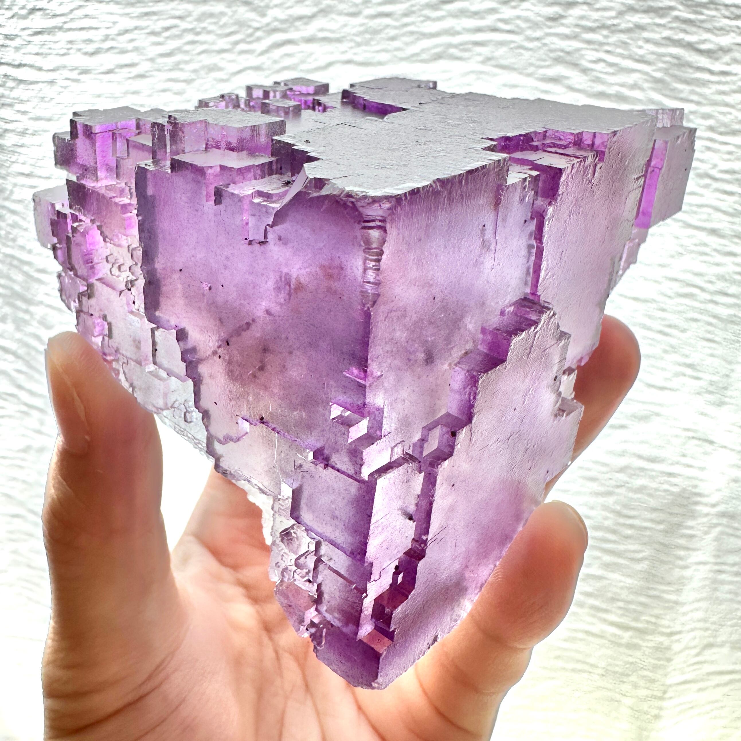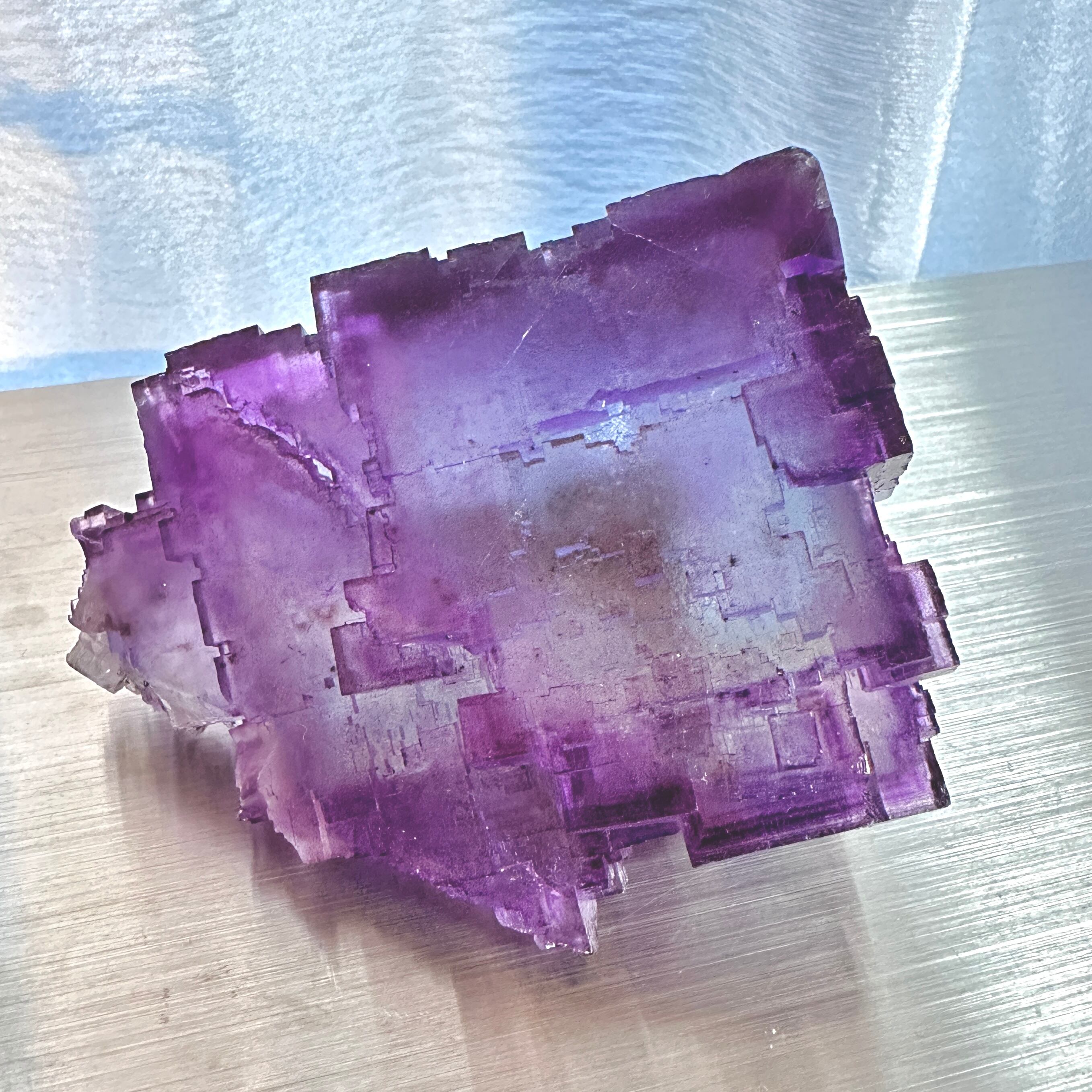 ボリュームのある結晶は存在感抜群で、そのサイズ感に対してダメージは少なく、結晶表面の凹凸やパープルを軸に結晶内部のユニークな発色も印象的な、サイズと美しさの両方を伴う標本です。