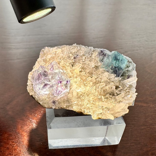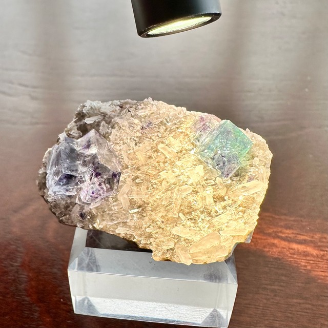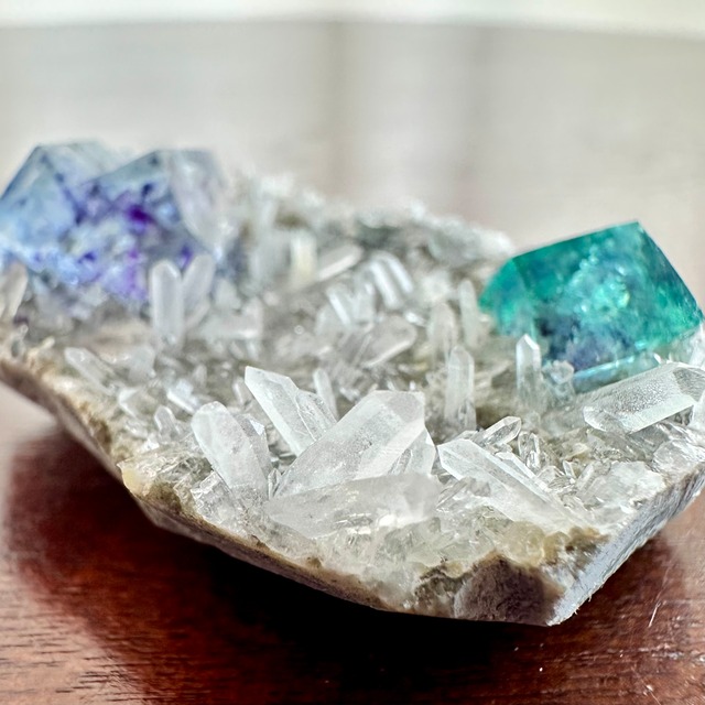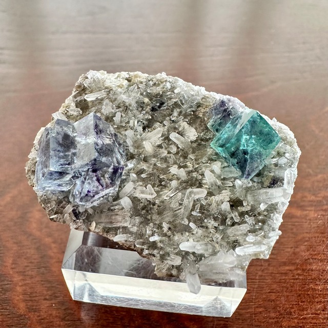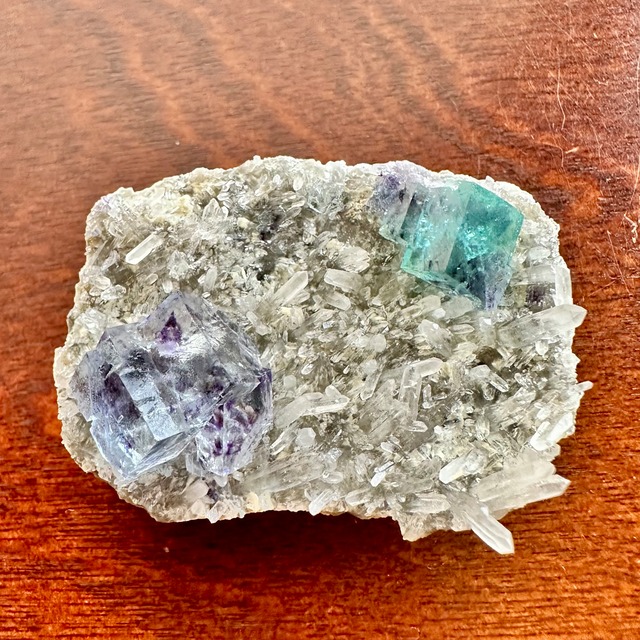ブルーパープルの凛とした色味のフローライトと、ブルーグリーンの爽やかな色味のフローライトが同一の標本上に上手く収まる標本で、その色味の対比とバランスが魅力的な標本です。
