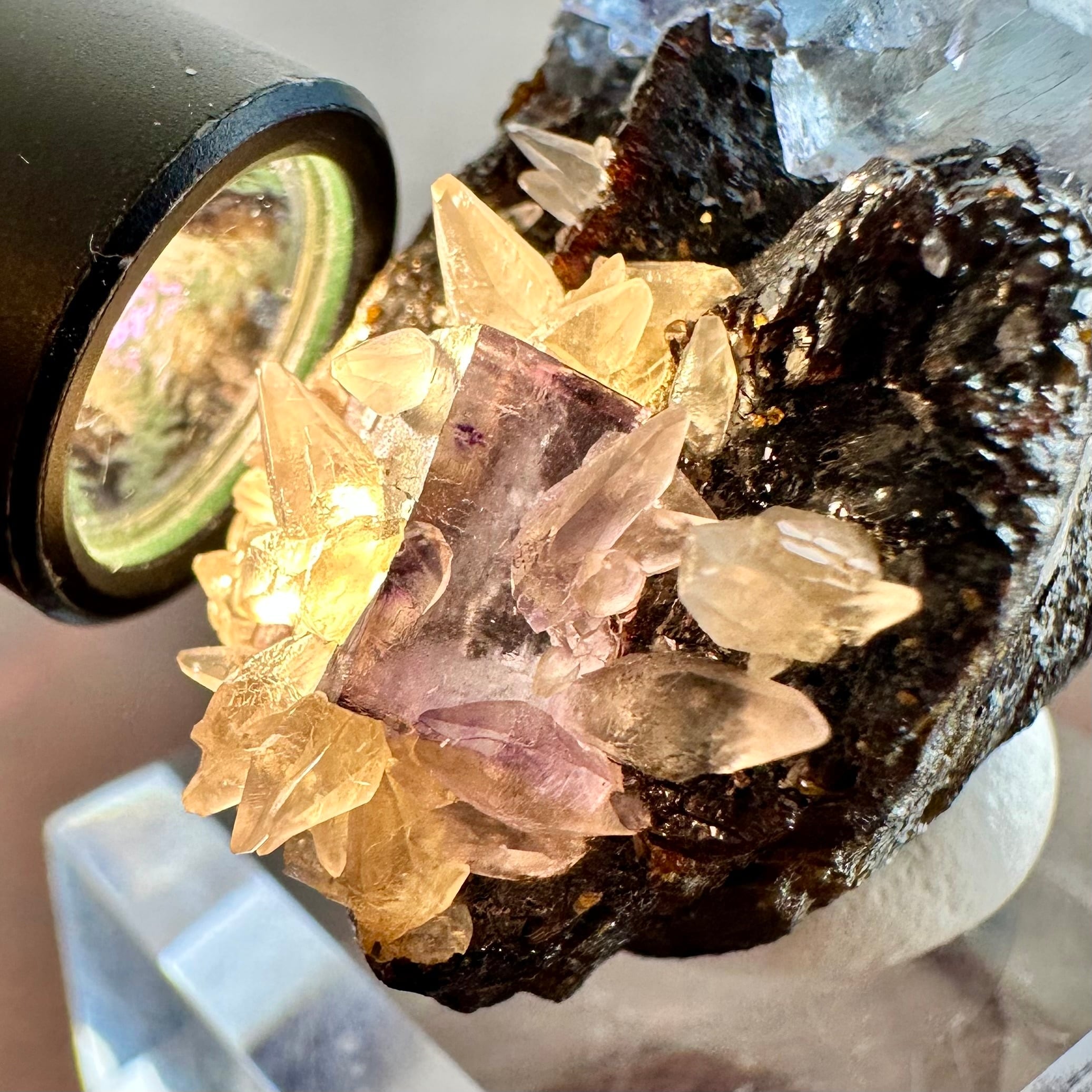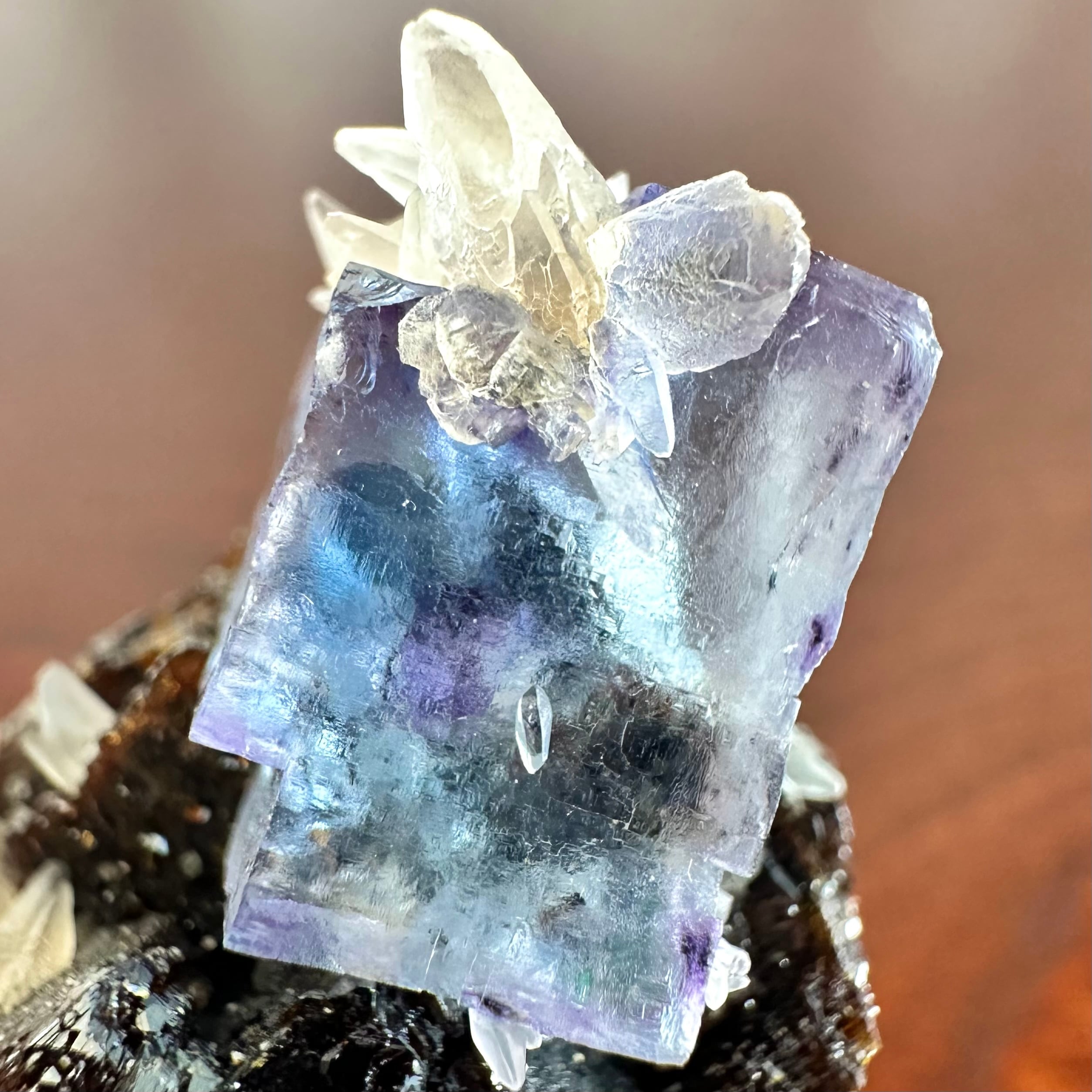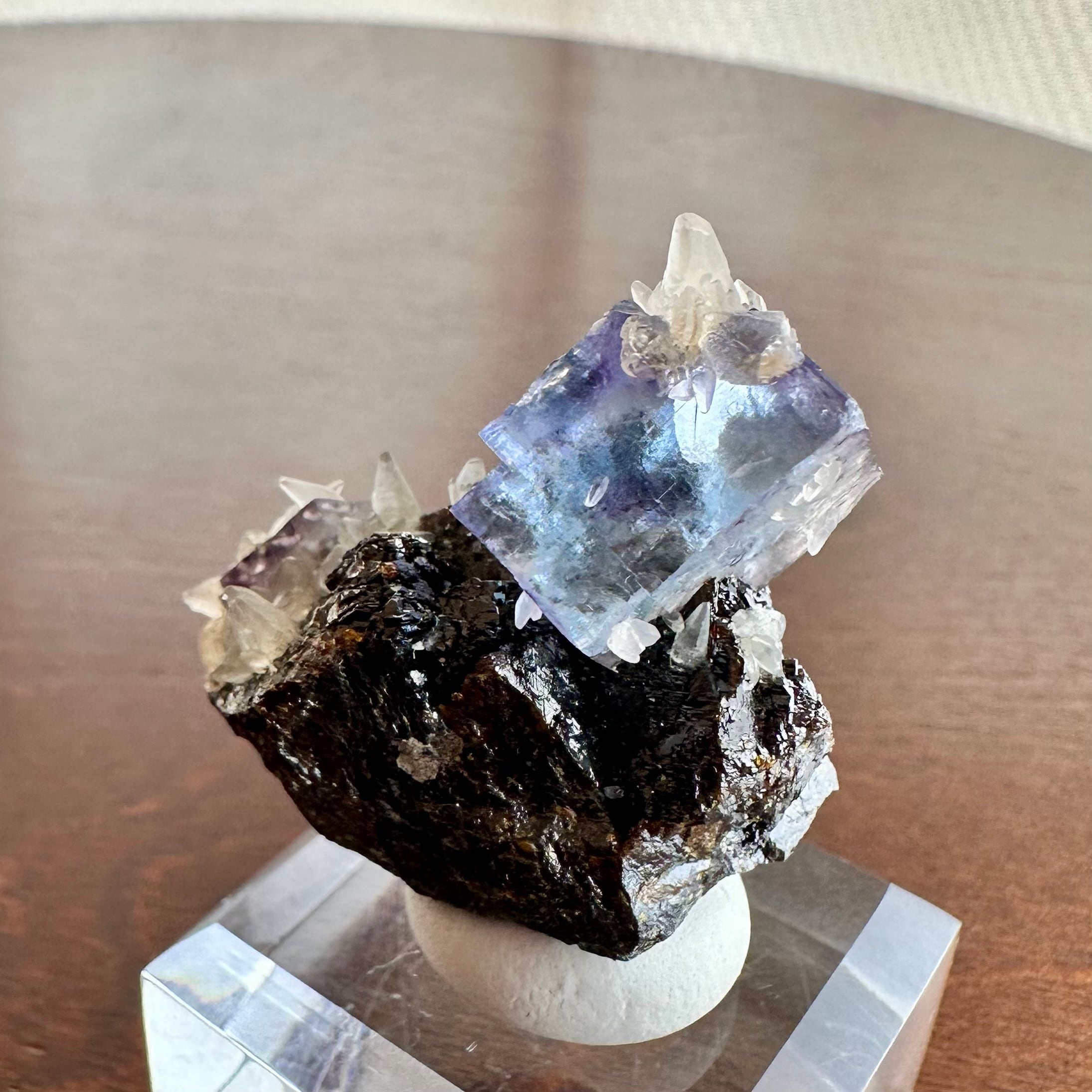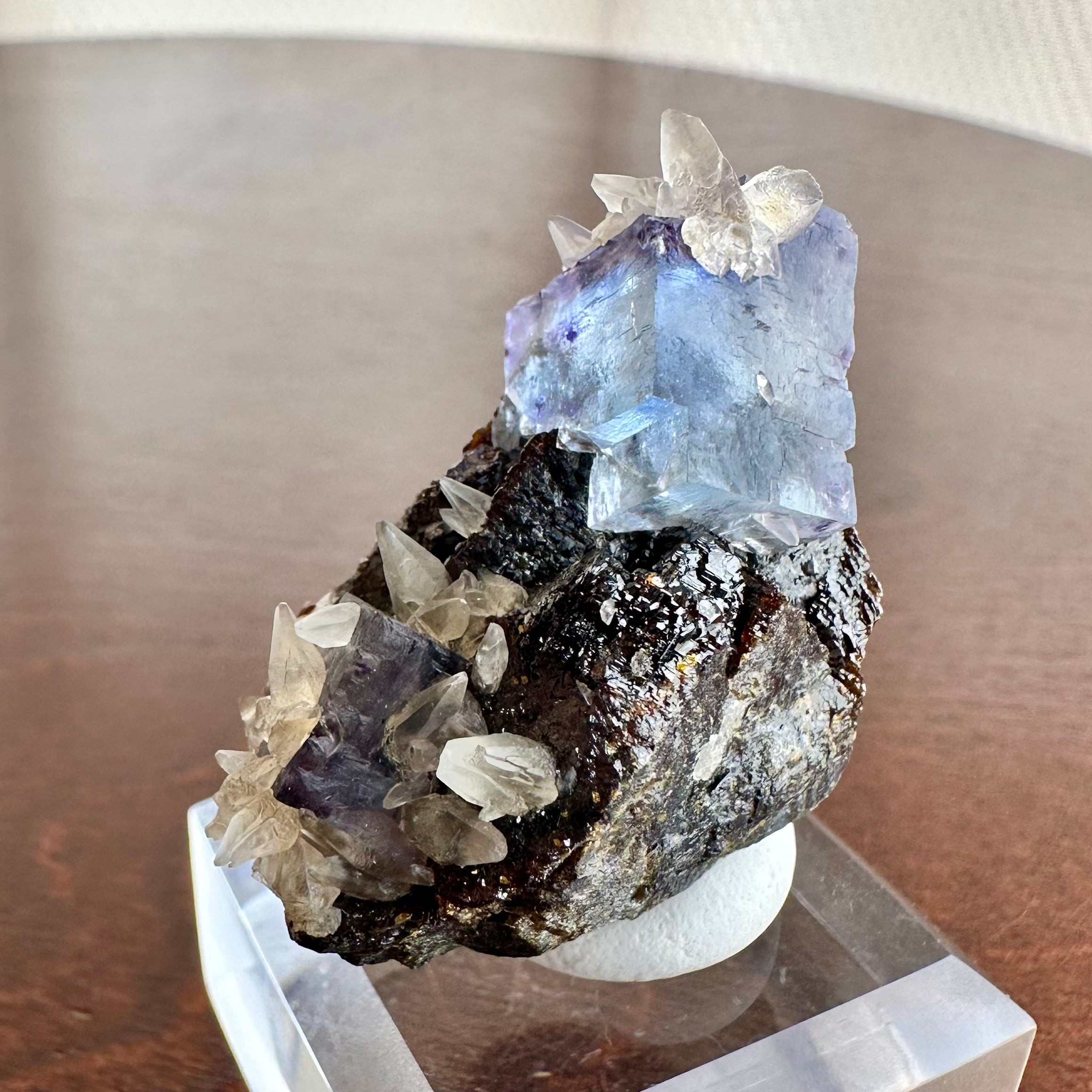 サイズ感のあるスファレライト上にメイン結晶たるブルーフローライトと小さくカルサイトに覆われたフローライトが結晶したユニークなバランスの標本です。