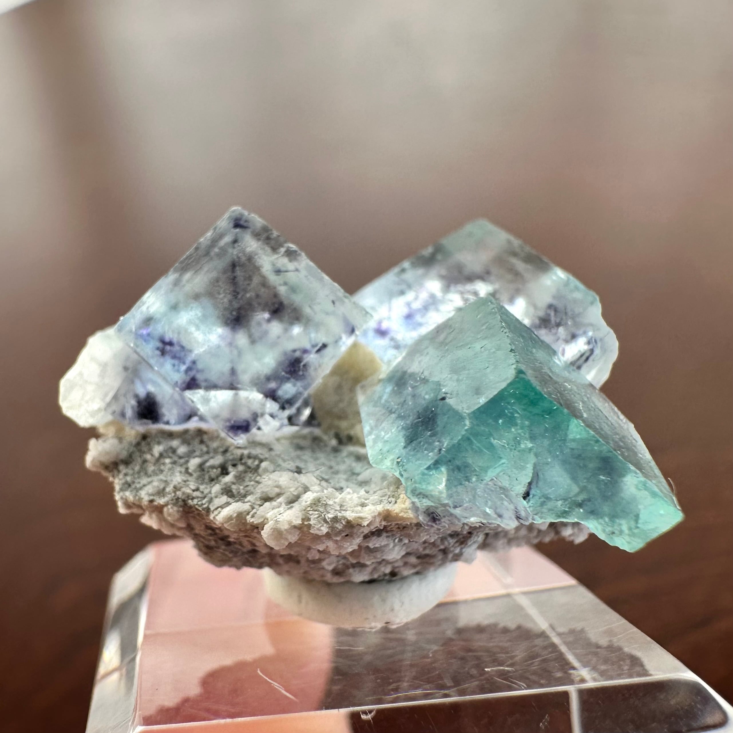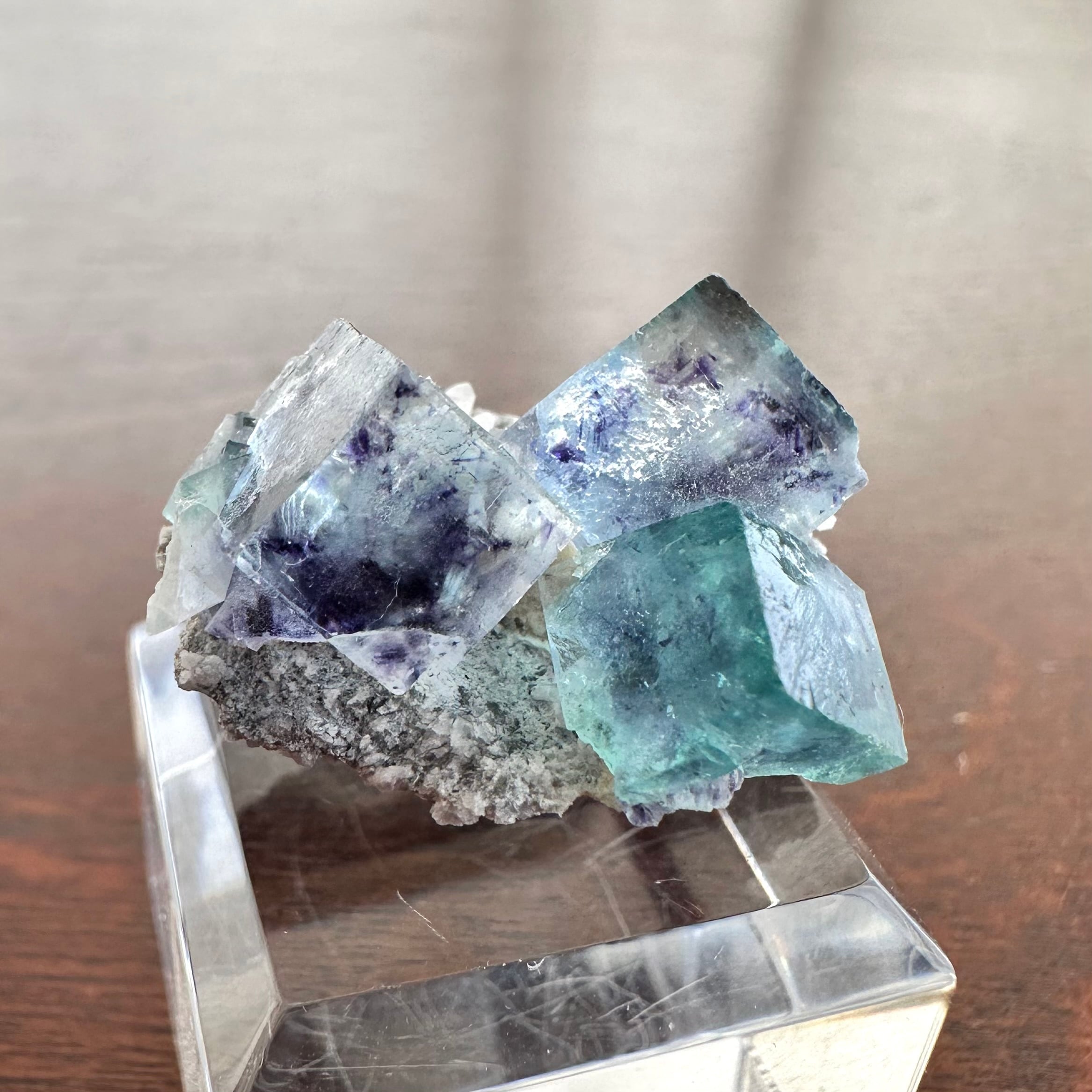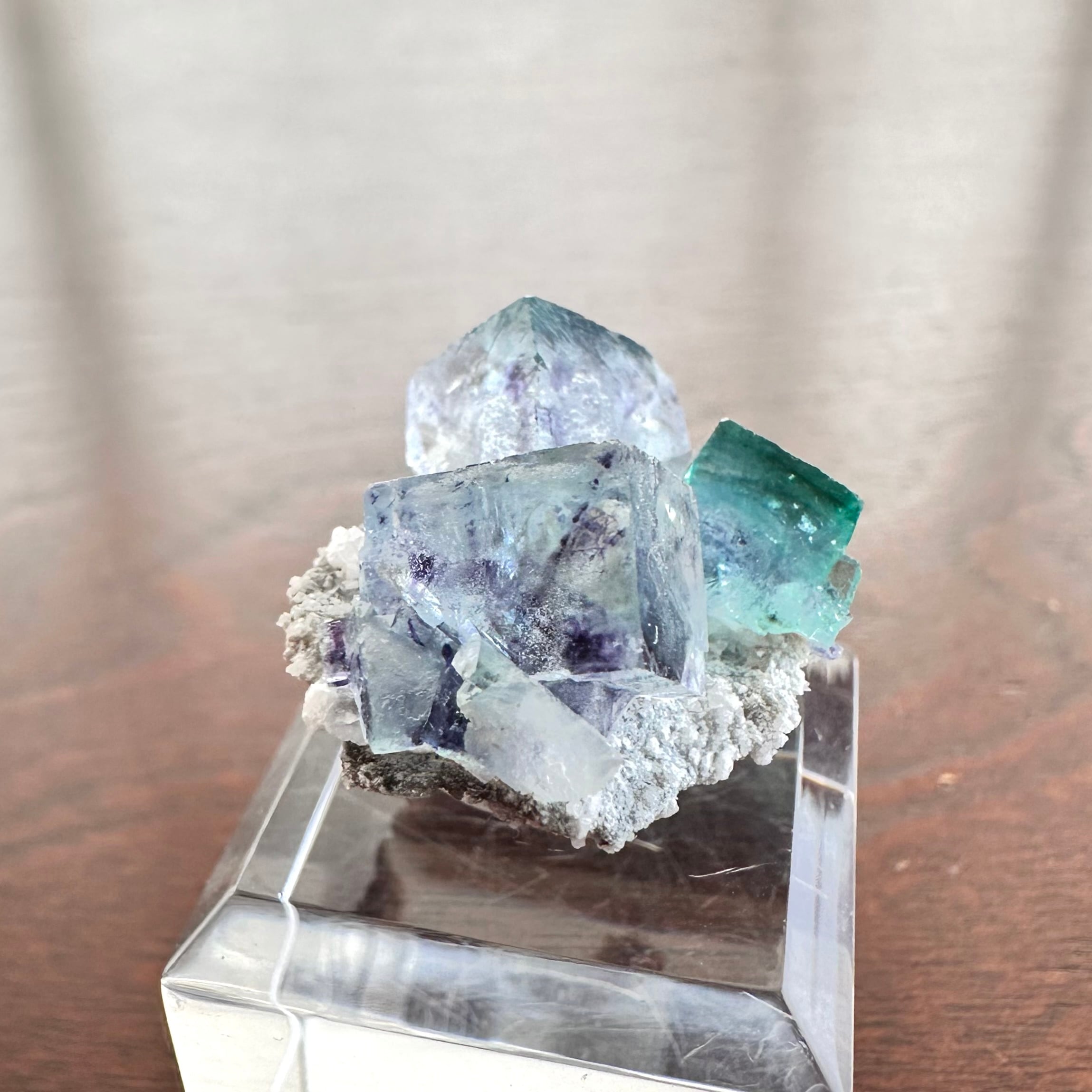 サムネイルサイズにまとまった標本で、ブルーのグラデーションがメインの結晶とグリーンがメインの結晶が小さな母岩上でそれぞれ見られるユニークな景色の標本です。