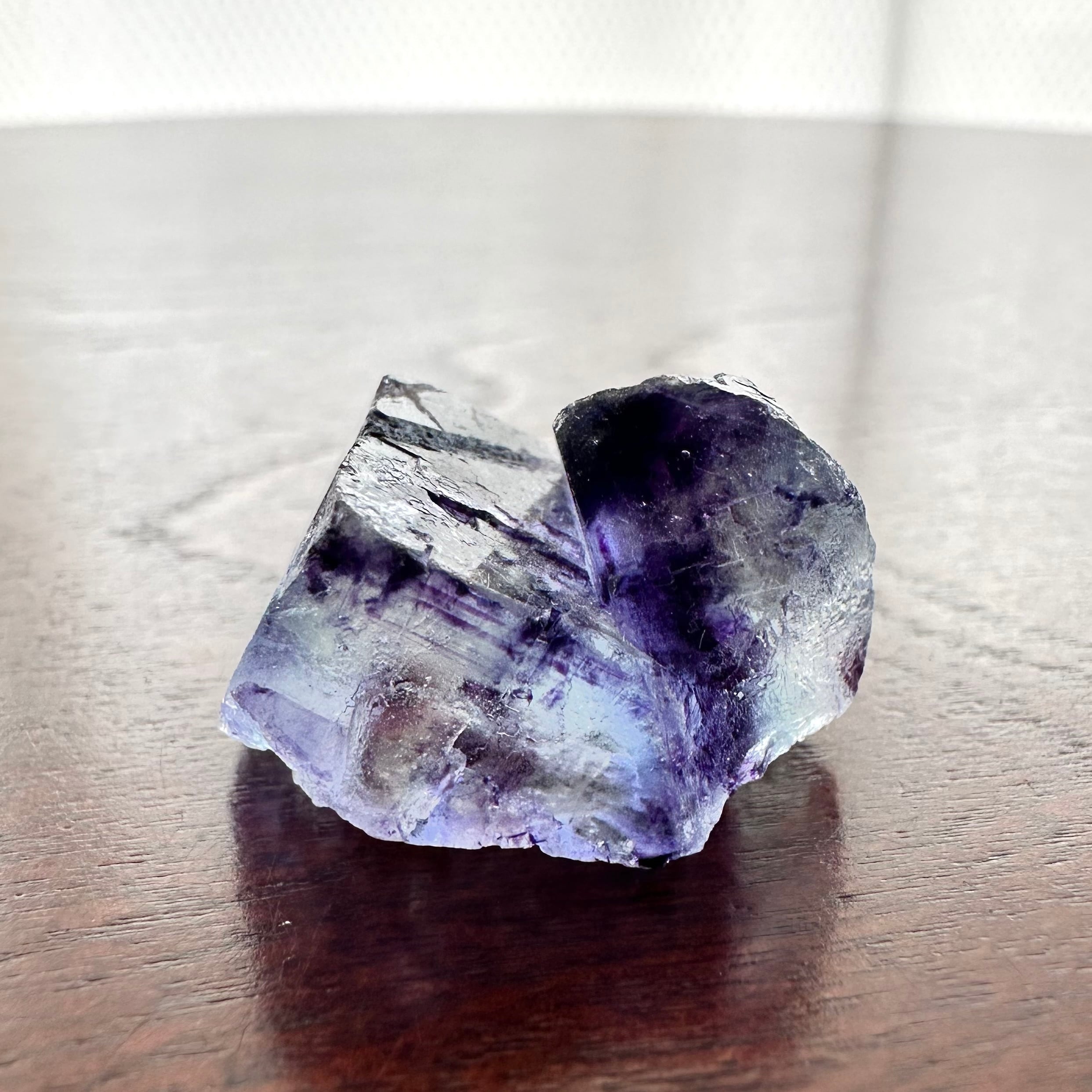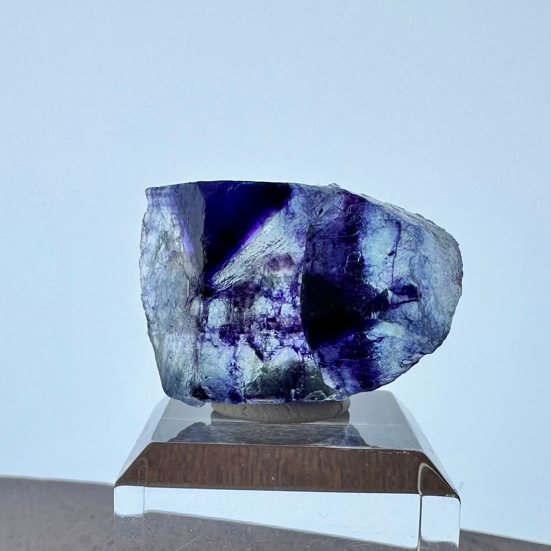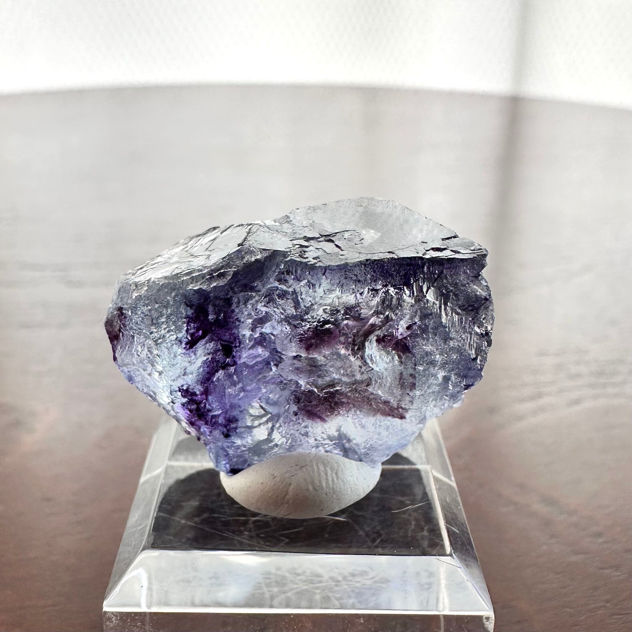 テリのあるクリアなブルーの結晶にパープルのコアが入り、エッジの部分の多くをインクをかけたように濃いパープルが覆うような結晶で、透過光下での美しい発色が特に魅力的です。