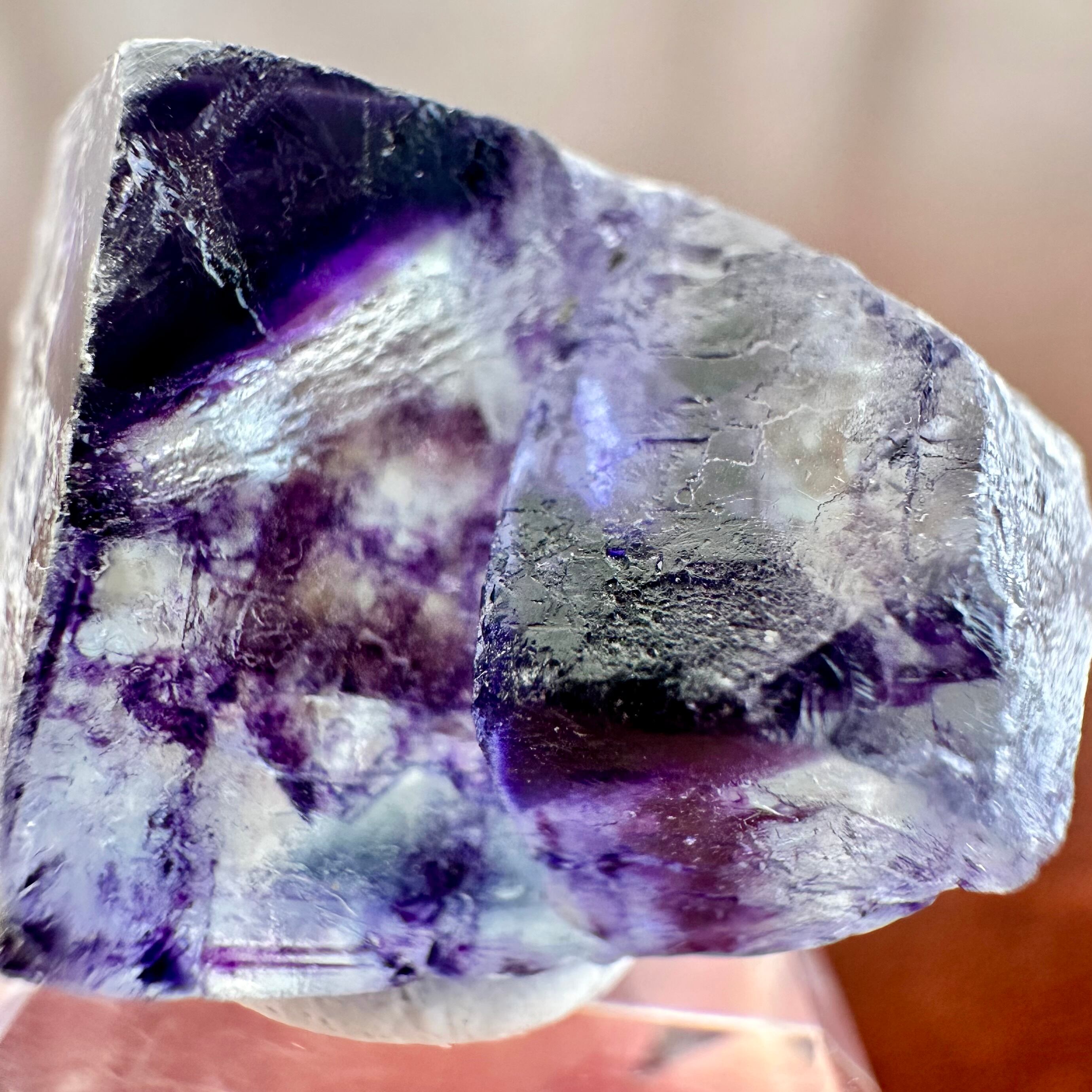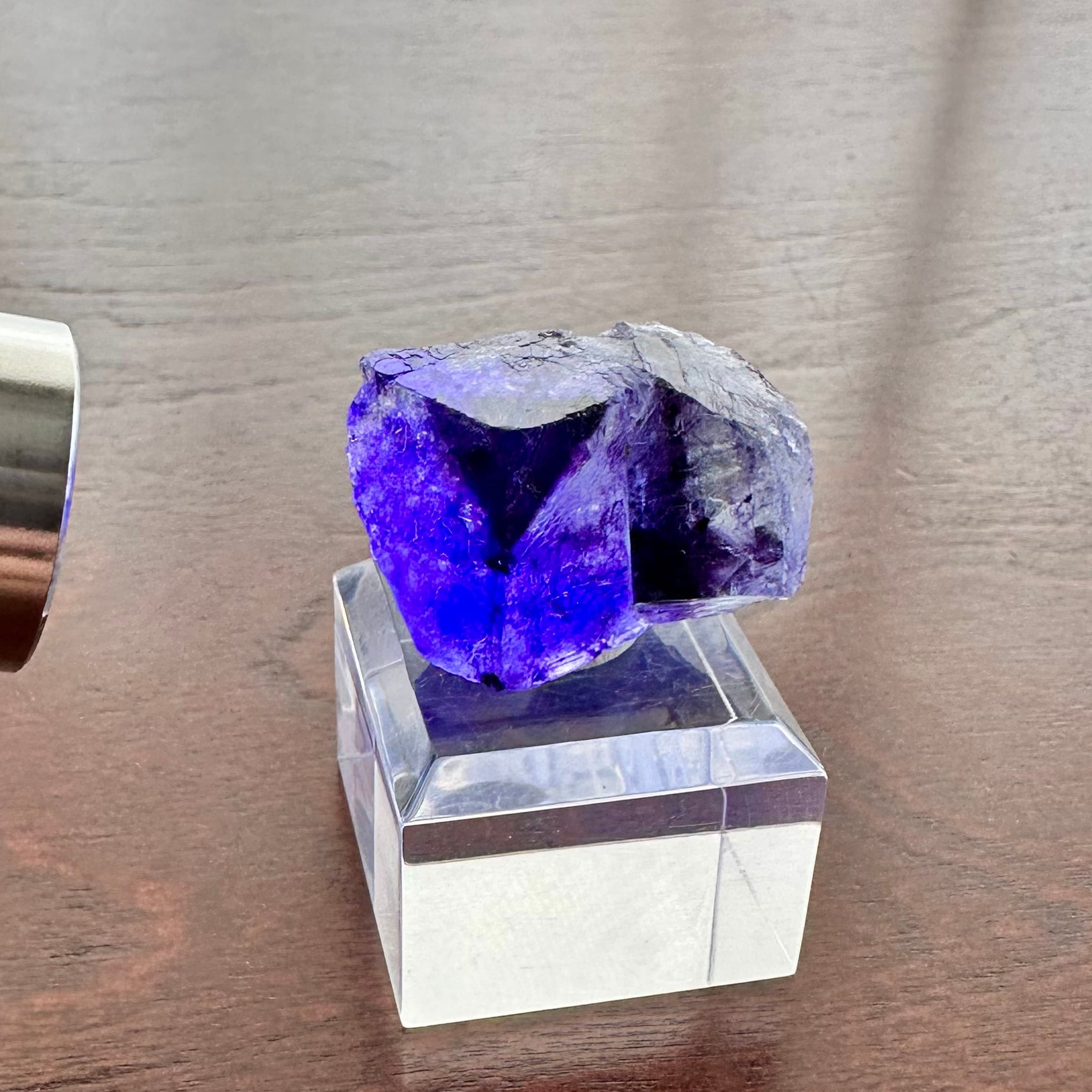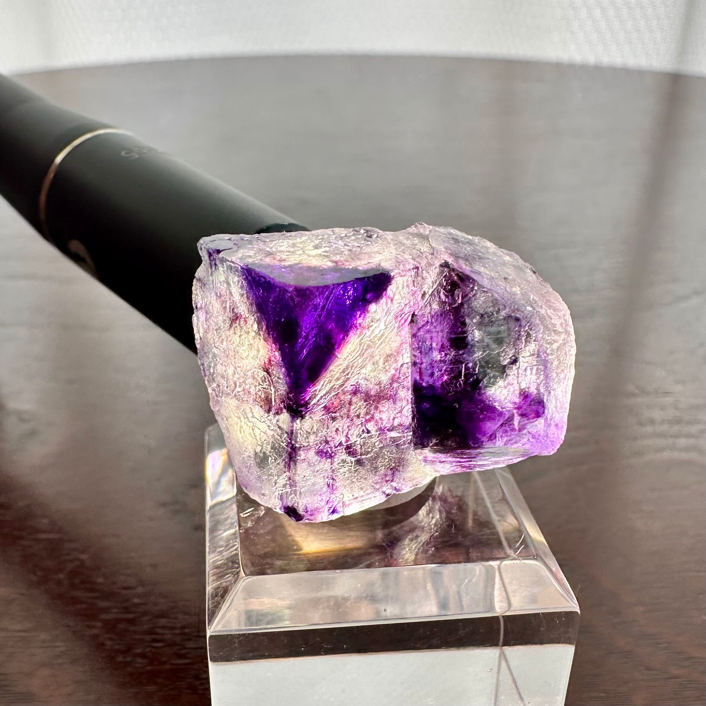 テリのあるクリアなブルーの結晶にパープルのコアが入り、エッジの部分の多くをインクをかけたように濃いパープルが覆うような結晶で、透過光下での美しい発色が特に魅力的です。