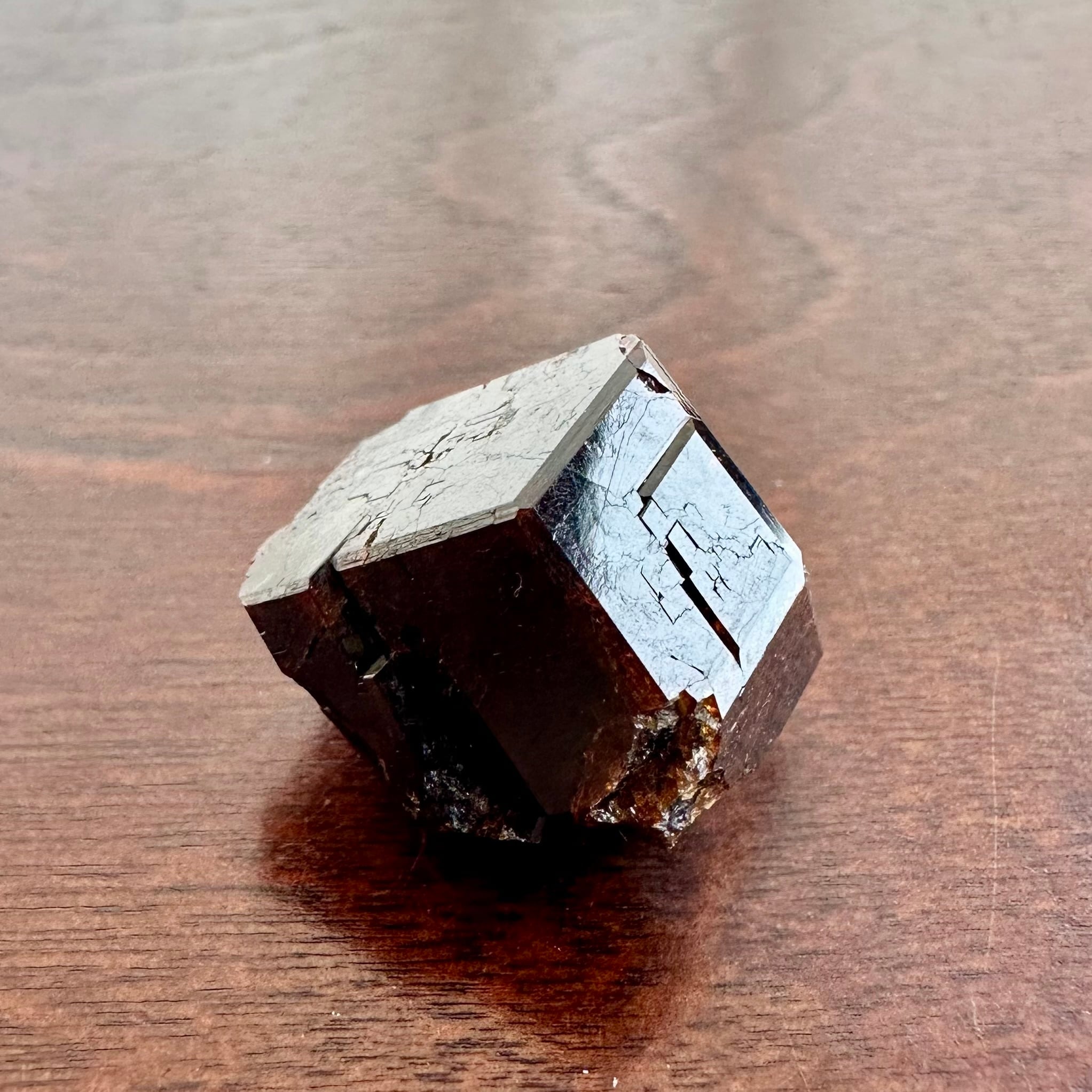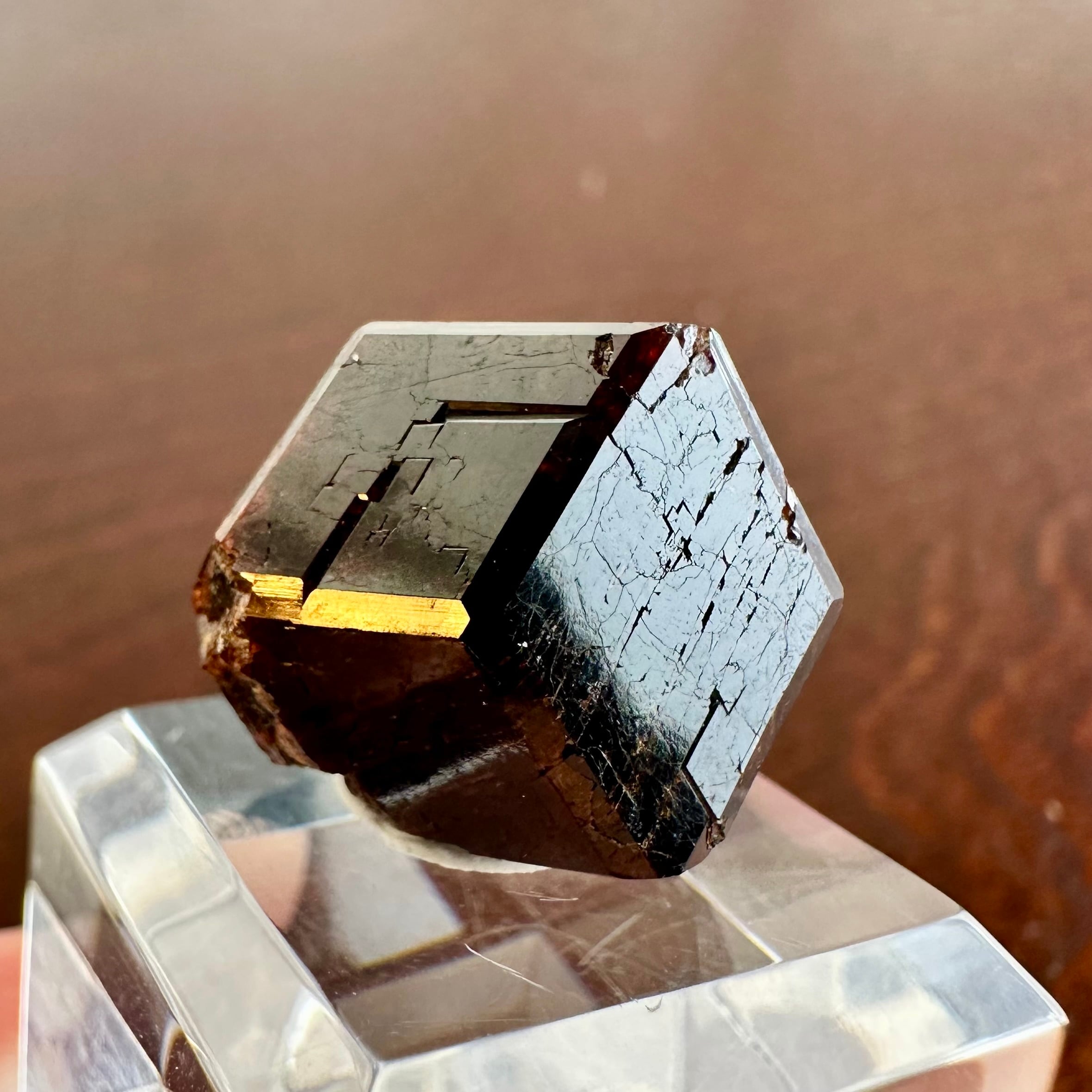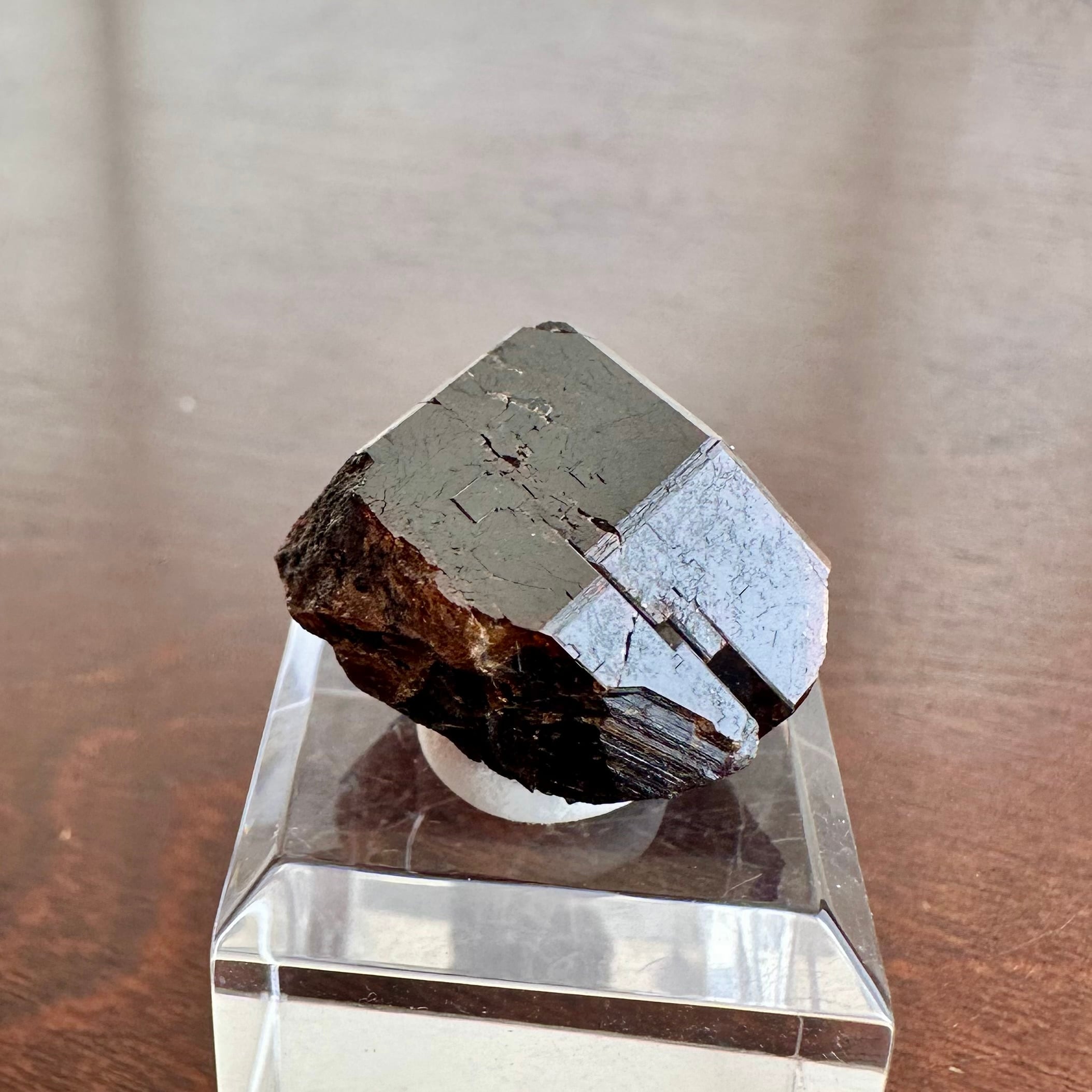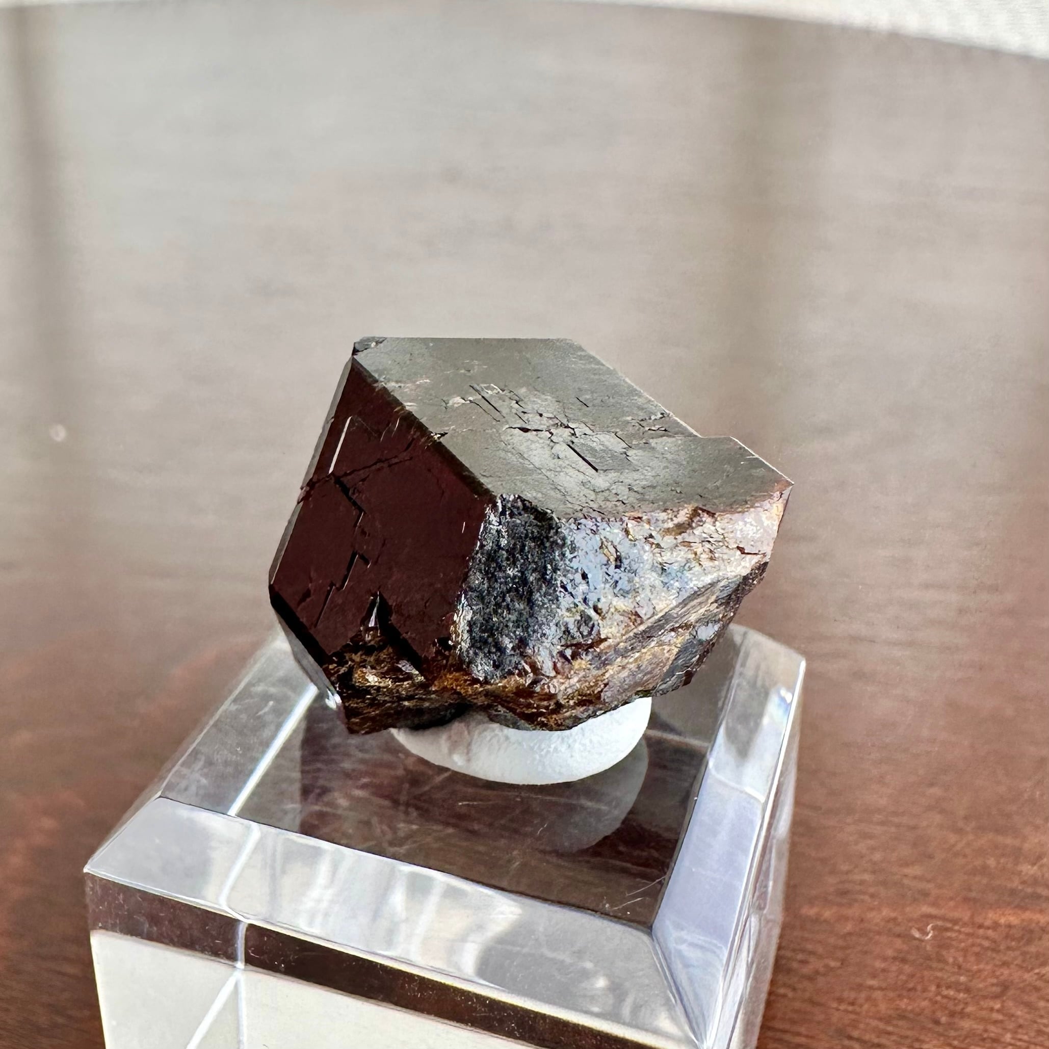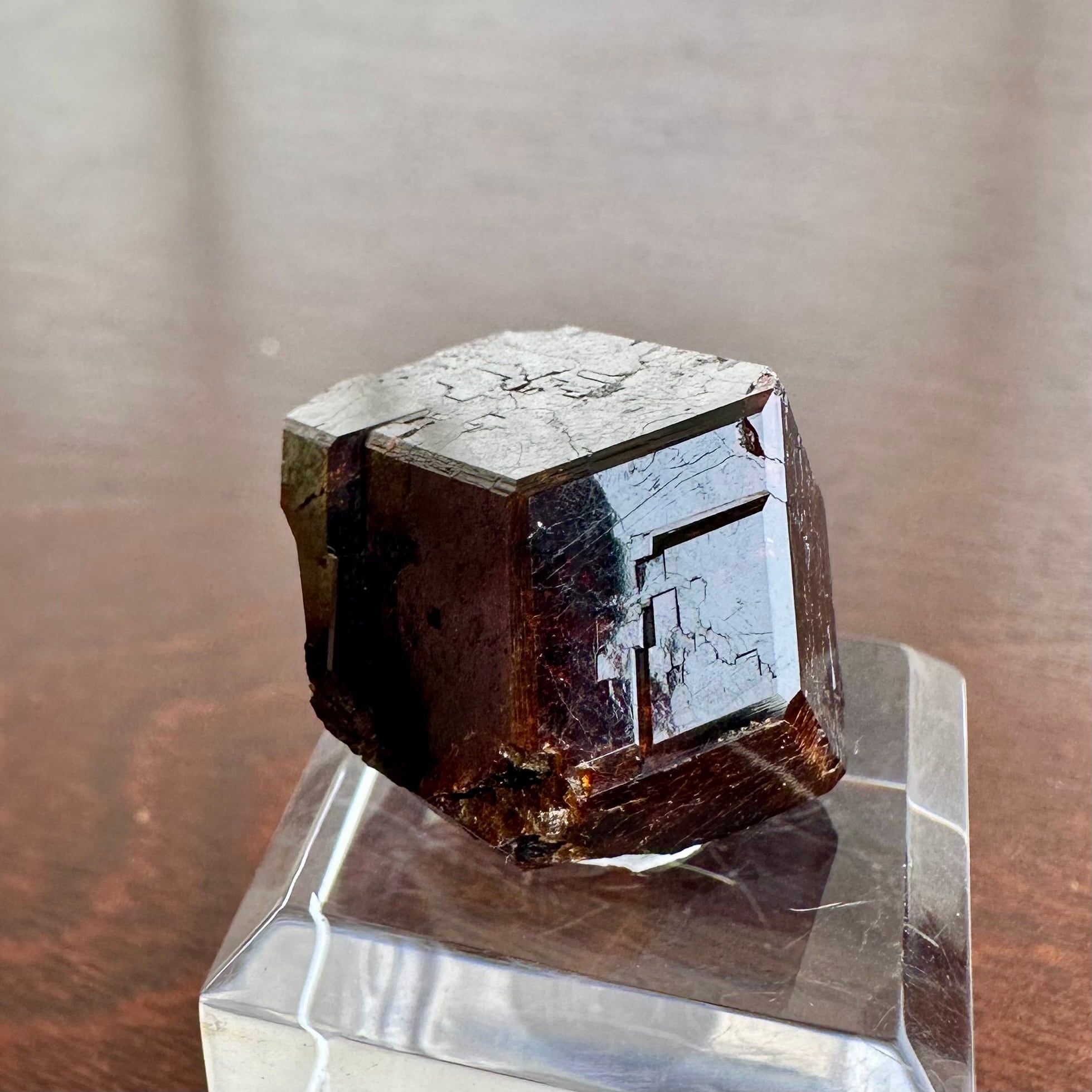 産地的に比較的大粒の結晶で、一見すると自然光下では茶褐色の暗い結晶ですが、ライトを当てることで結晶表面の透け感や濃い赤色を確認することが出来ます。