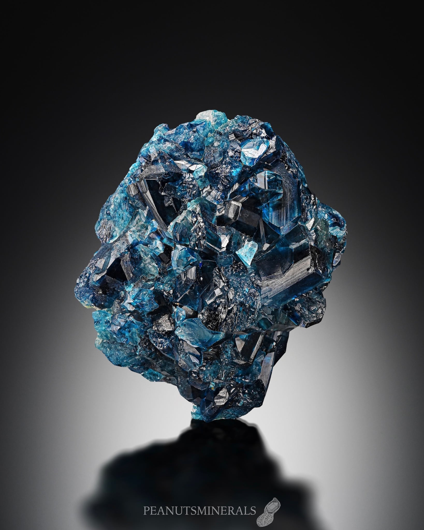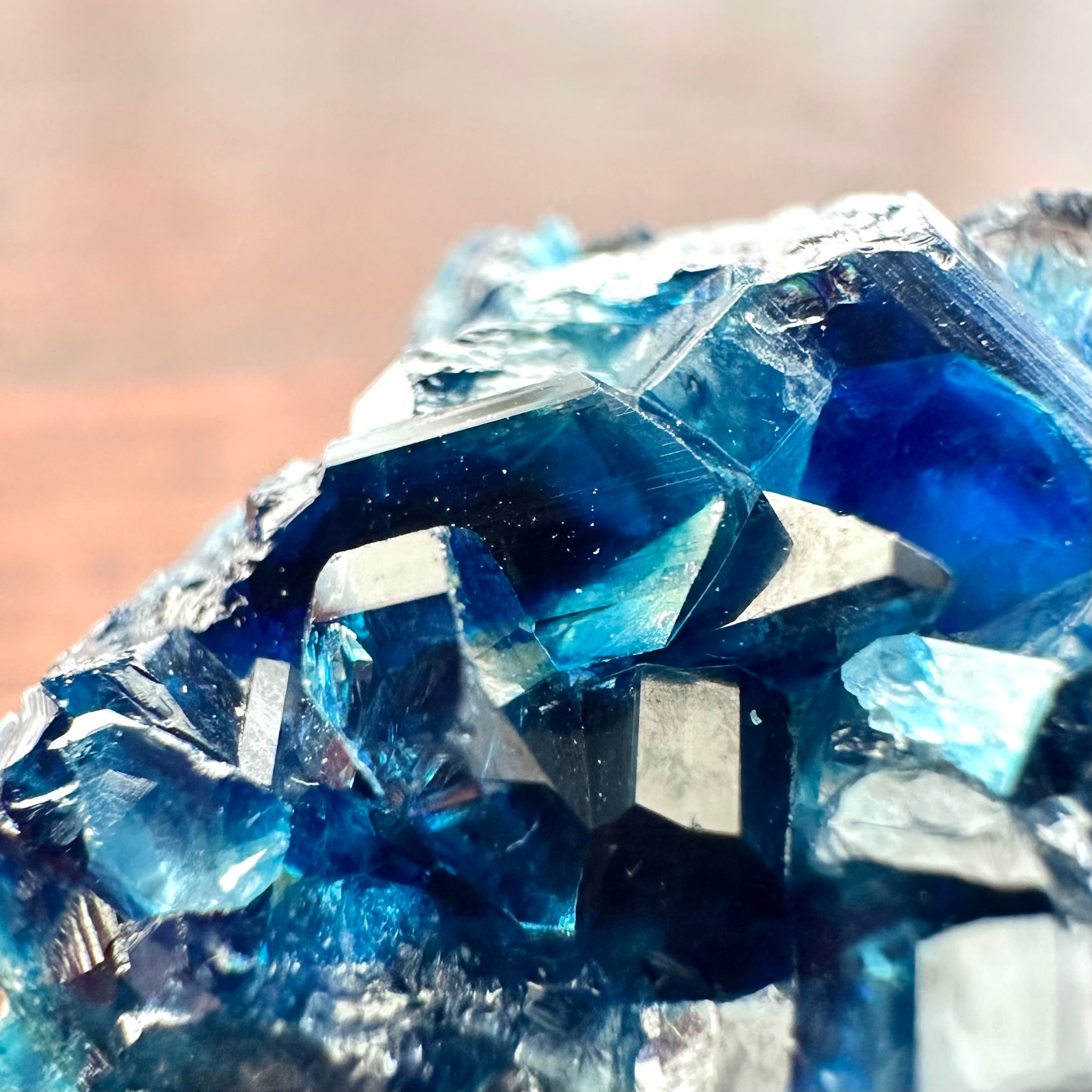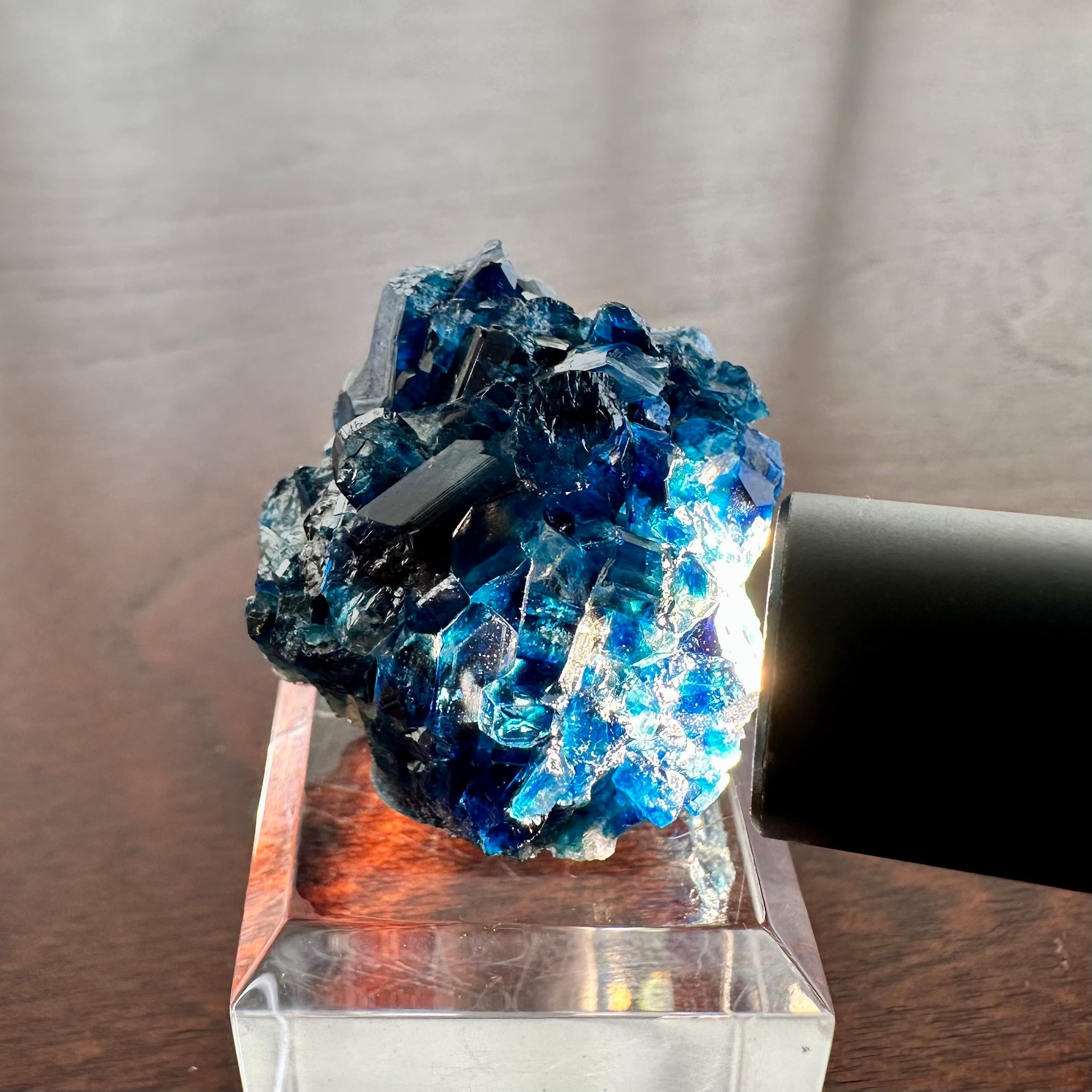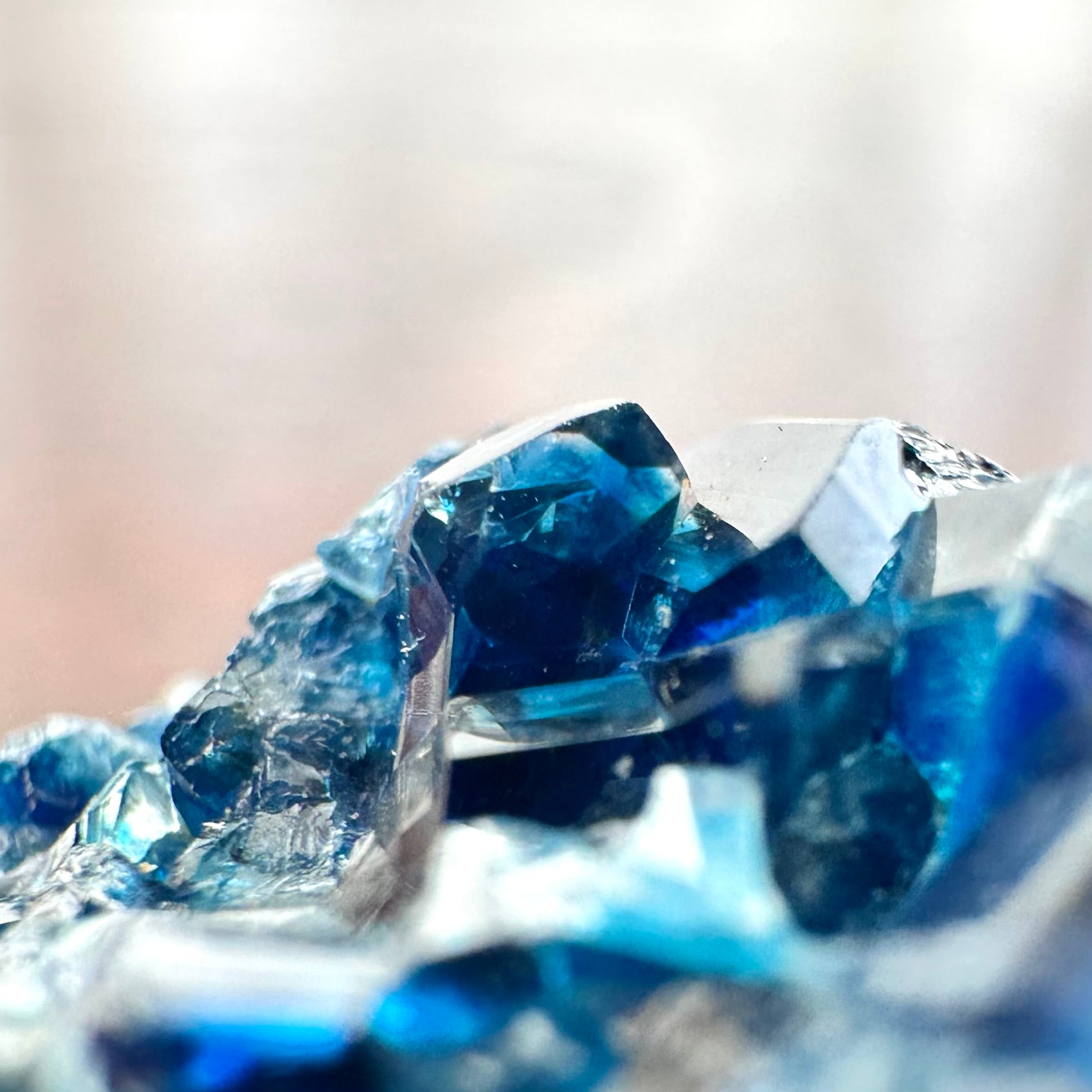 特に透過光下での鮮やかなブルーが印象的で、透明感と結晶の艶やかさがそれを引き出しています。