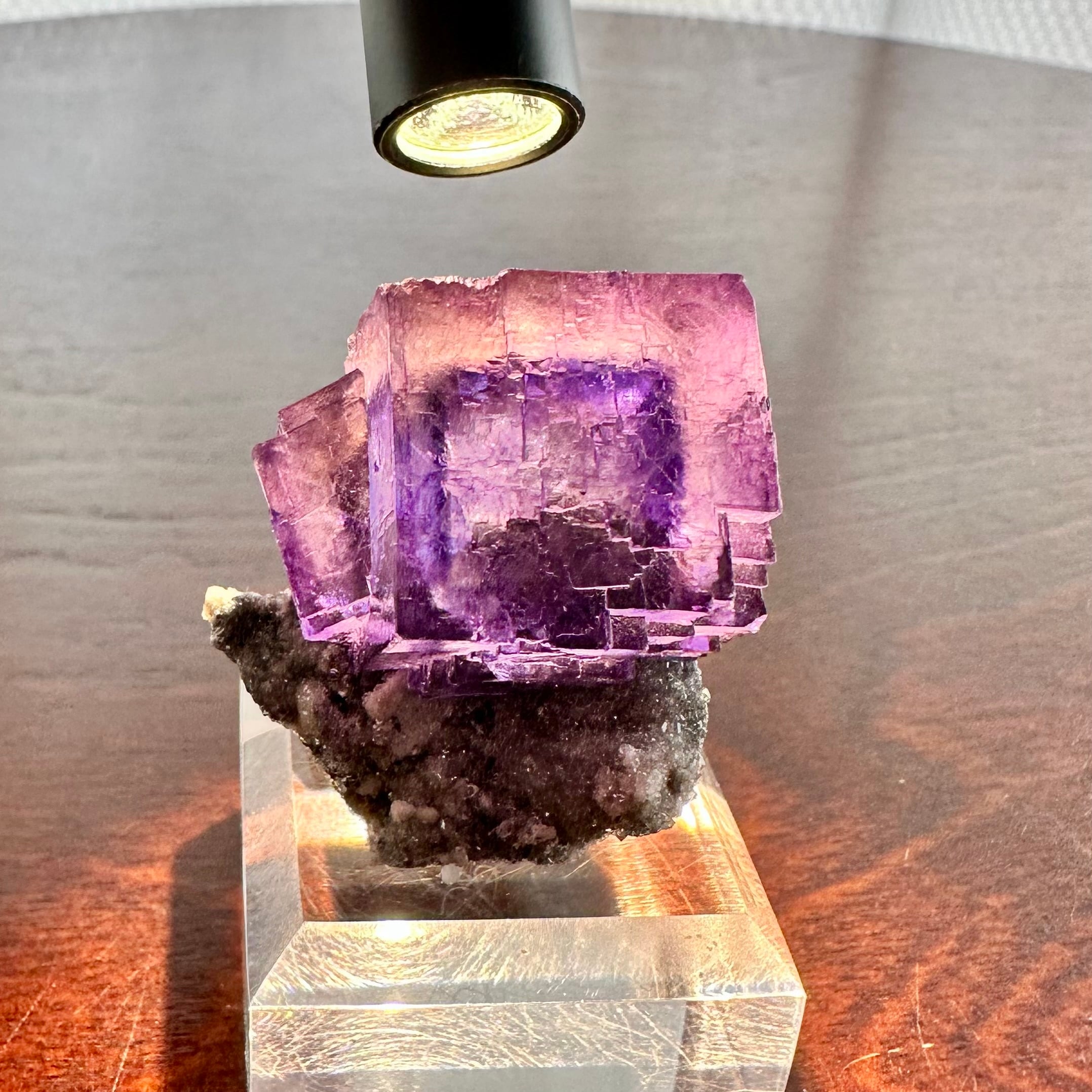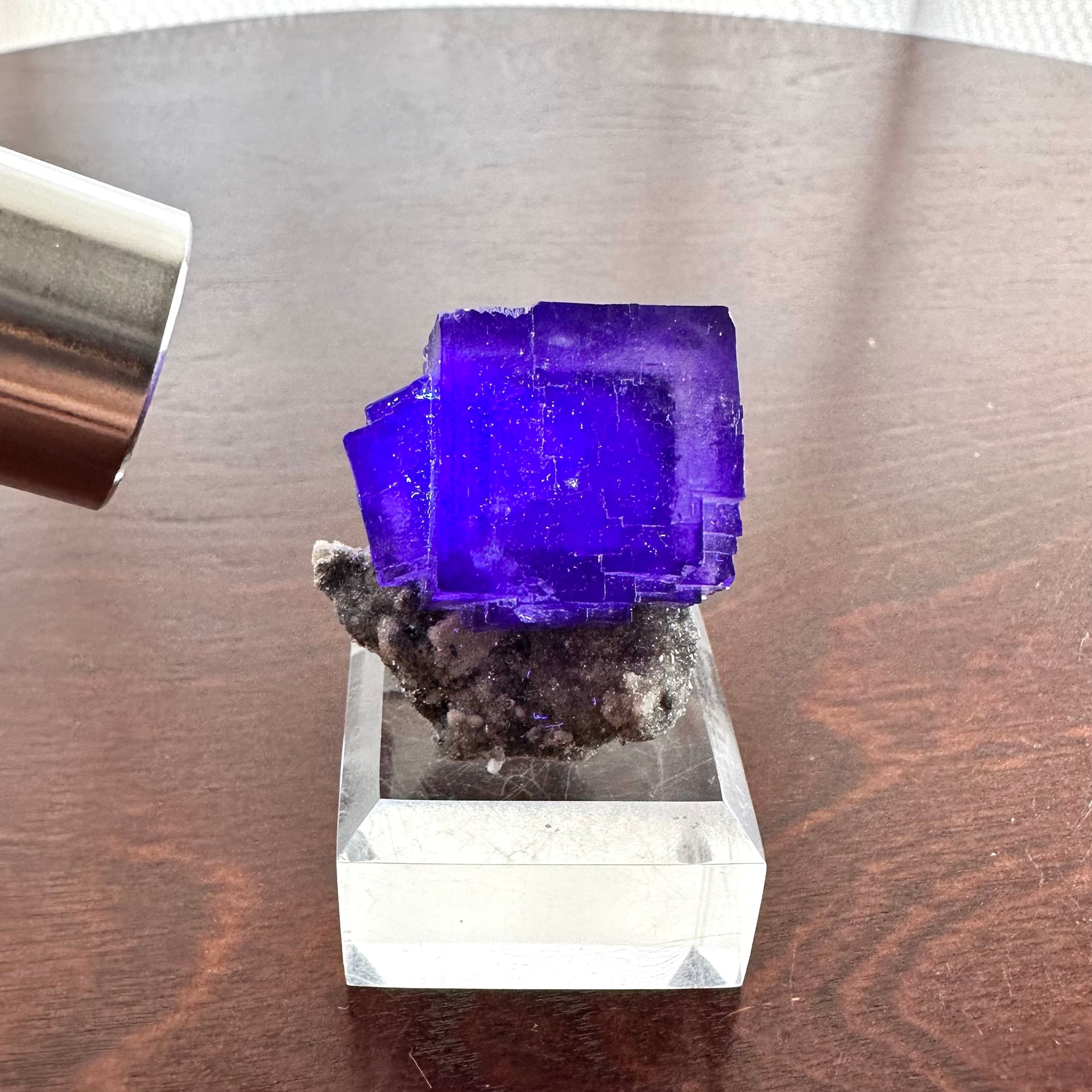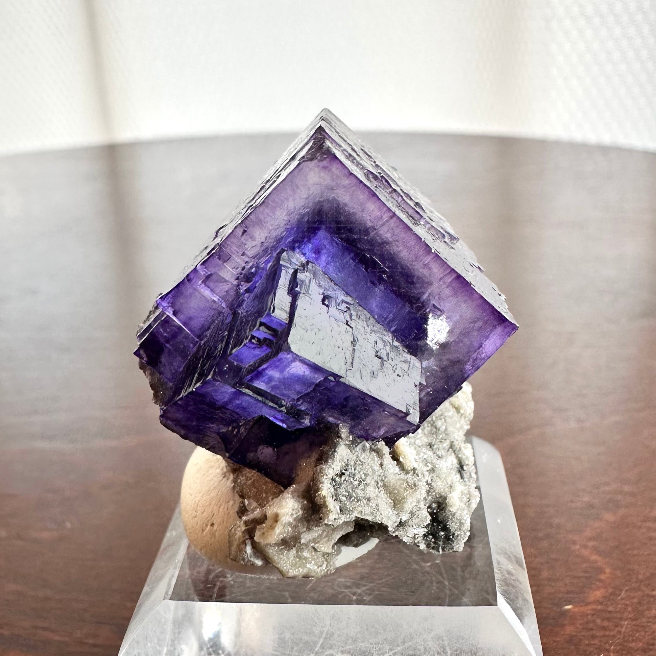 比較的流通量は多めの産地ながら、閉山した話も毎年流れつつ近年では良品が少ない中、この標本は結晶表面の凹凸の美しさや発色の良さ、何より美しいゾーニングが複数の面から見られるキューブ状の結晶のフォルムが魅力的です。