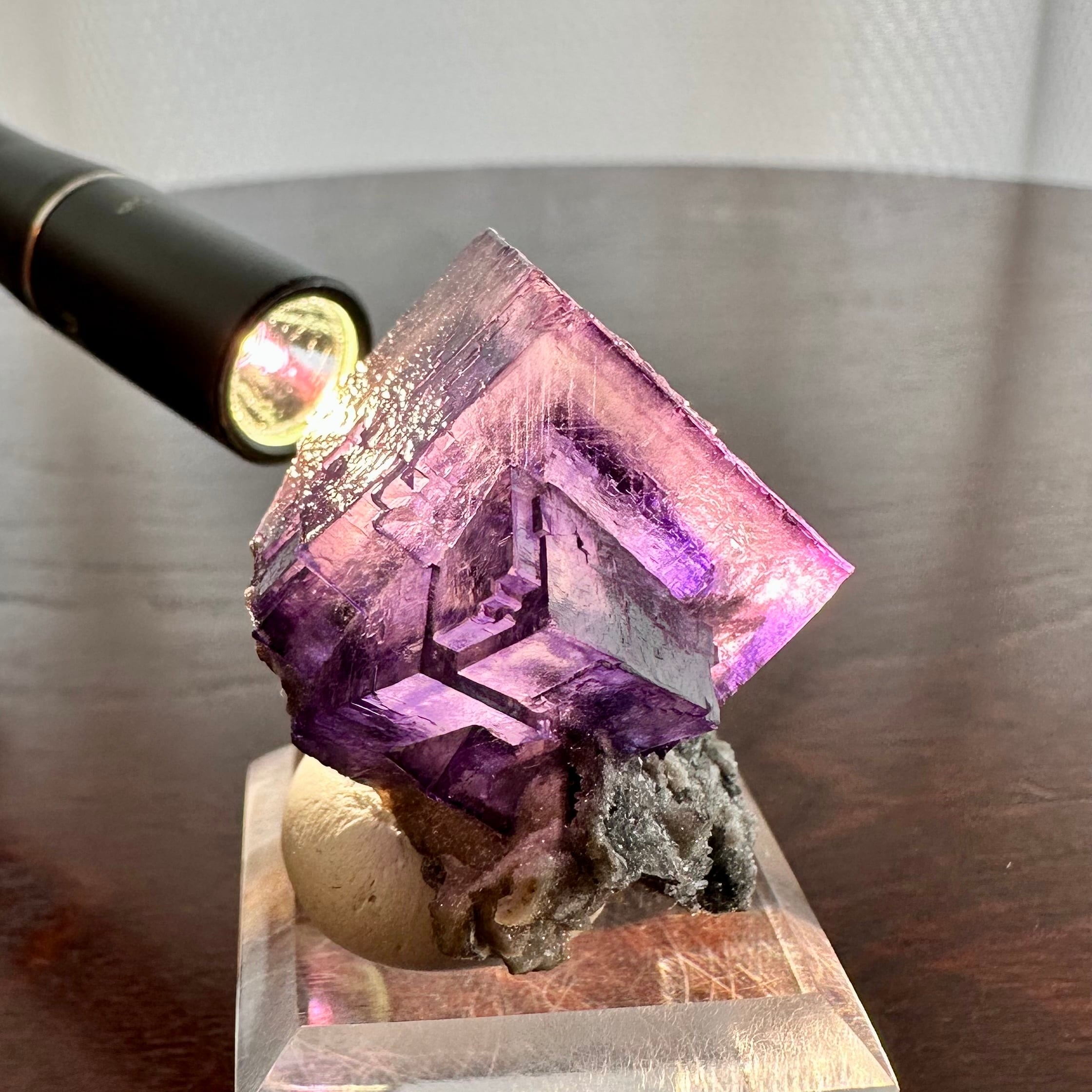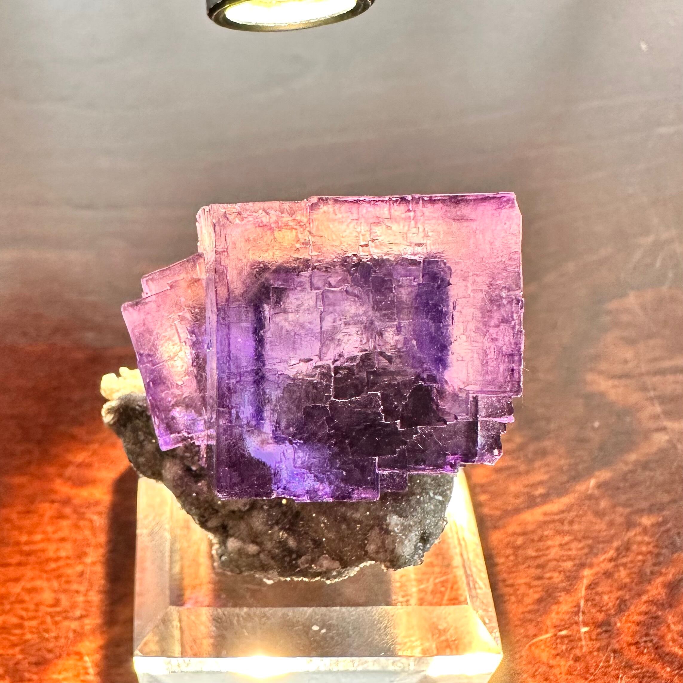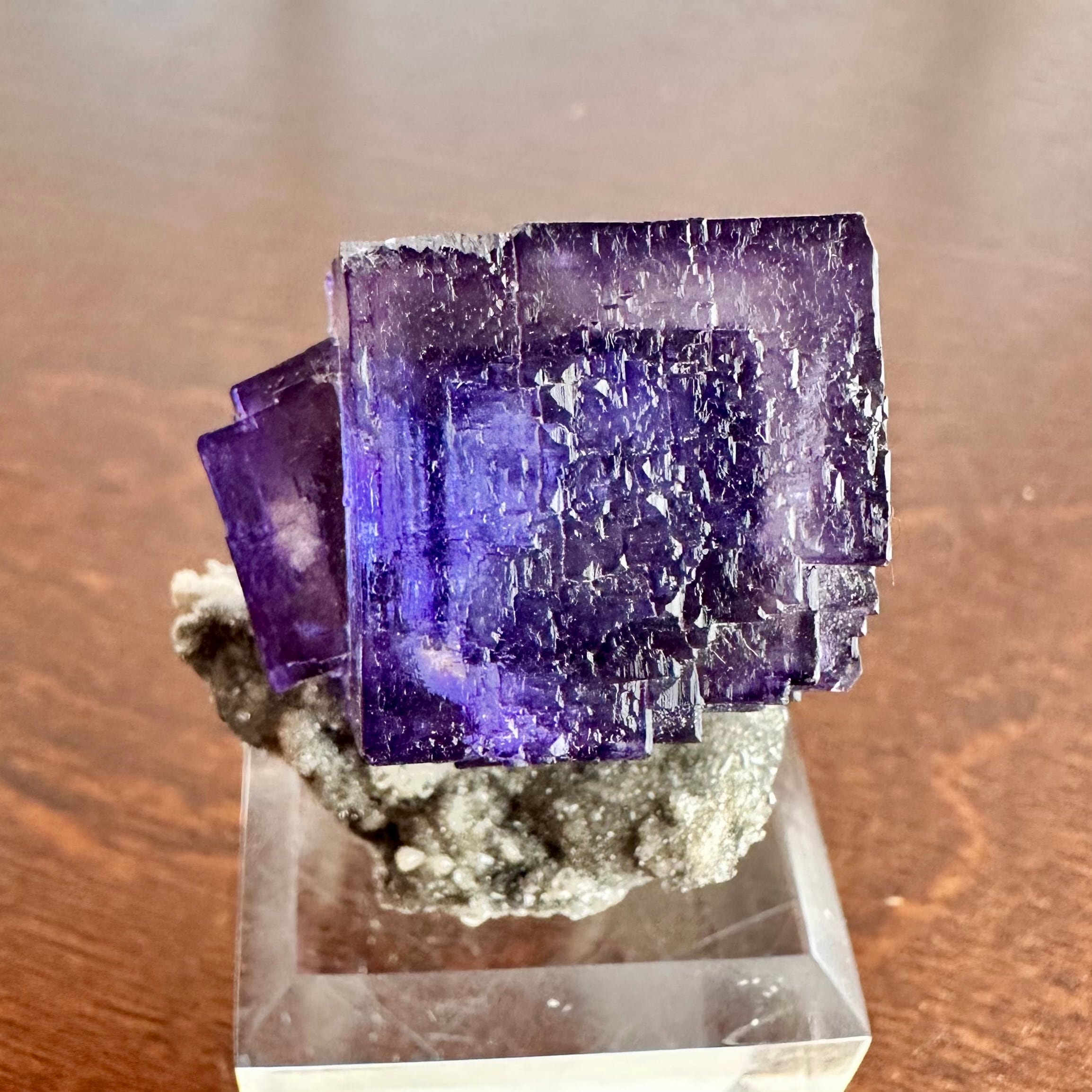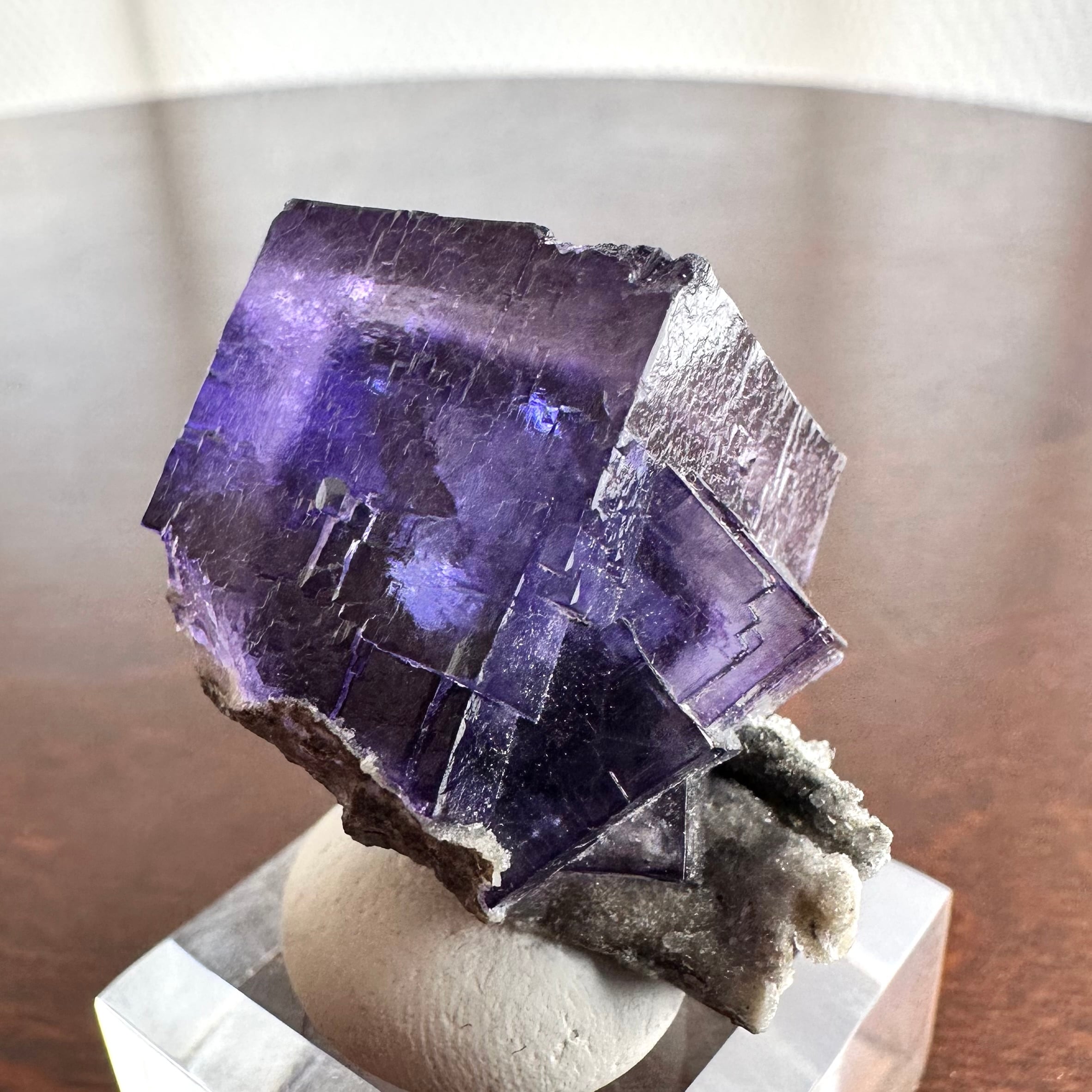 比較的流通量は多めの産地ながら、閉山した話も毎年流れつつ近年では良品が少ない中、この標本は結晶表面の凹凸の美しさや発色の良さ、何より美しいゾーニングが複数の面から見られるキューブ状の結晶のフォルムが魅力的です。